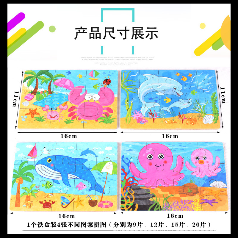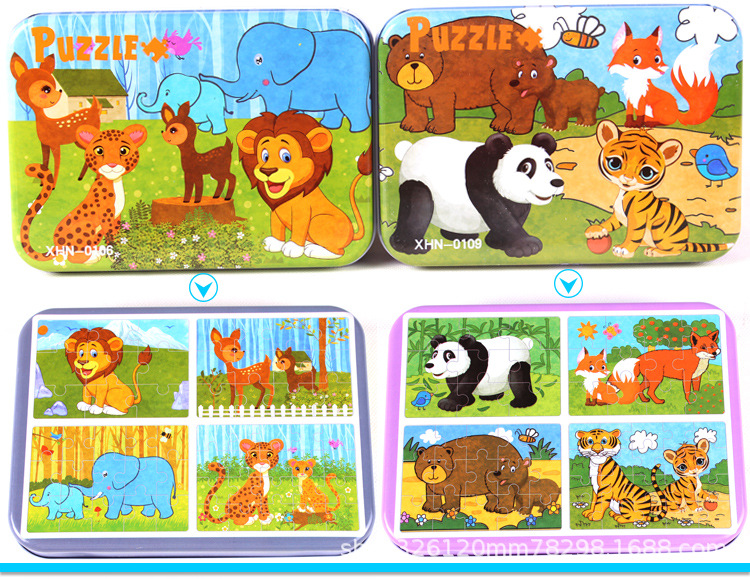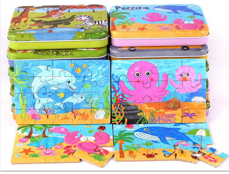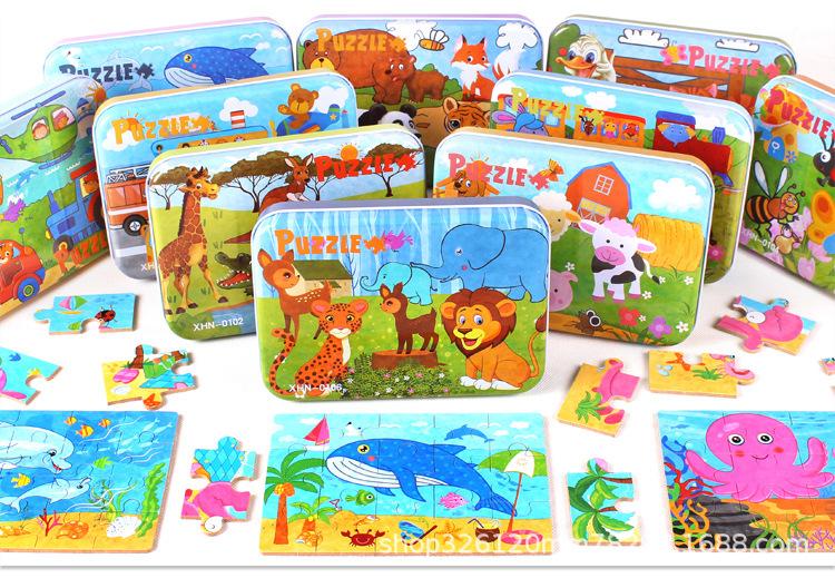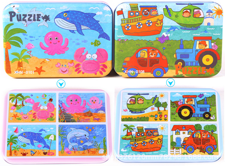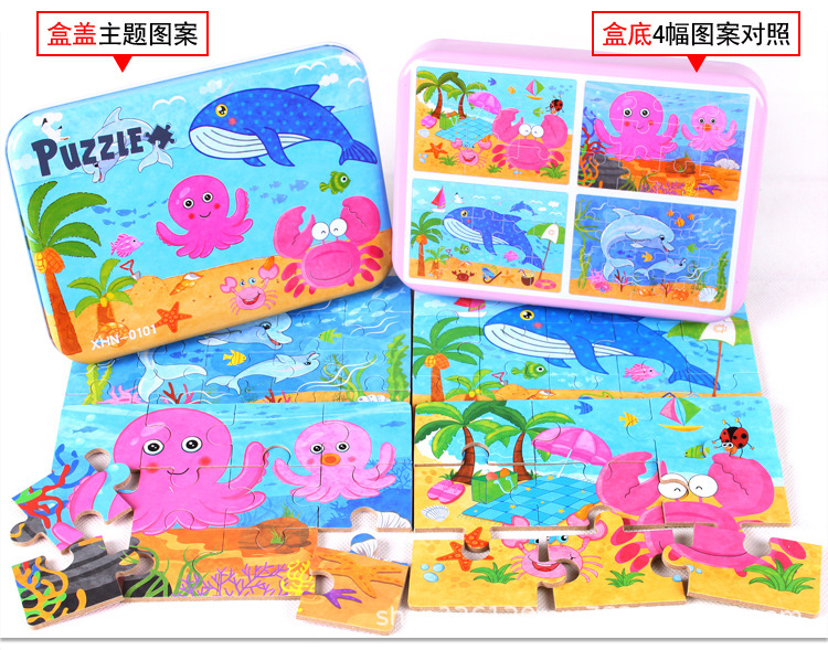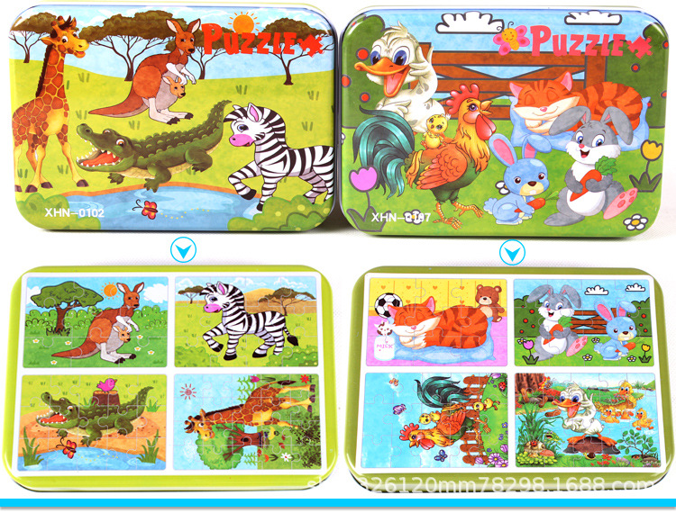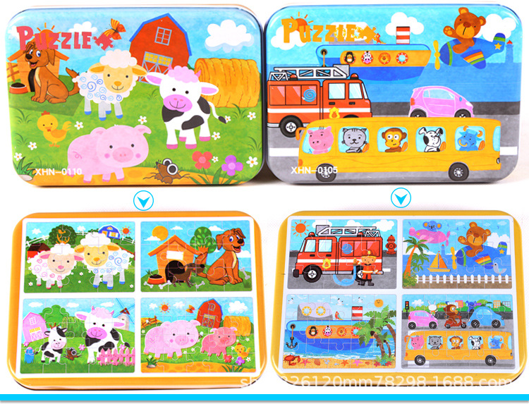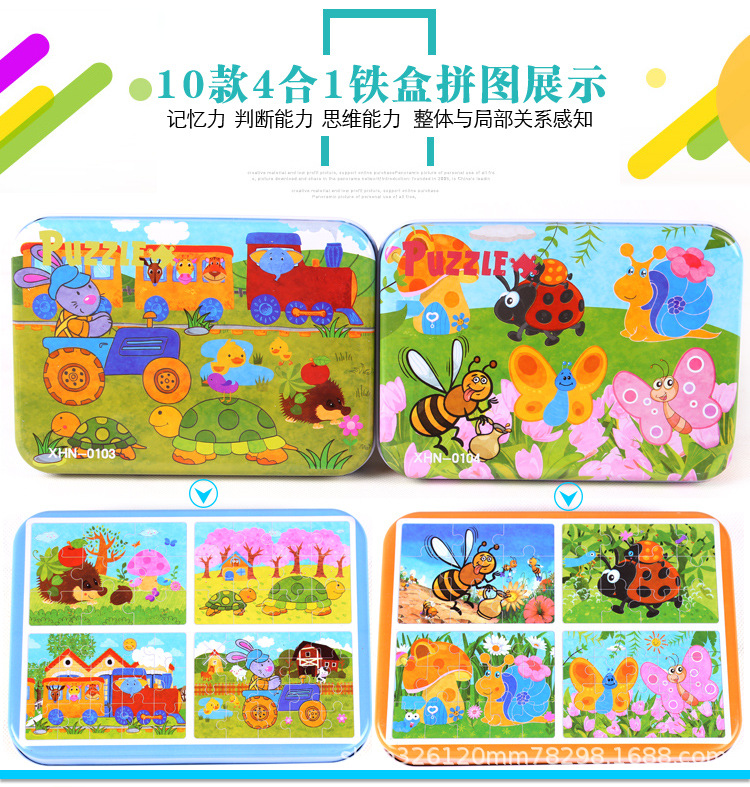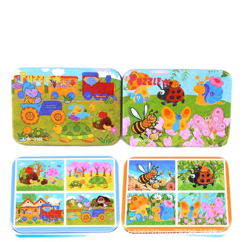 儿童铁盒拼图四合一幼儿园宝宝益智启蒙早教木制平面拼图拼板玩具