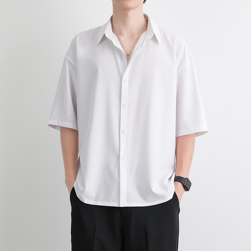 衬衫男夏季宽松薄款冰丝短袖白色五分袖衬衣青年痞帅开衫半袖上衣