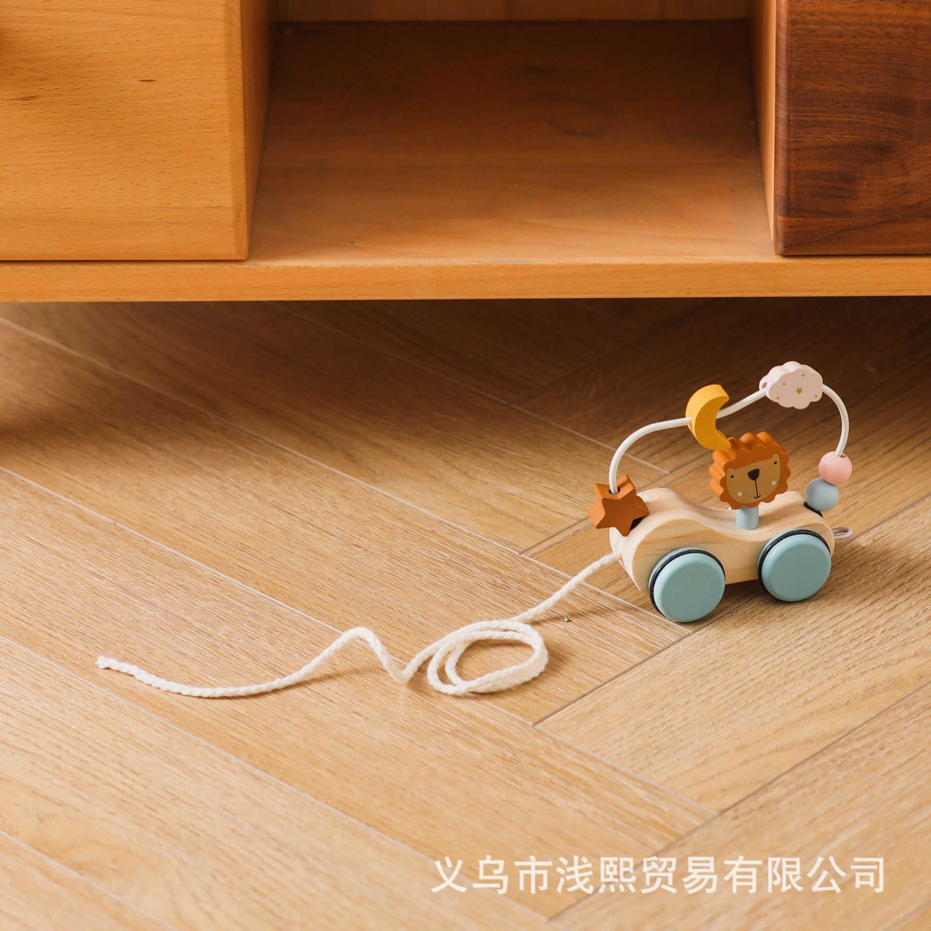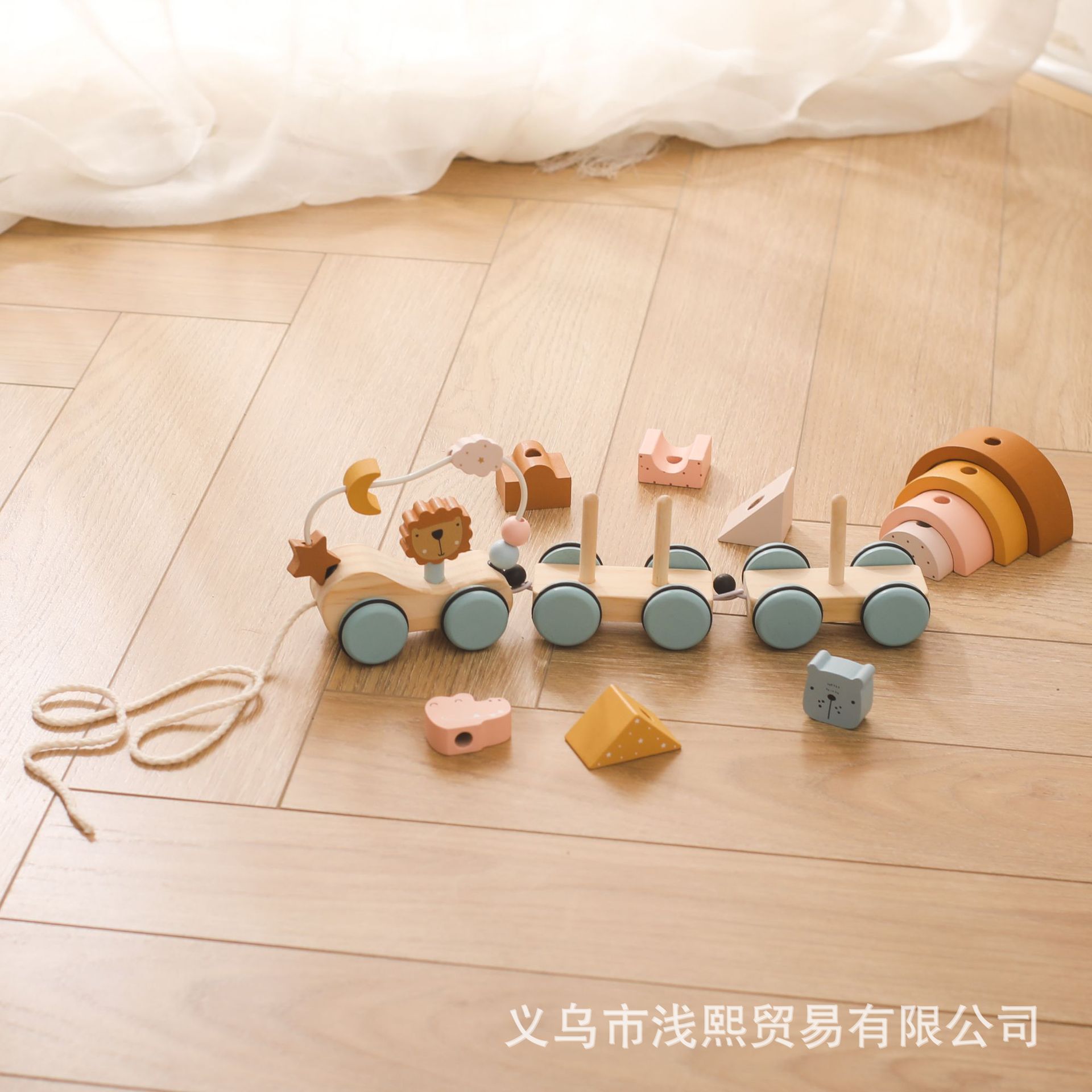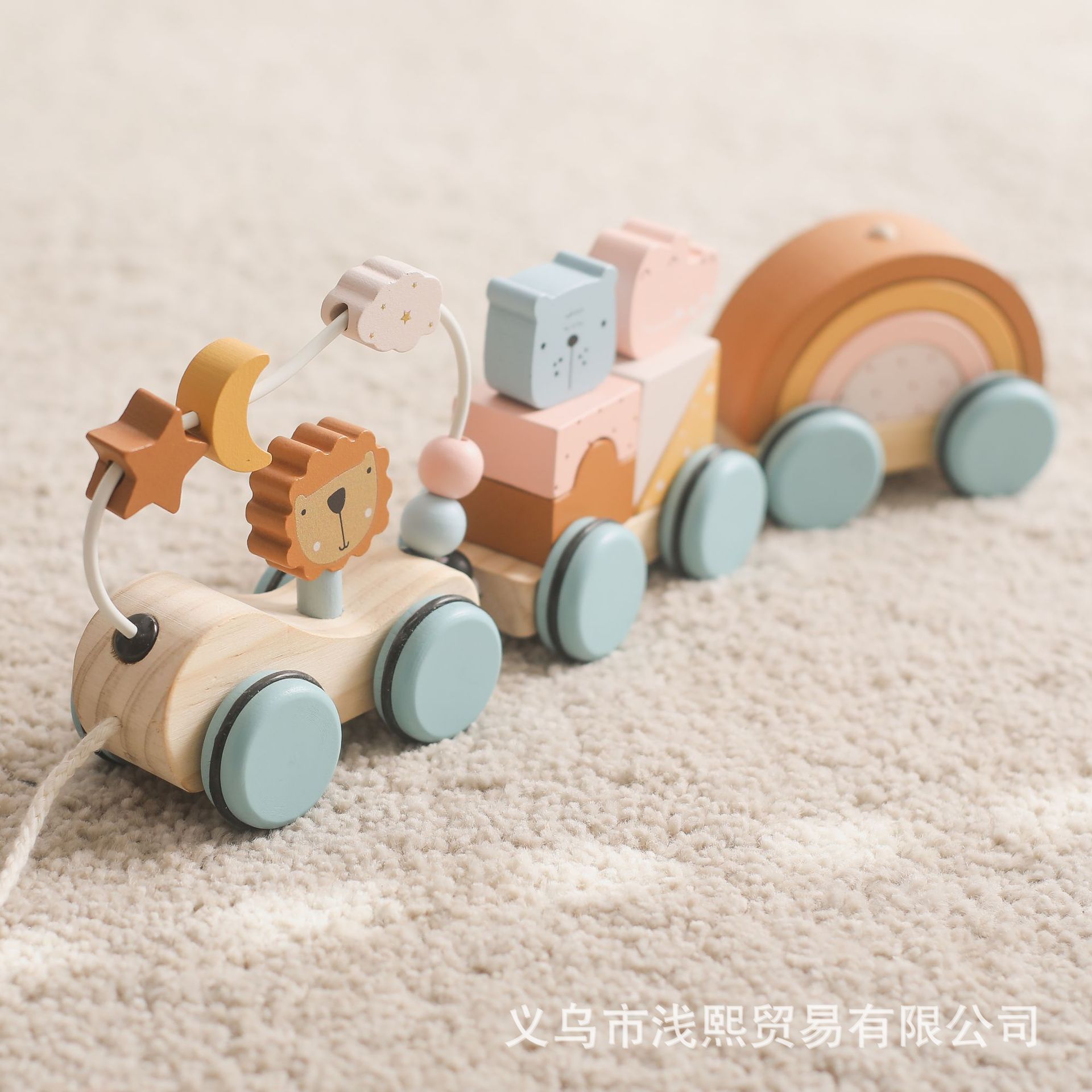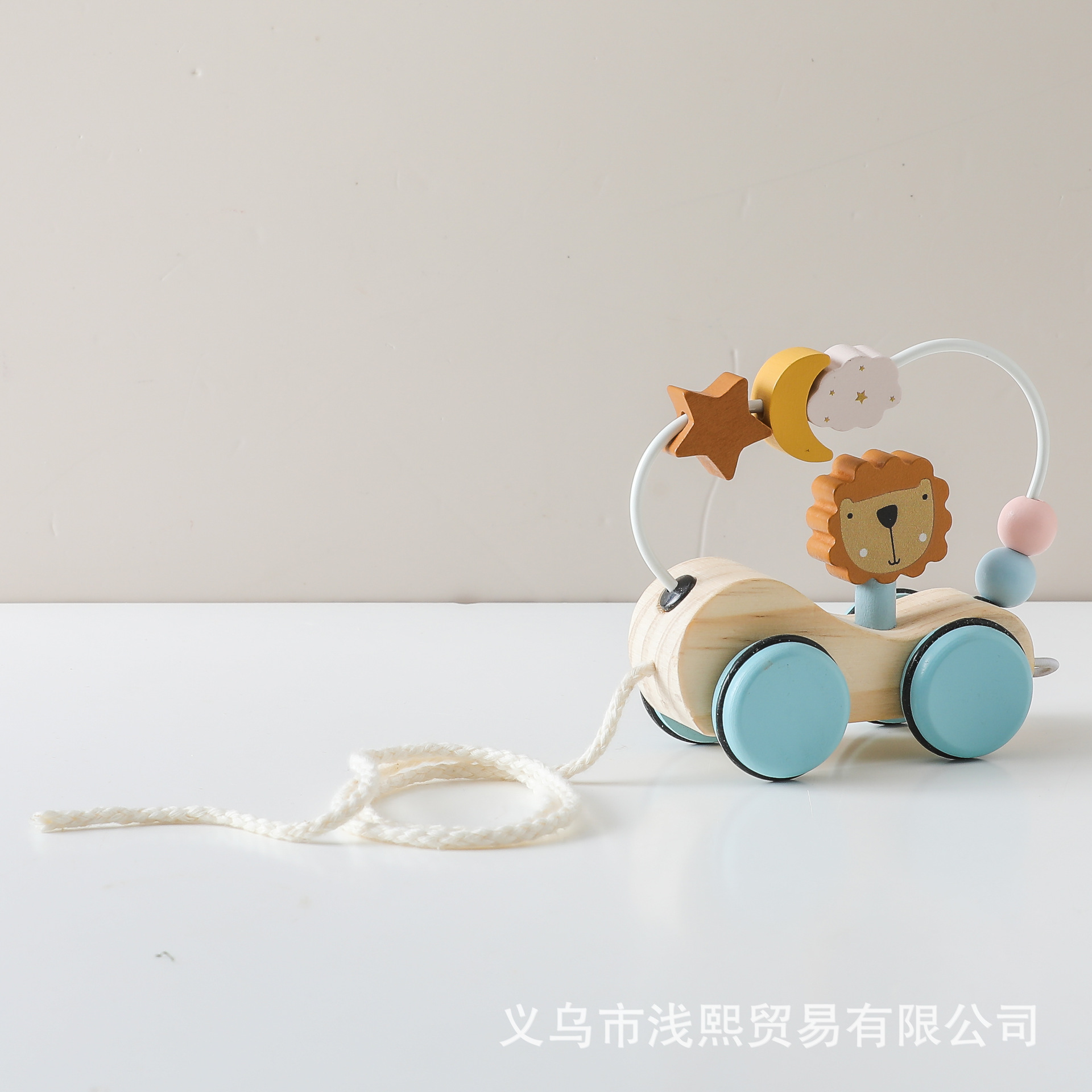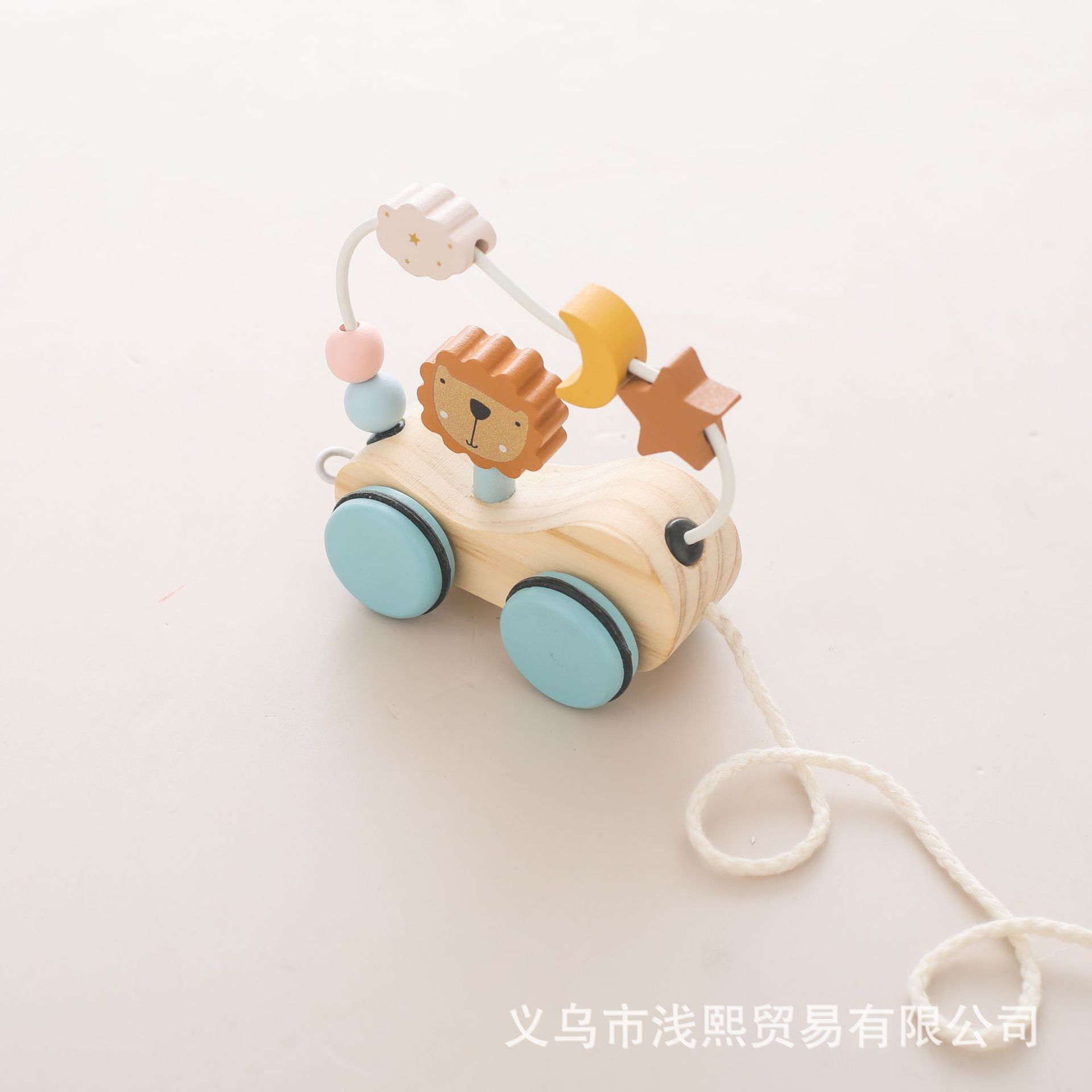儿童木质早教益智多功能小推车狮子动物绕珠拉绳车动手动脑玩具