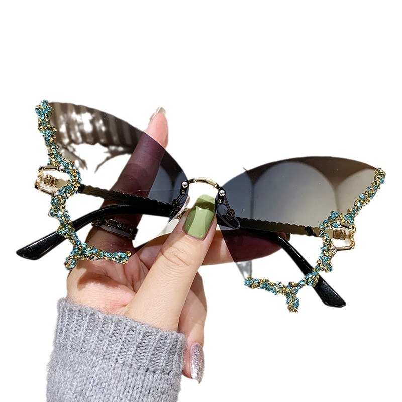 跨境新款蝴蝶形状镶钻无框太阳镜女时尚个性夸张墨镜欧美网红碎钻