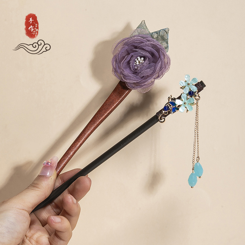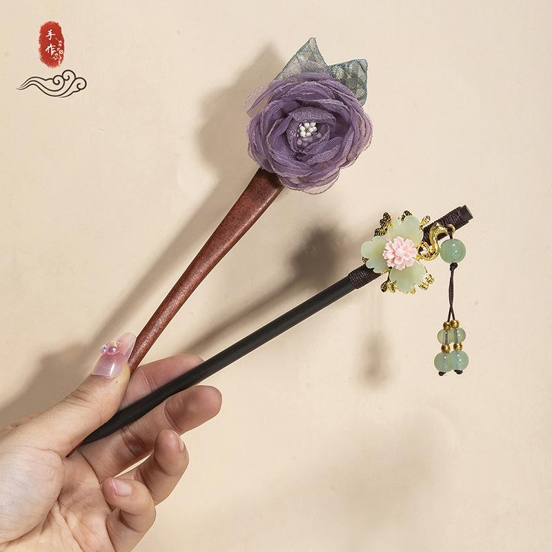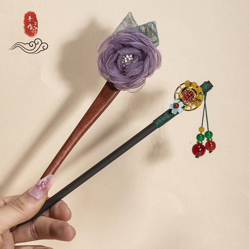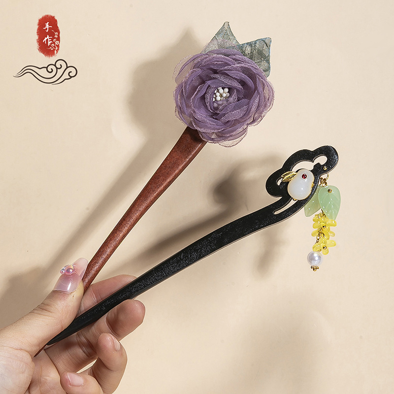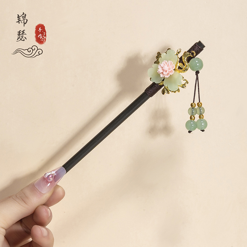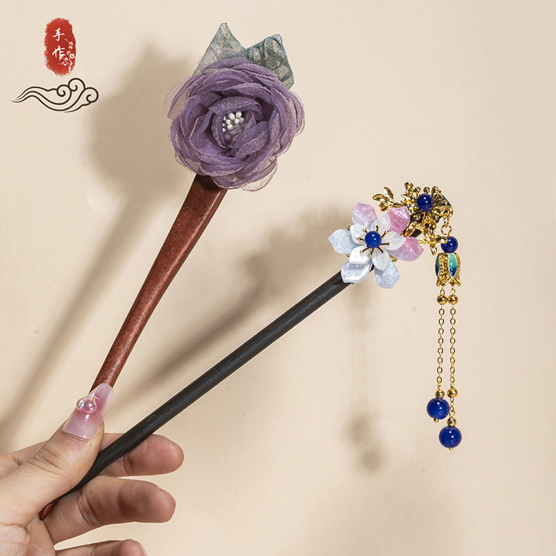 银莲花流苏木发簪新中式缠花工艺汉服配饰旗袍盘发步摇发钗丸子头