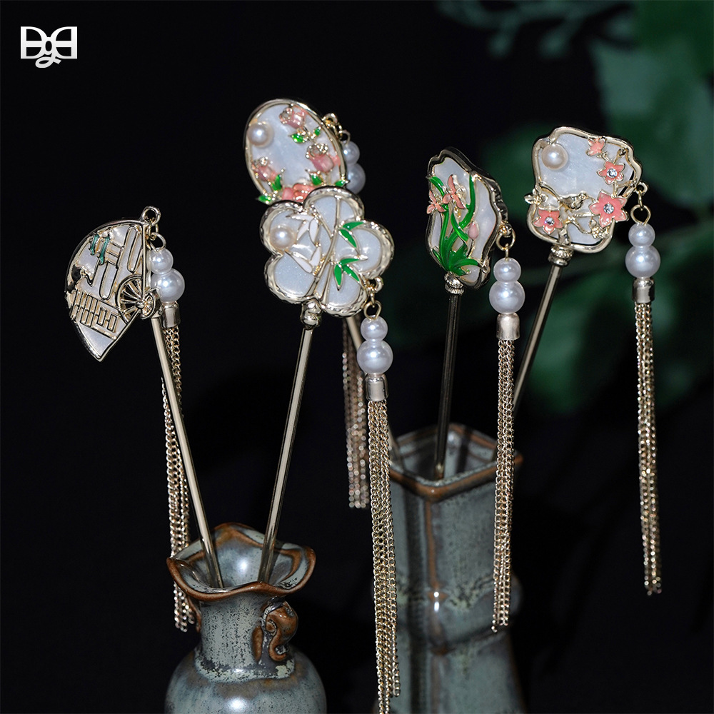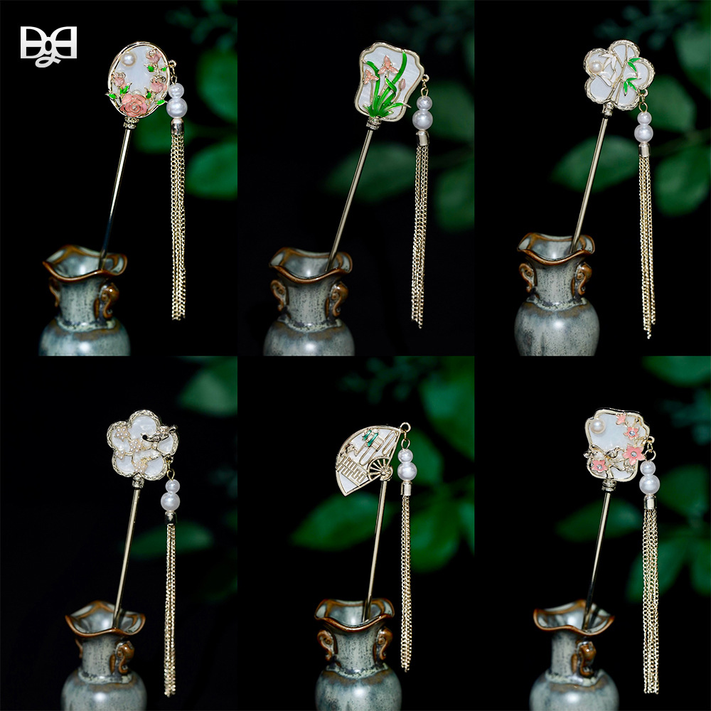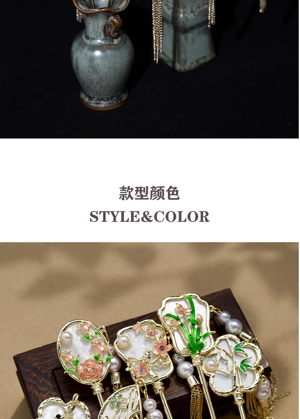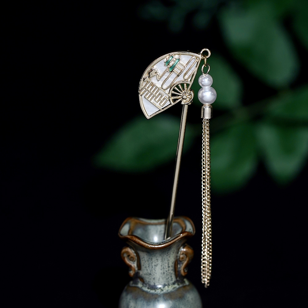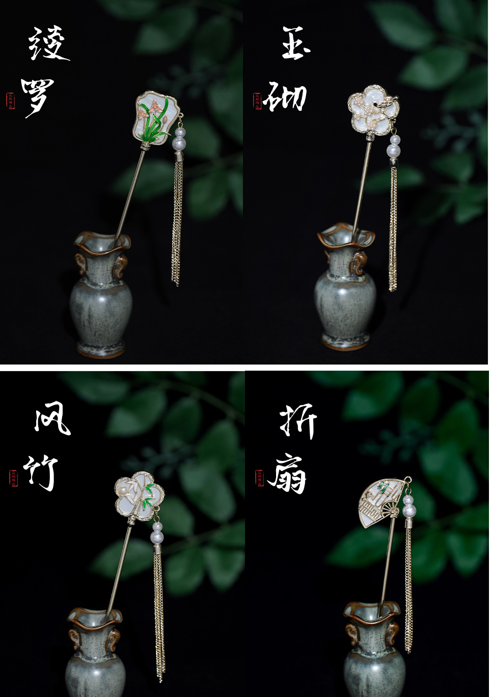优雅发簪新中式簪子步摇琉璃盘发流苏发饰汉服古风发钗扇子头饰女