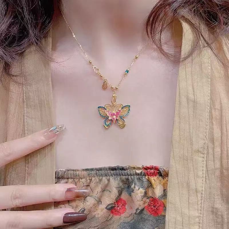 民族风蝴蝶项链女2025新款彩色国风吊坠国潮复古百搭精致项链