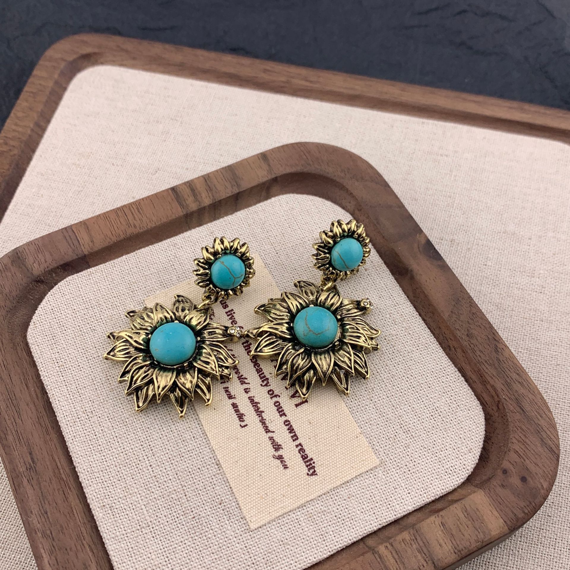 Vintage复古太阳花造型耳环女宫廷风做旧绿松石耳饰高级百搭