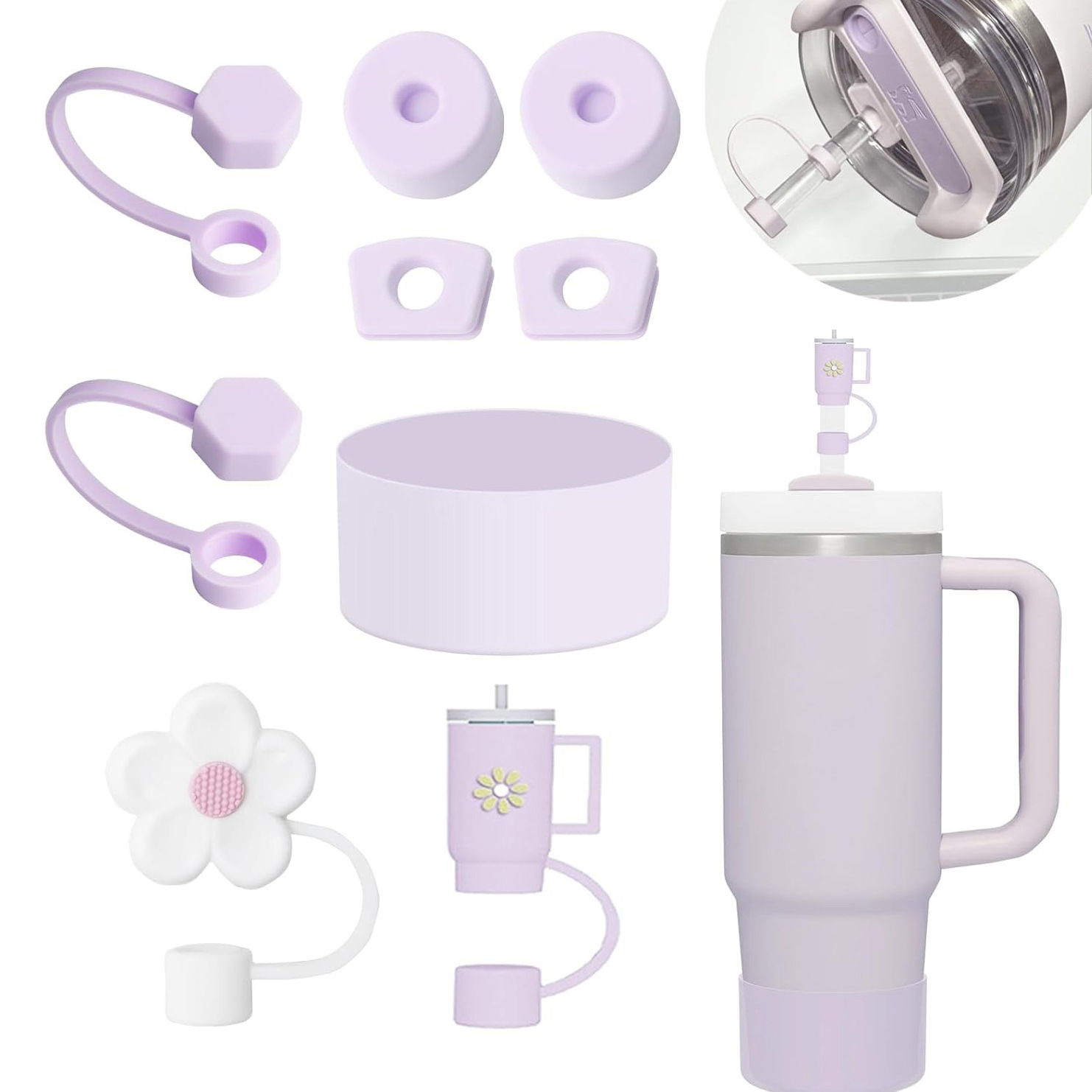 跨境紫色花朵彩虹云吸管帽防漏塞可重复使用硅胶被套史丹利杯配件