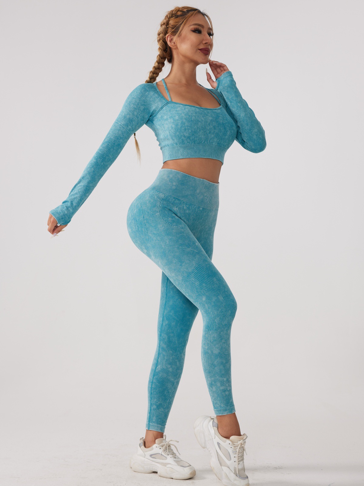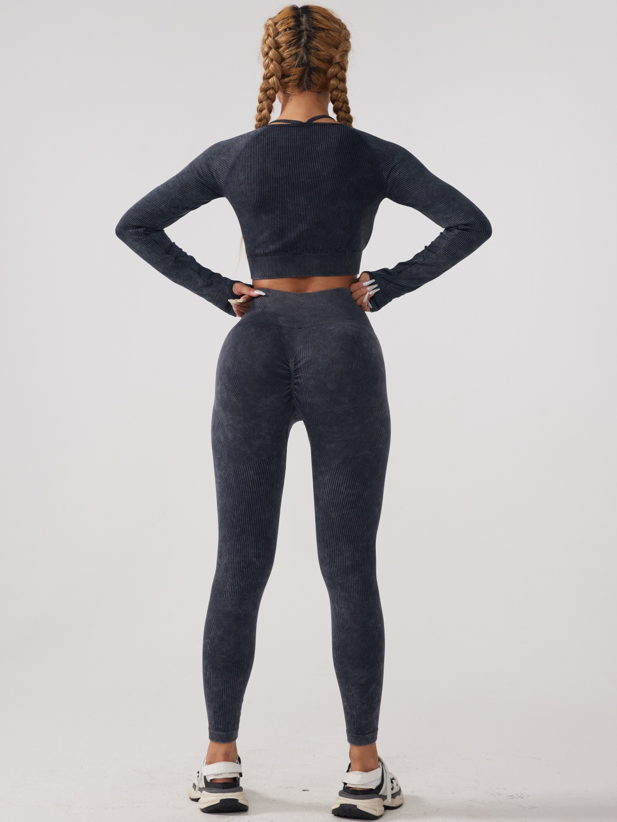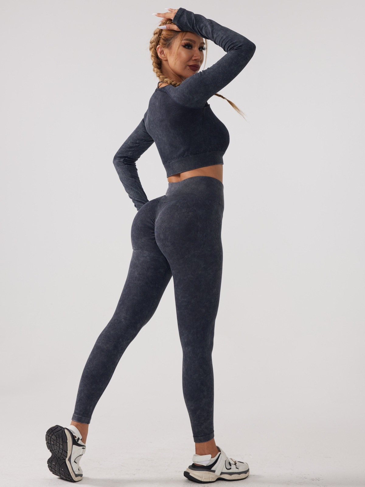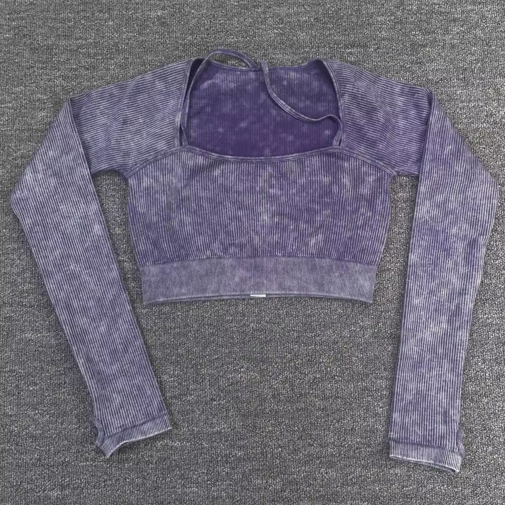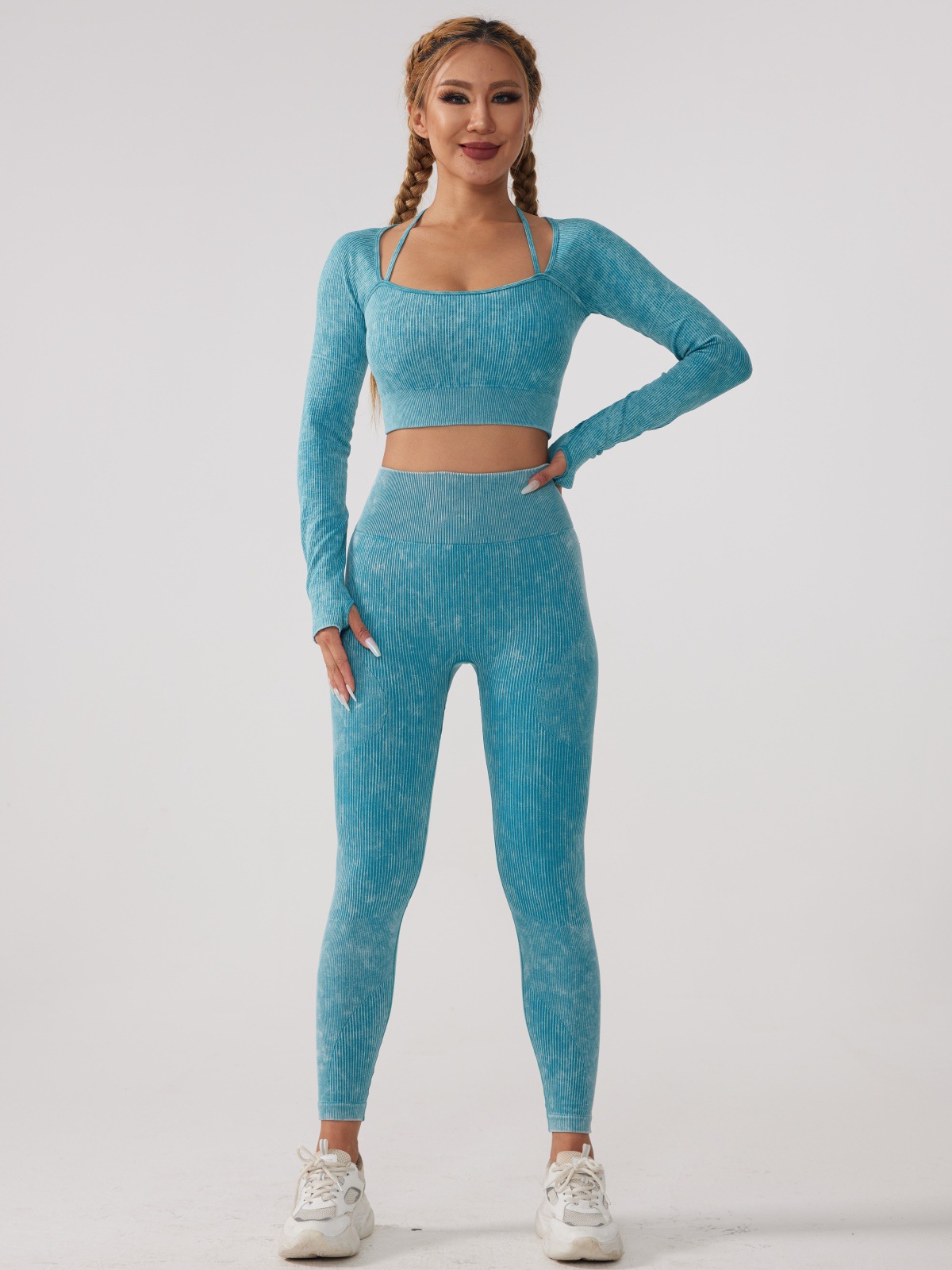 欧美跨境砂洗无缝螺纹性感长袖文胸上衣提臀短裤运动瑜伽裤套装女