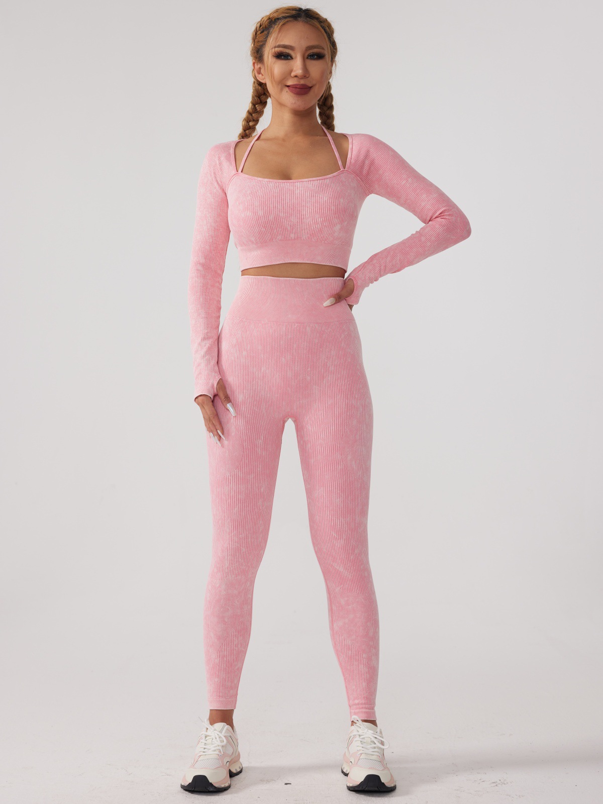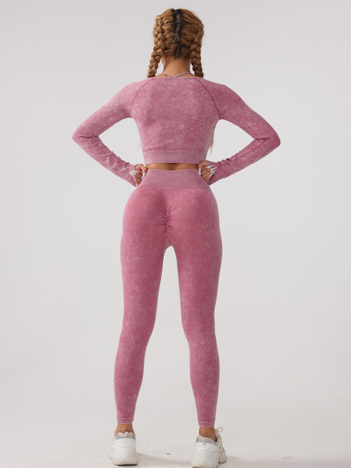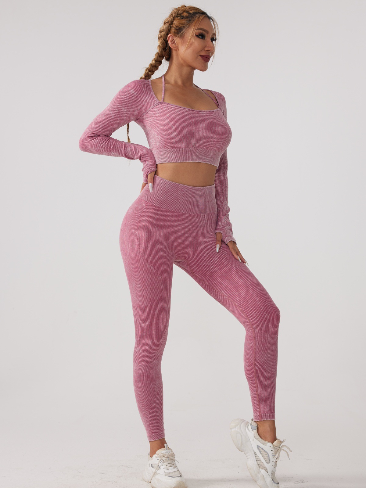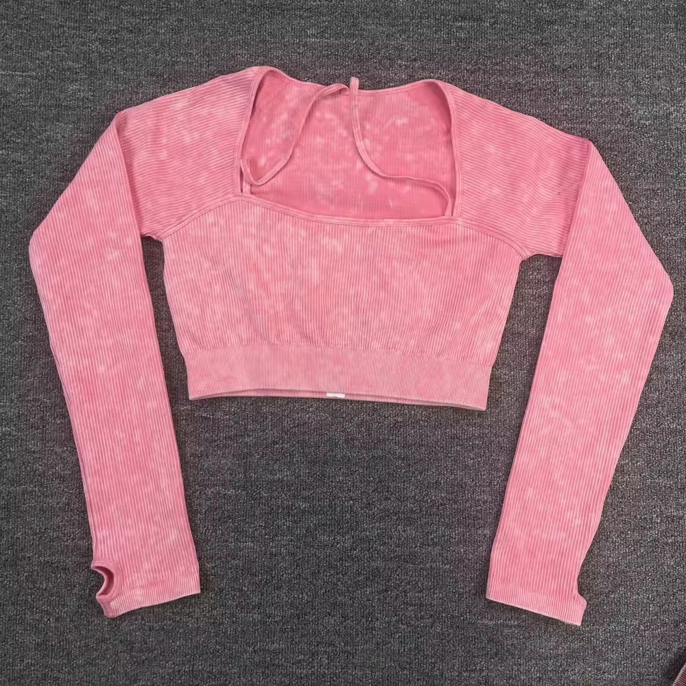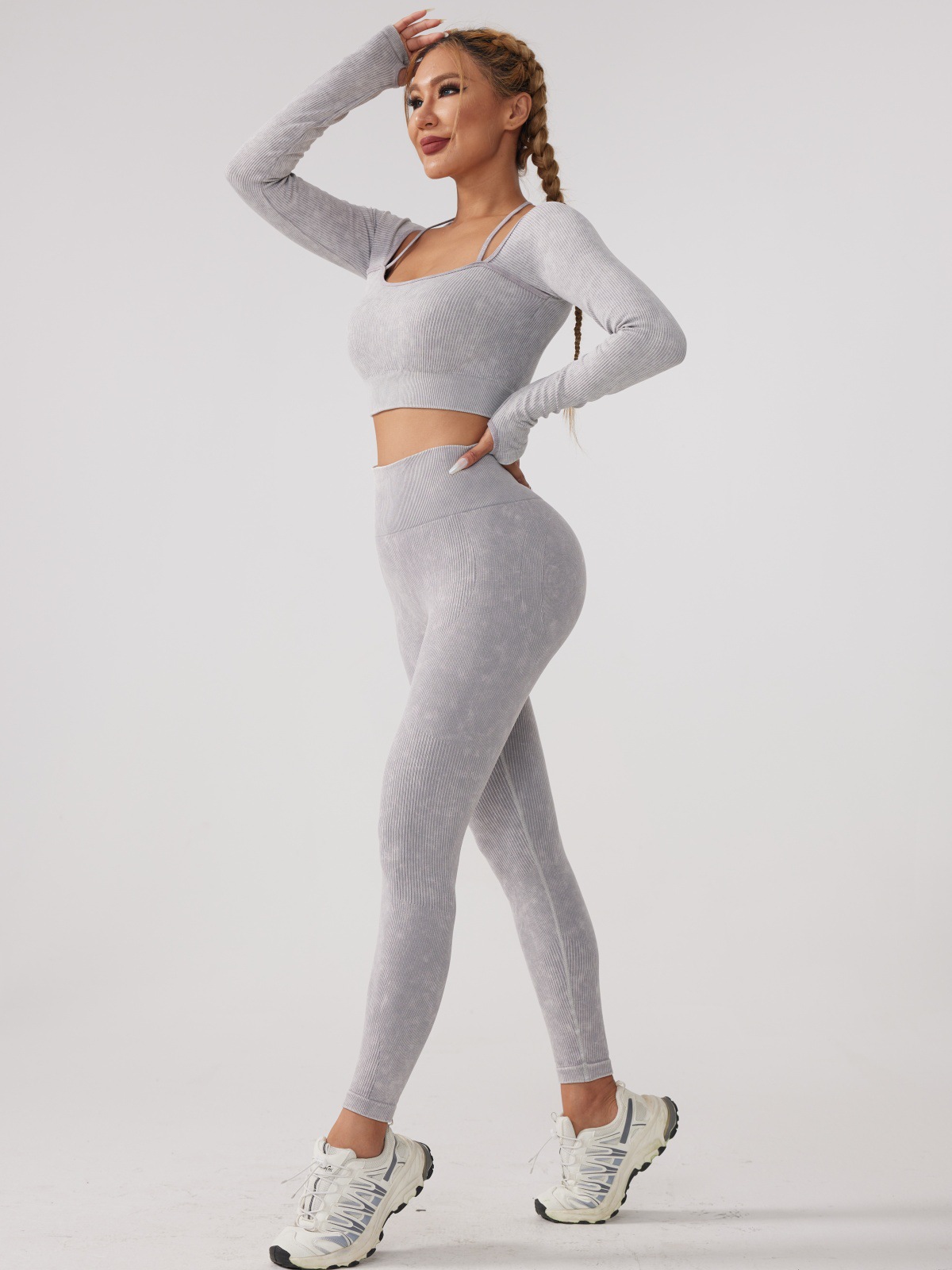 欧美跨境砂洗无缝螺纹性感长袖文胸上衣提臀短裤运动瑜伽裤套装女