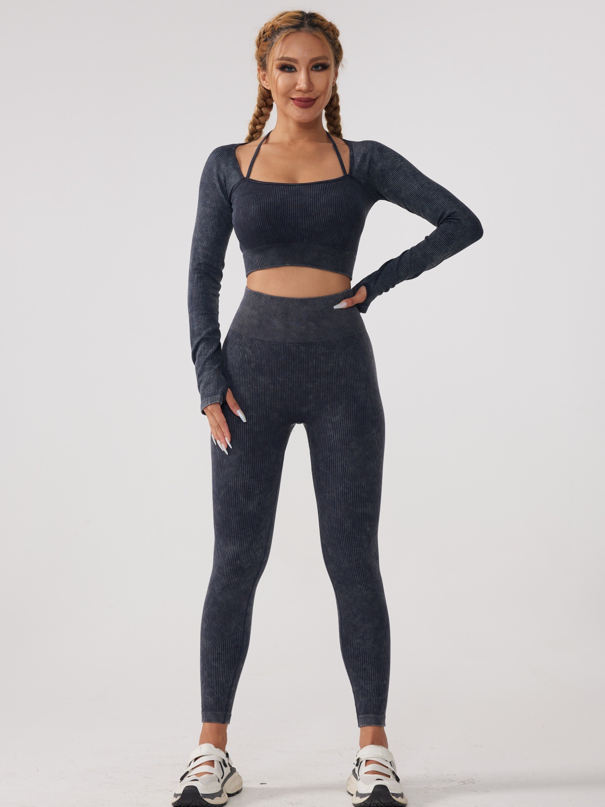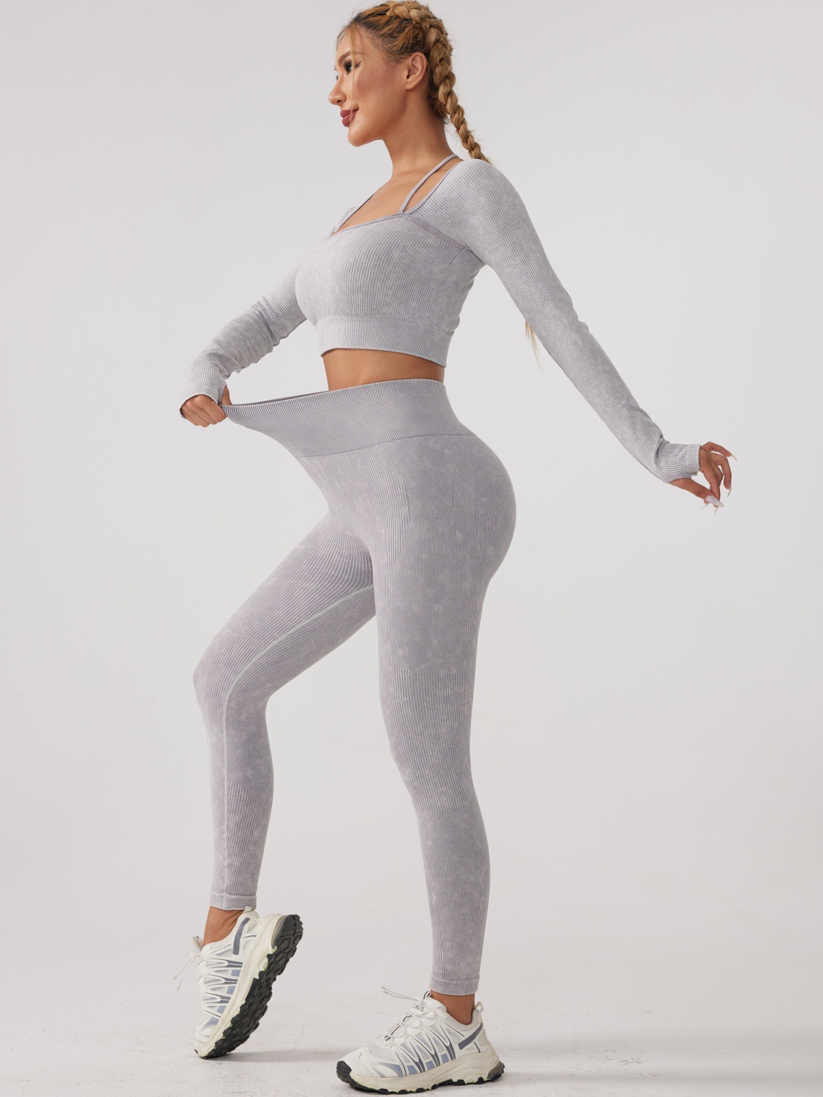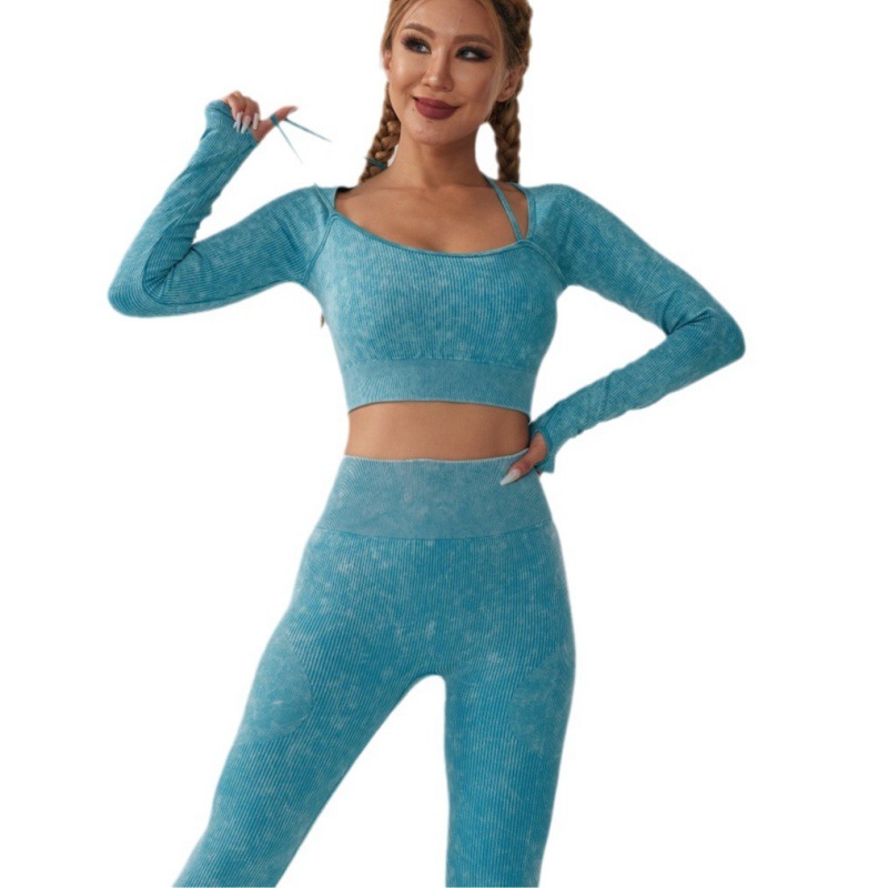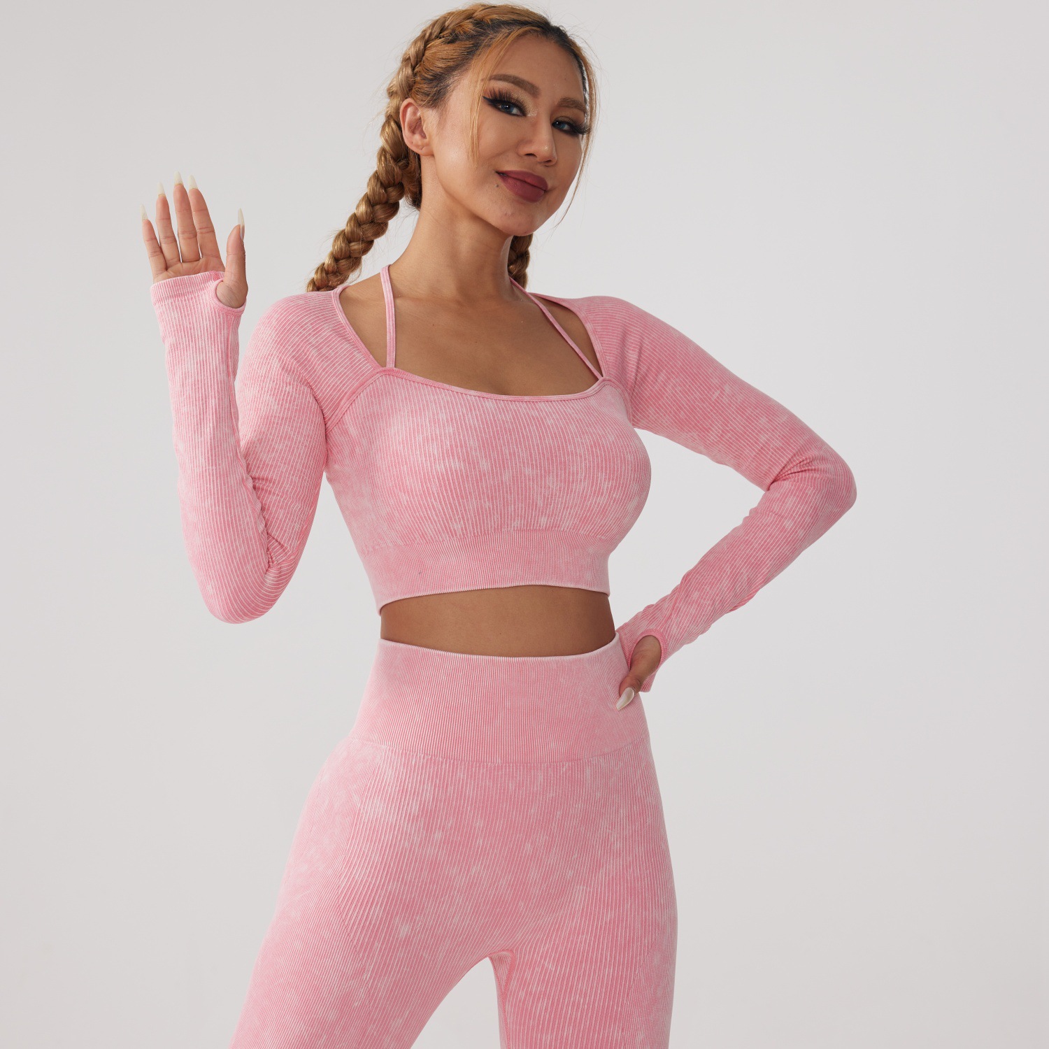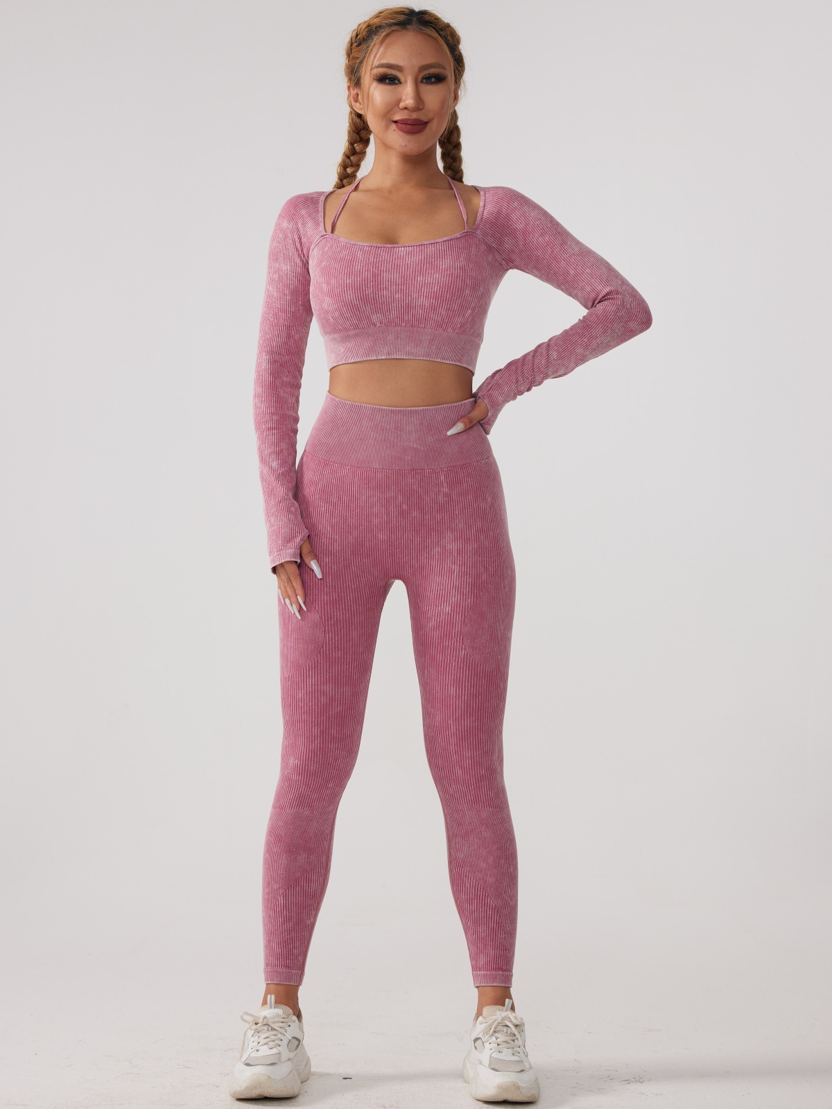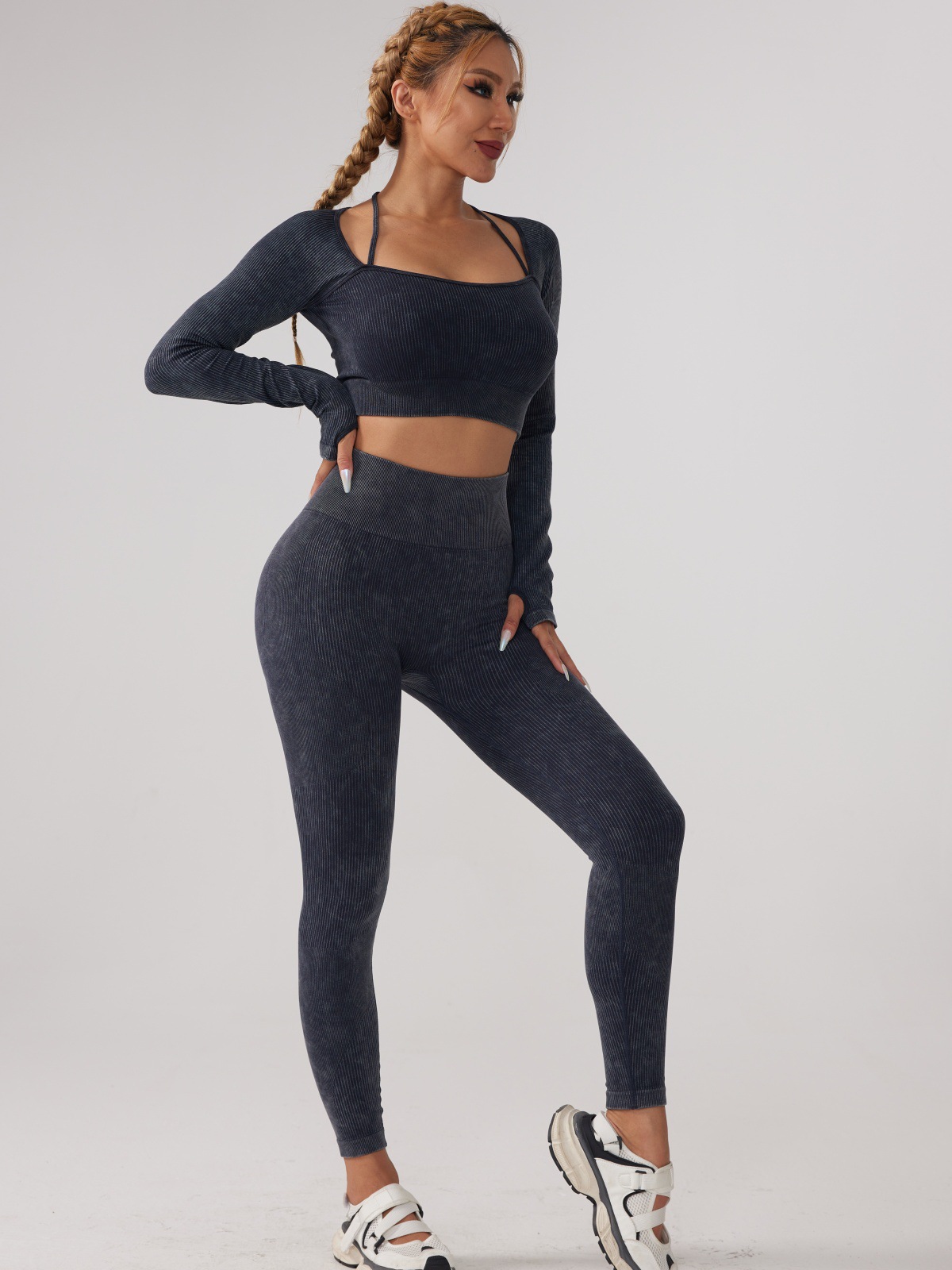 欧美跨境新款无缝针织瑜伽服套装螺纹透气运动上衣长裤健身服套装