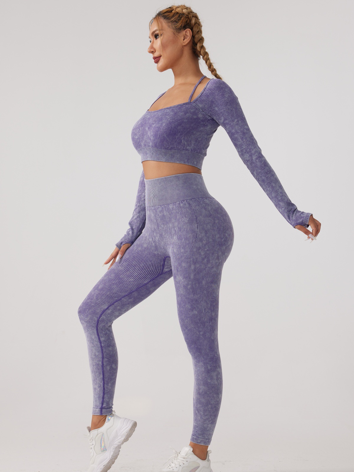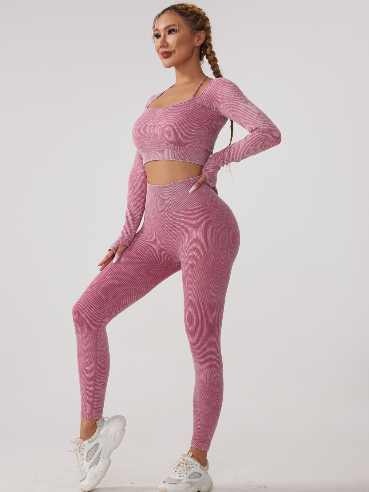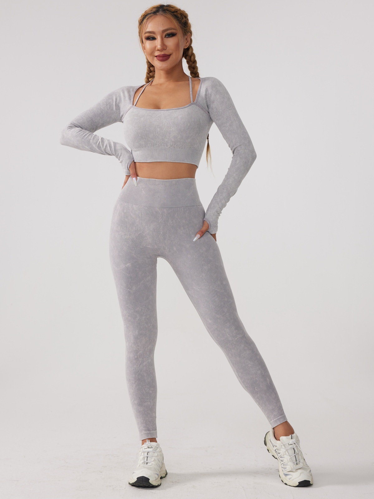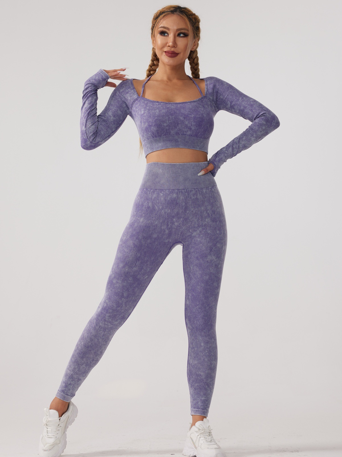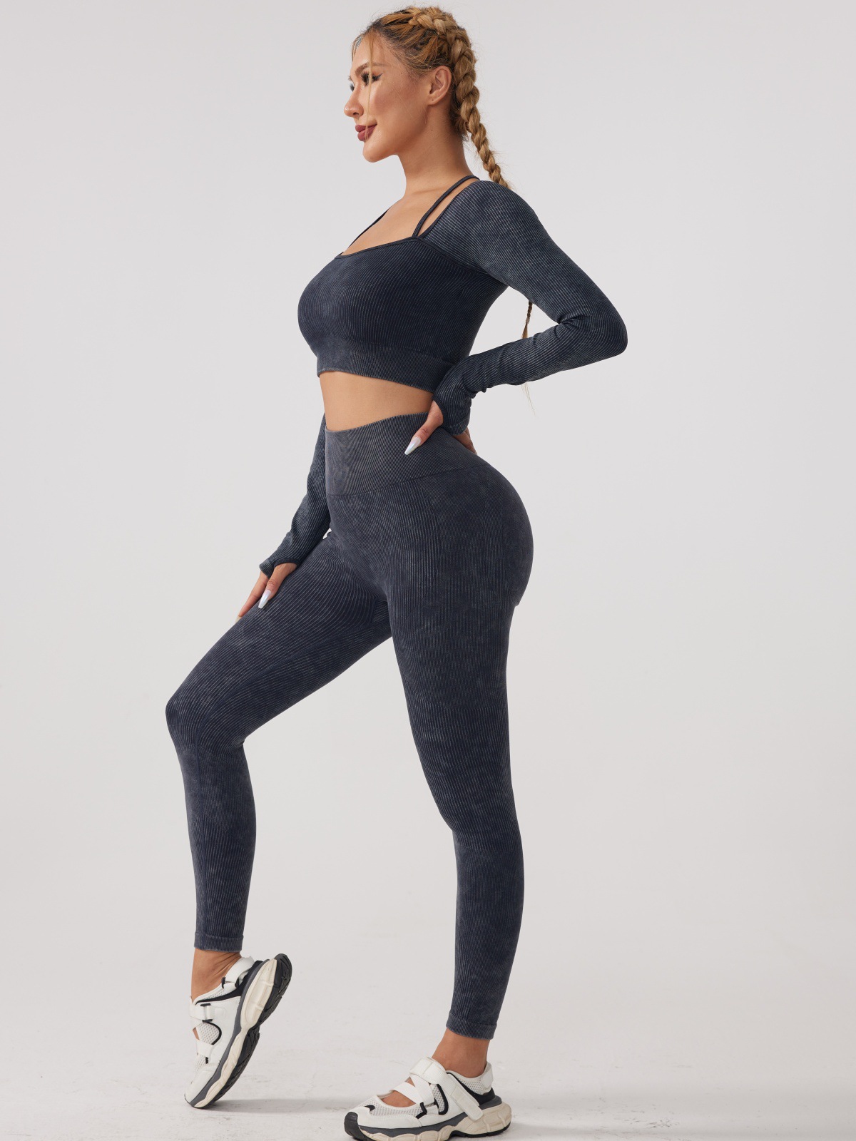 欧美跨境新款无缝针织瑜伽服套装螺纹透气运动上衣长裤健身服套装