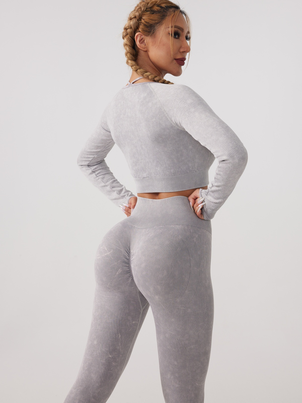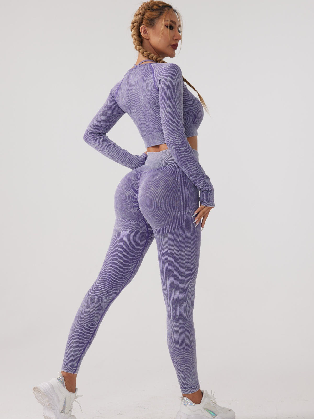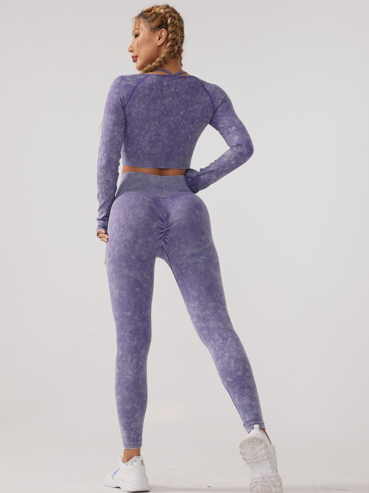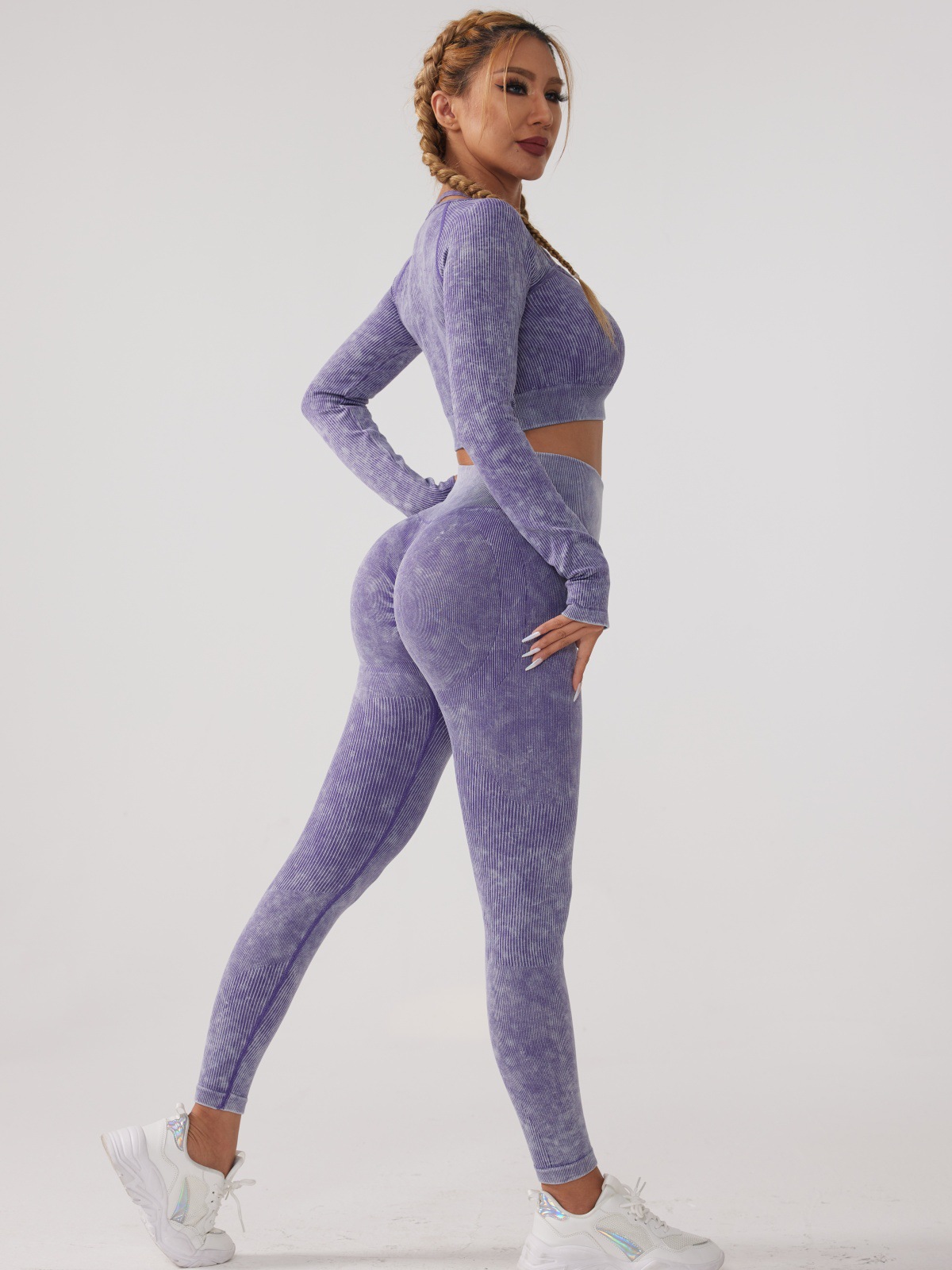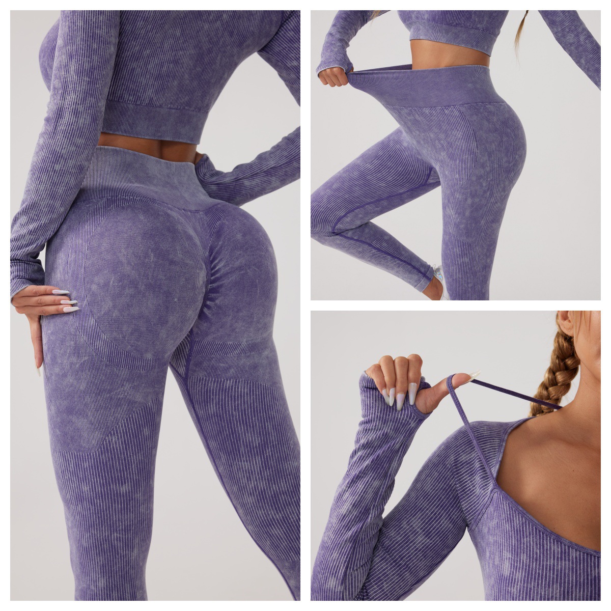 欧美跨境新款无缝针织瑜伽服套装螺纹透气运动上衣长裤健身服套装