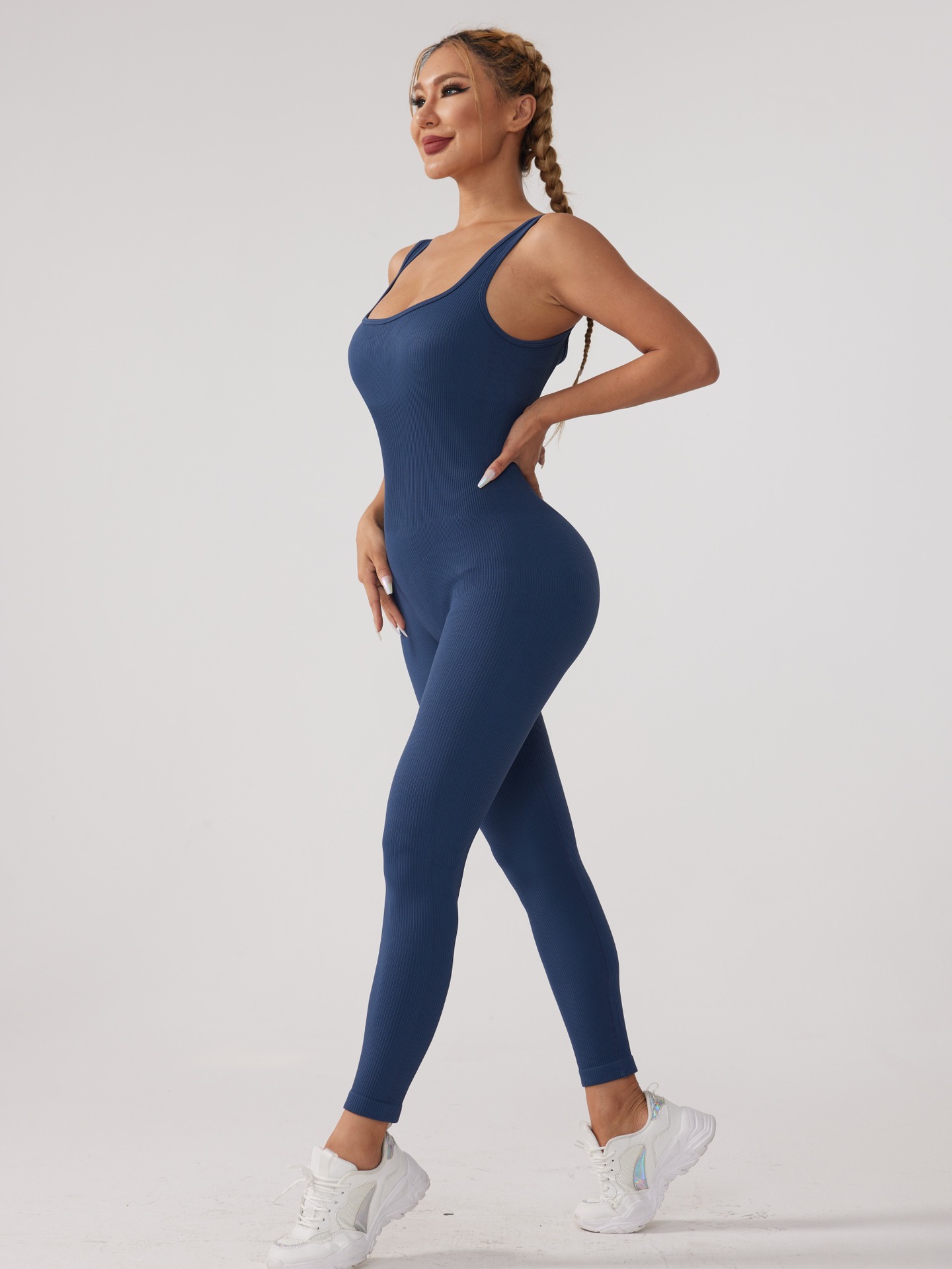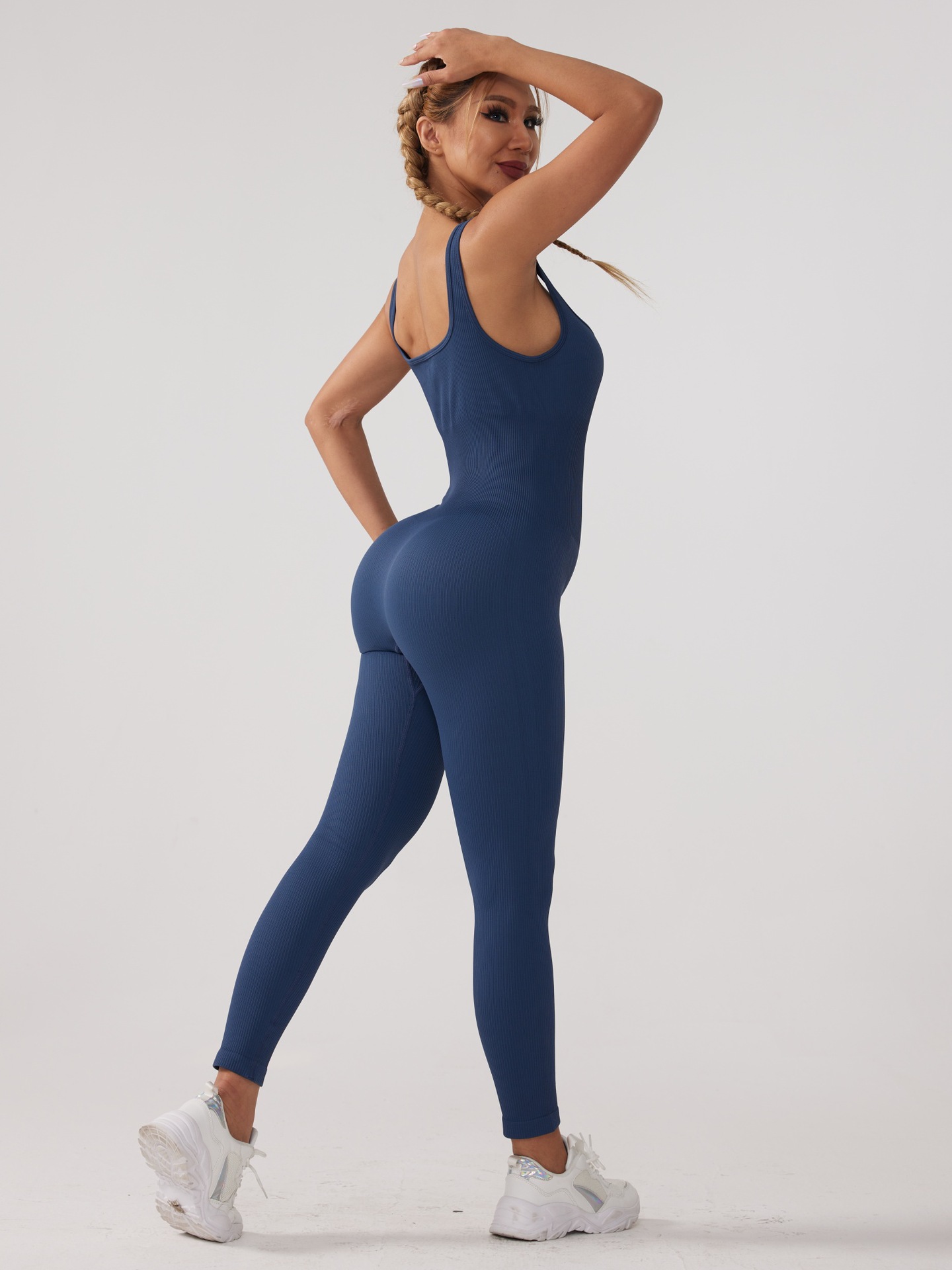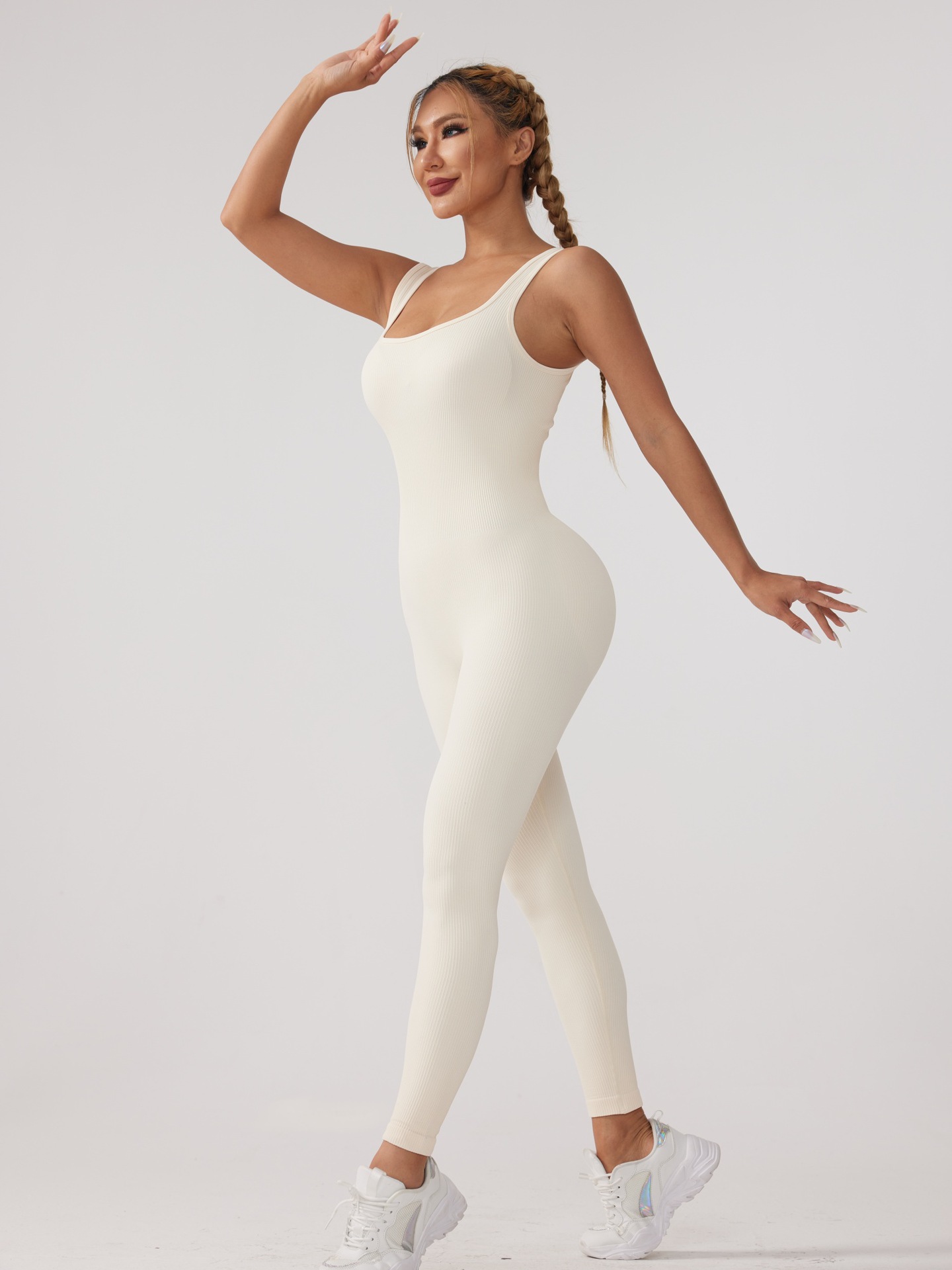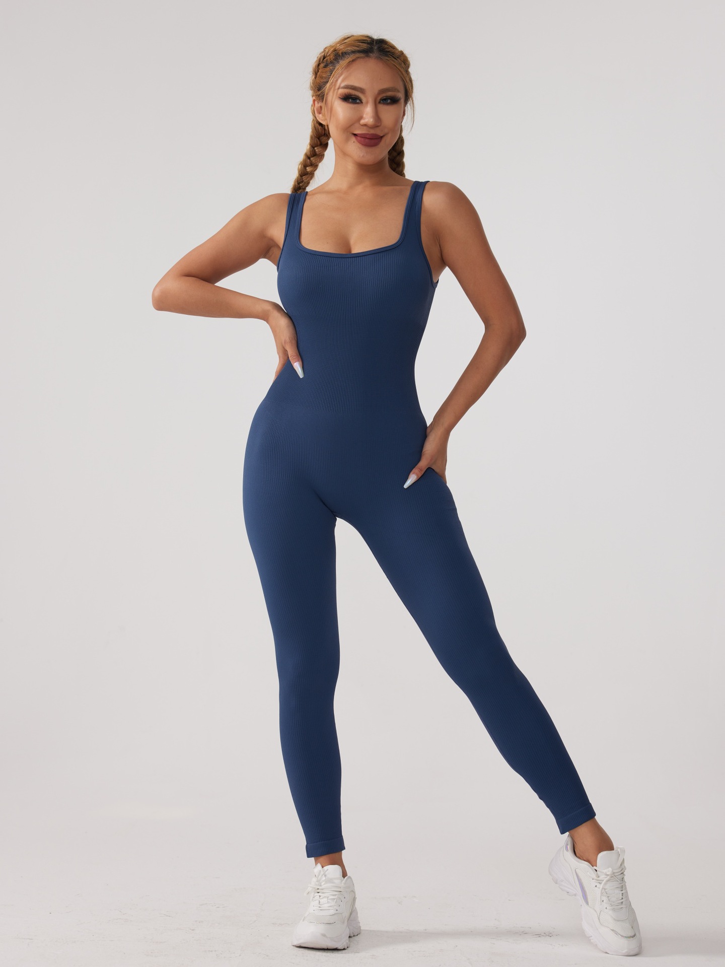 跨境无缝针织螺纹纯色紧身平领连体衣运动跑步健身瑜伽服连体套装