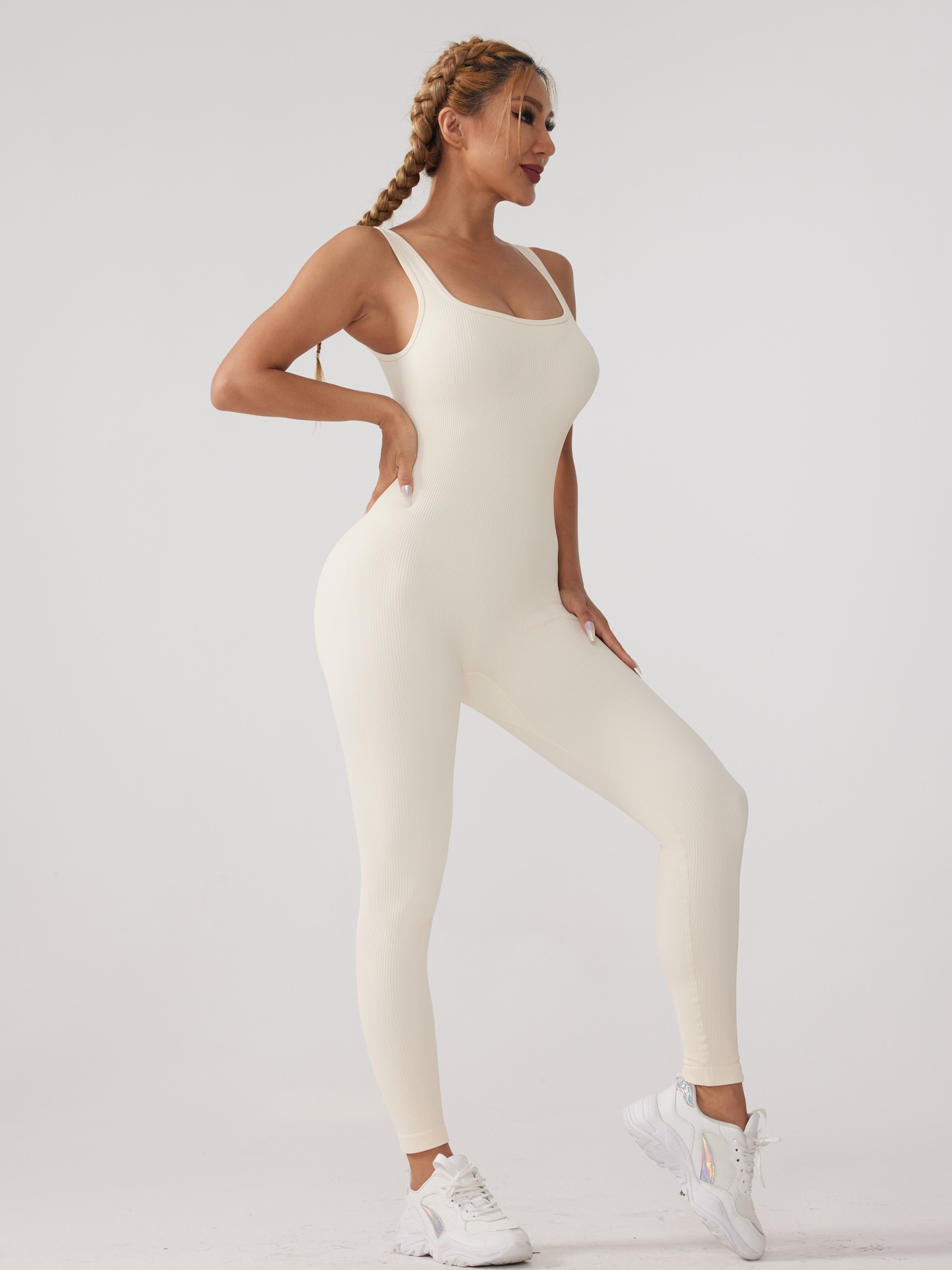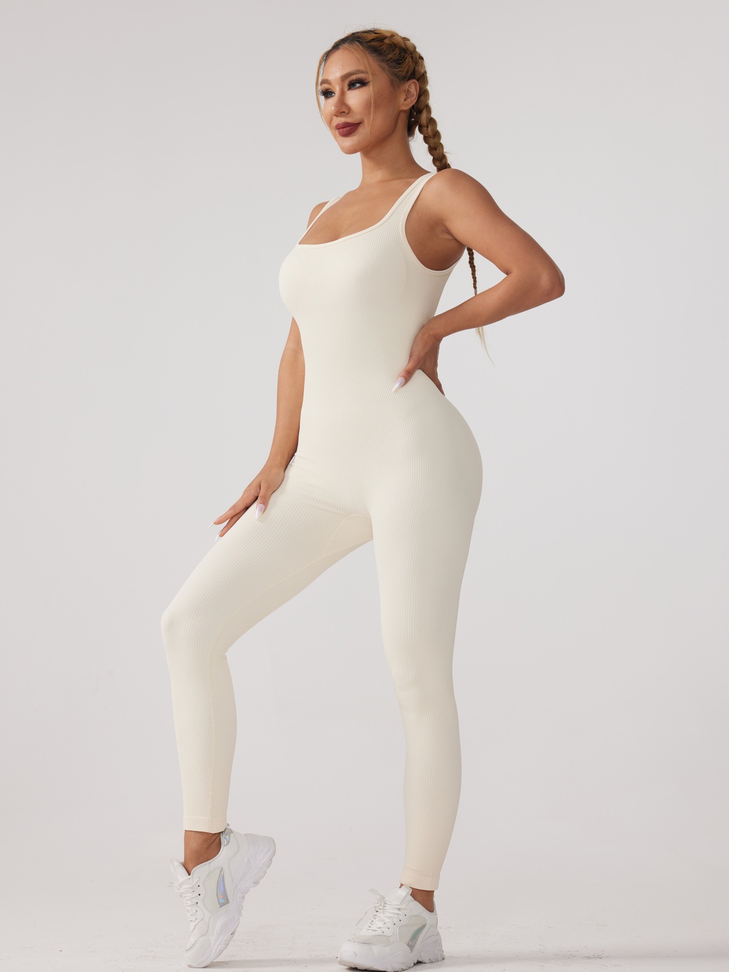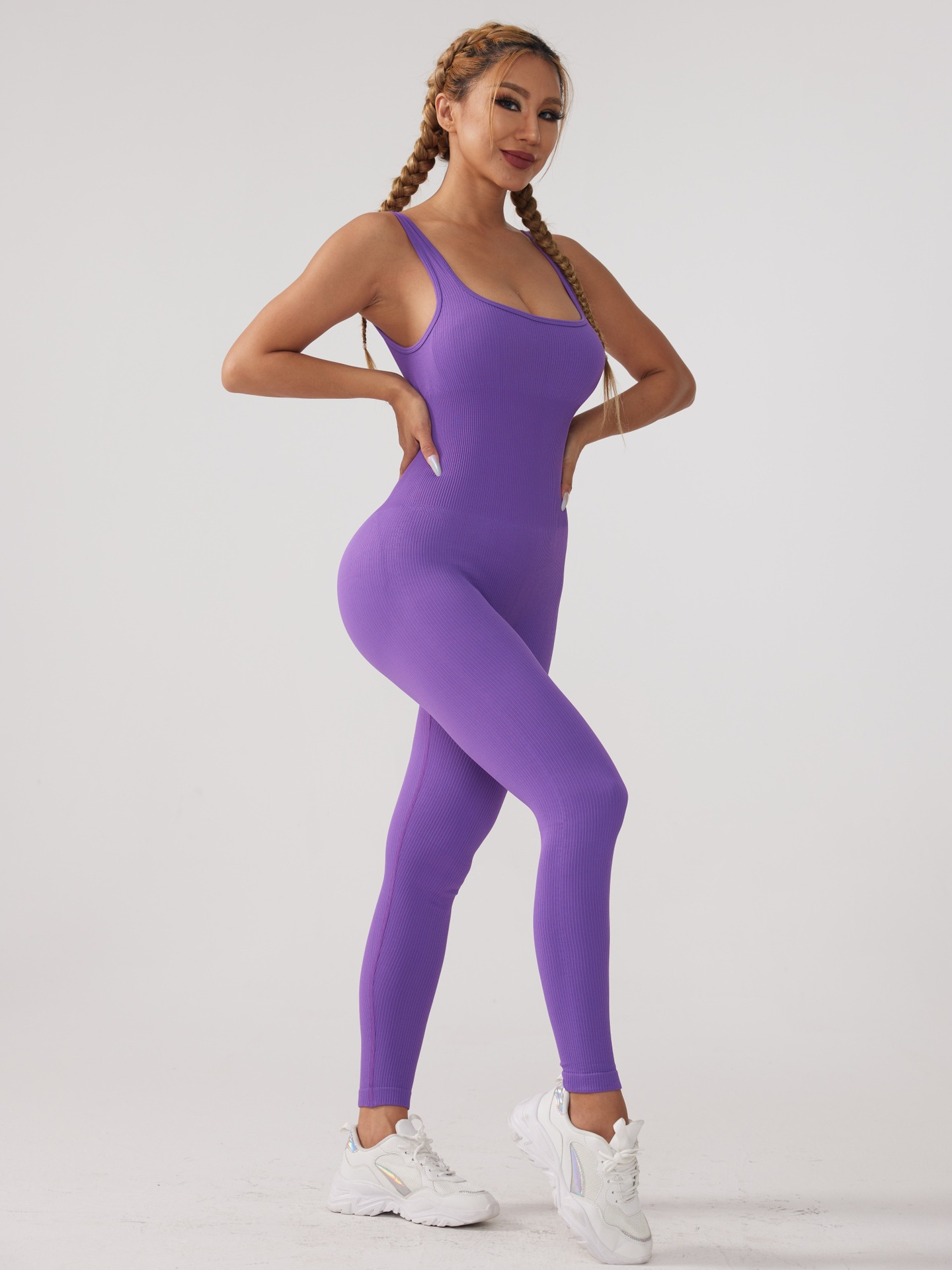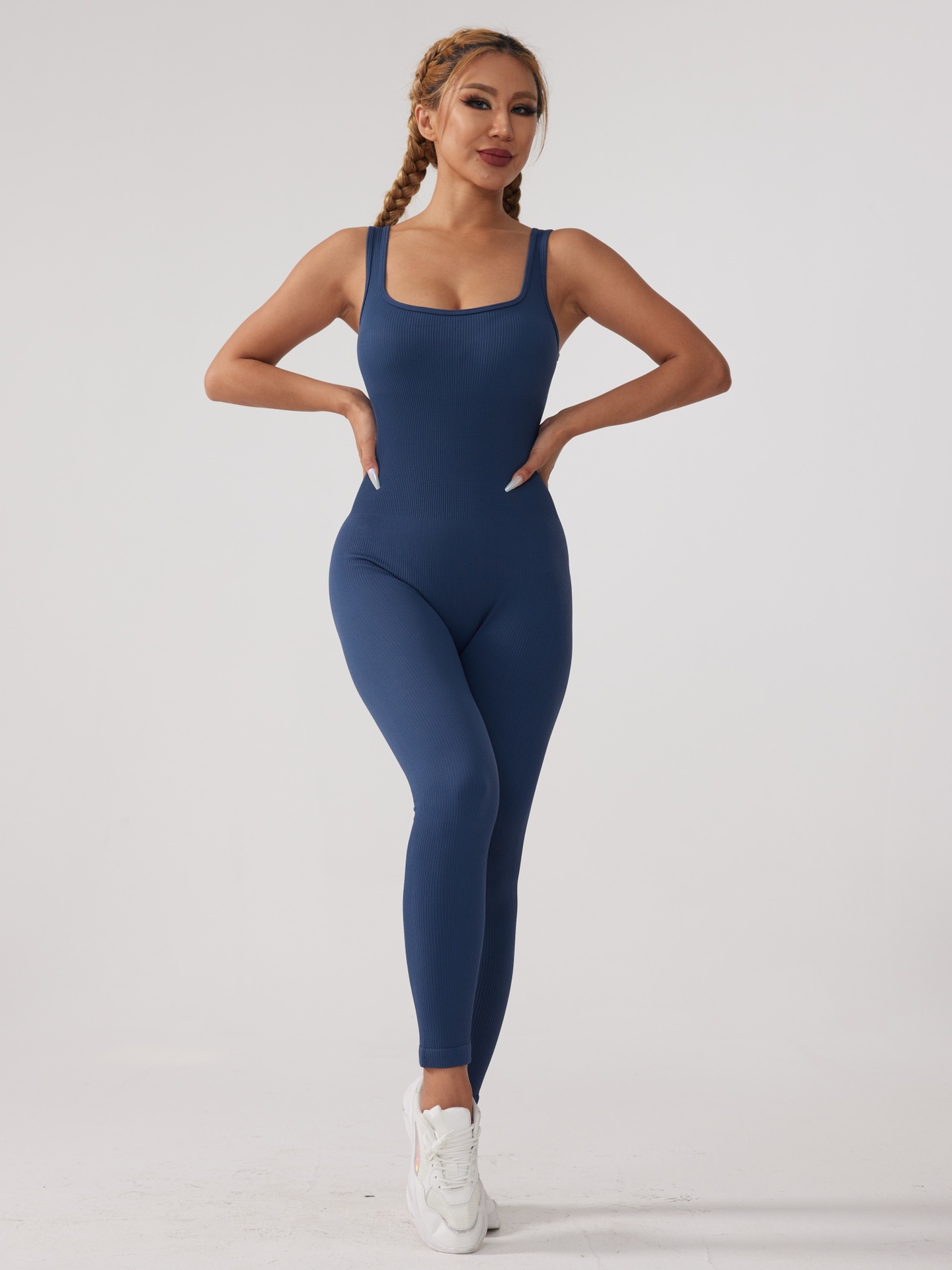 跨境无缝针织螺纹纯色紧身平领连体衣运动跑步健身瑜伽服连体套装