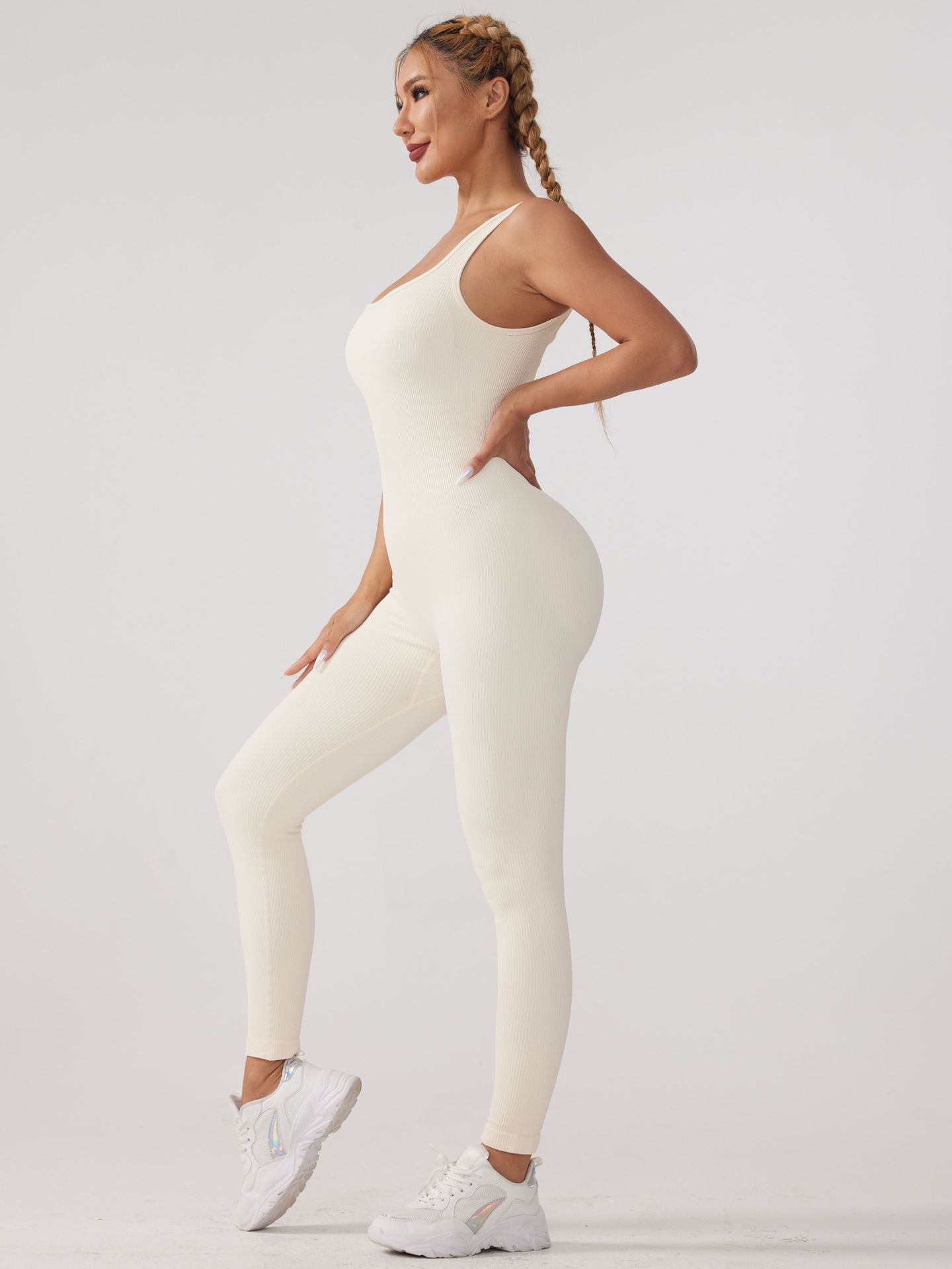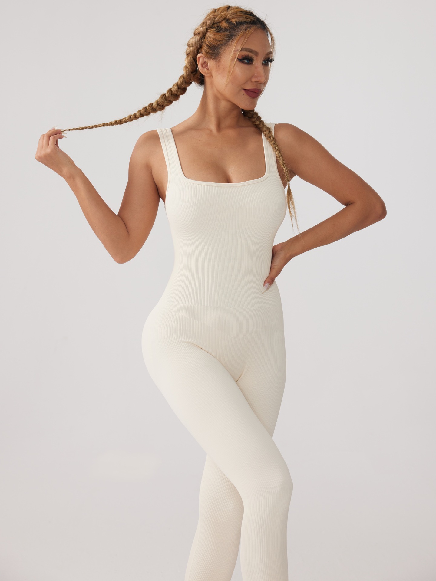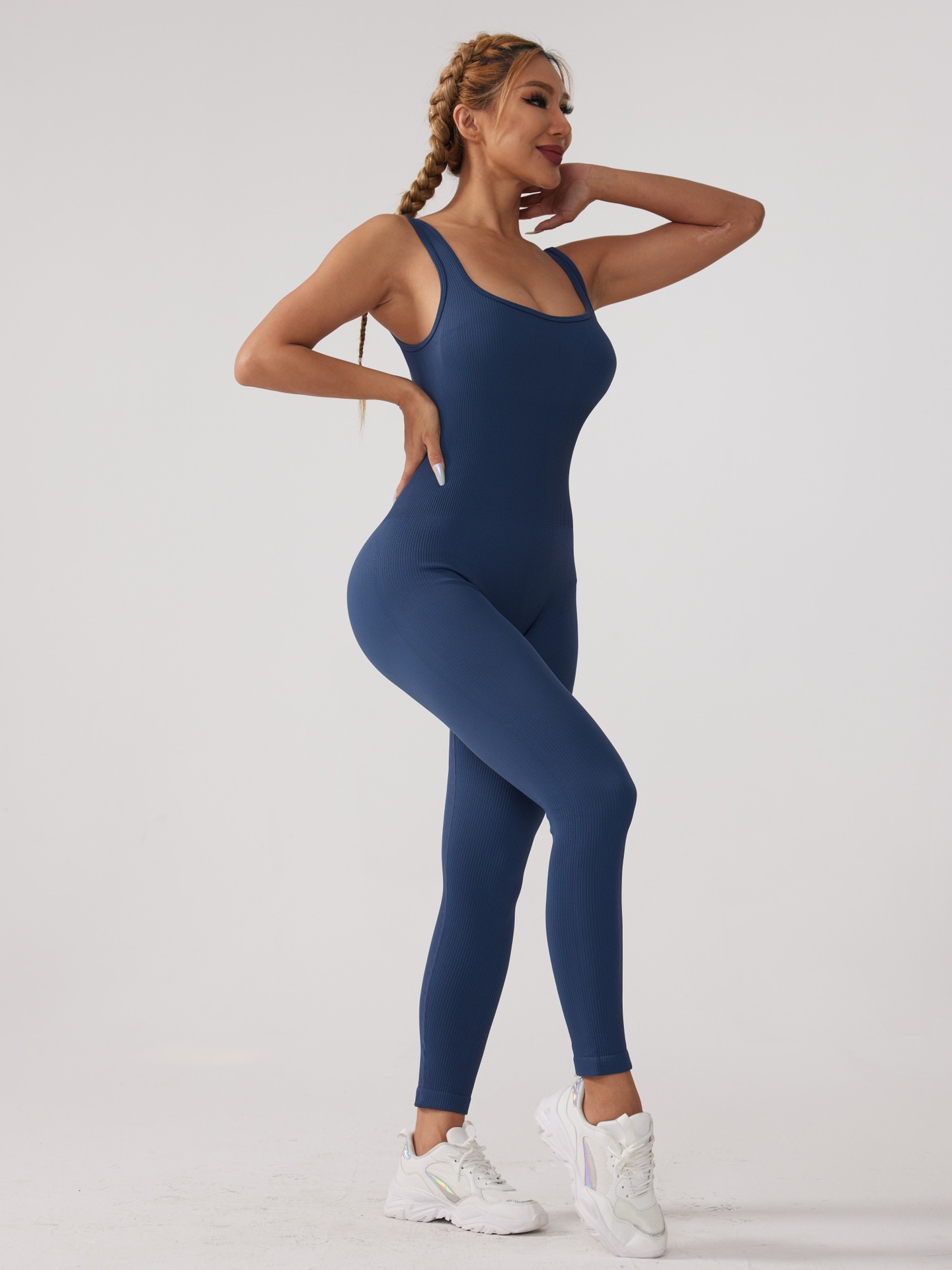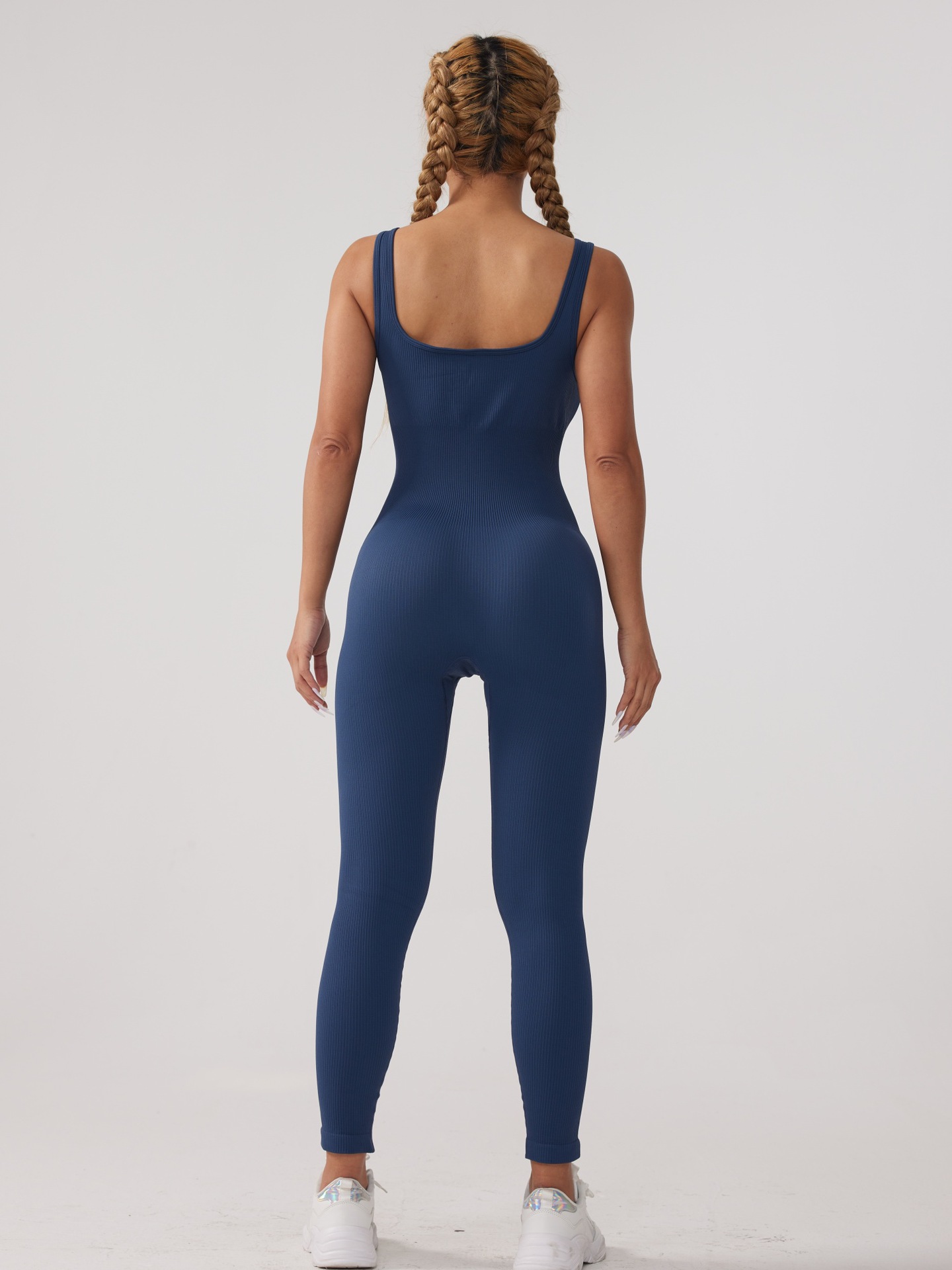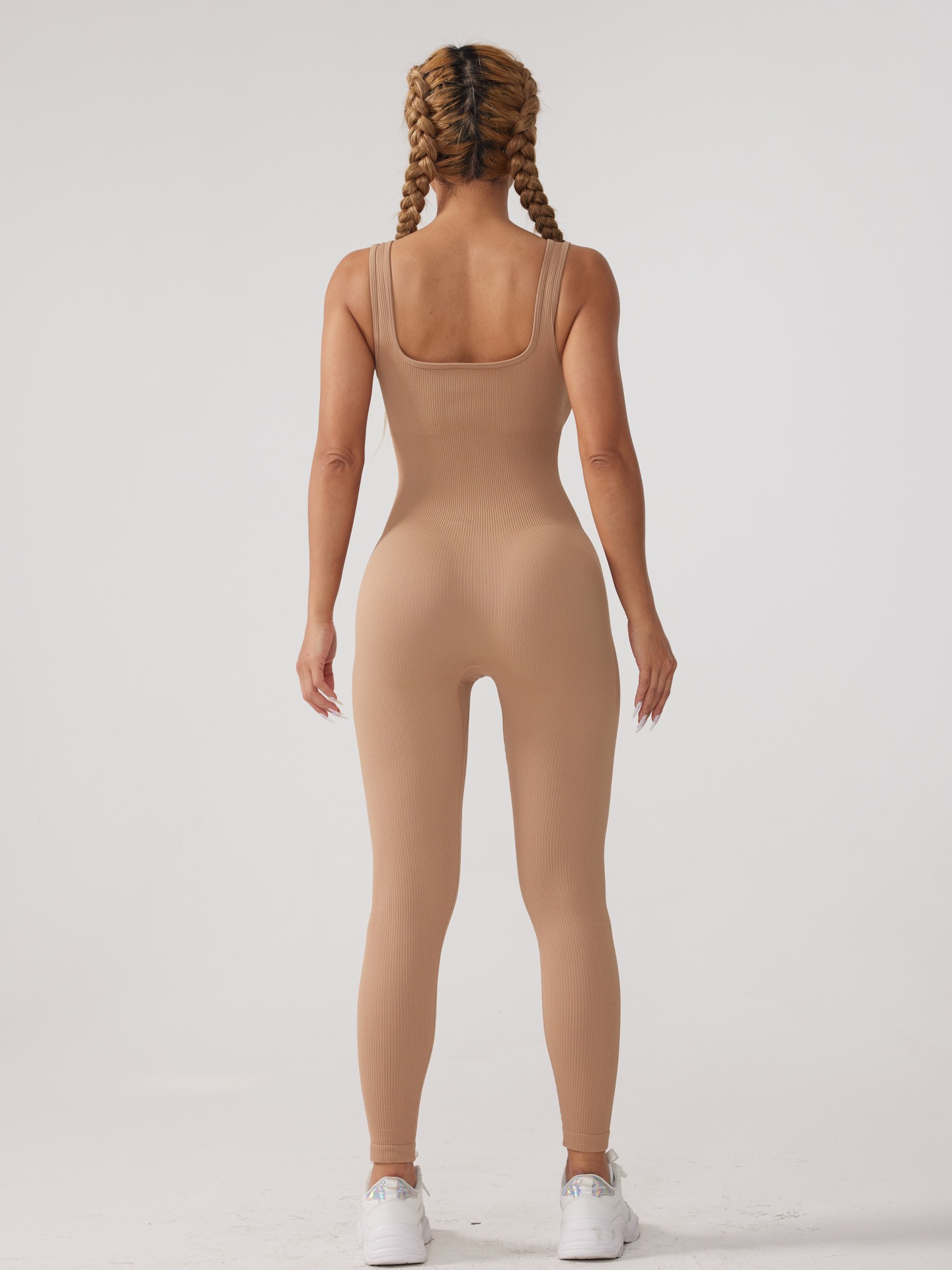 跨境无缝针织螺纹纯色紧身平领连体衣运动跑步健身瑜伽服连体套装