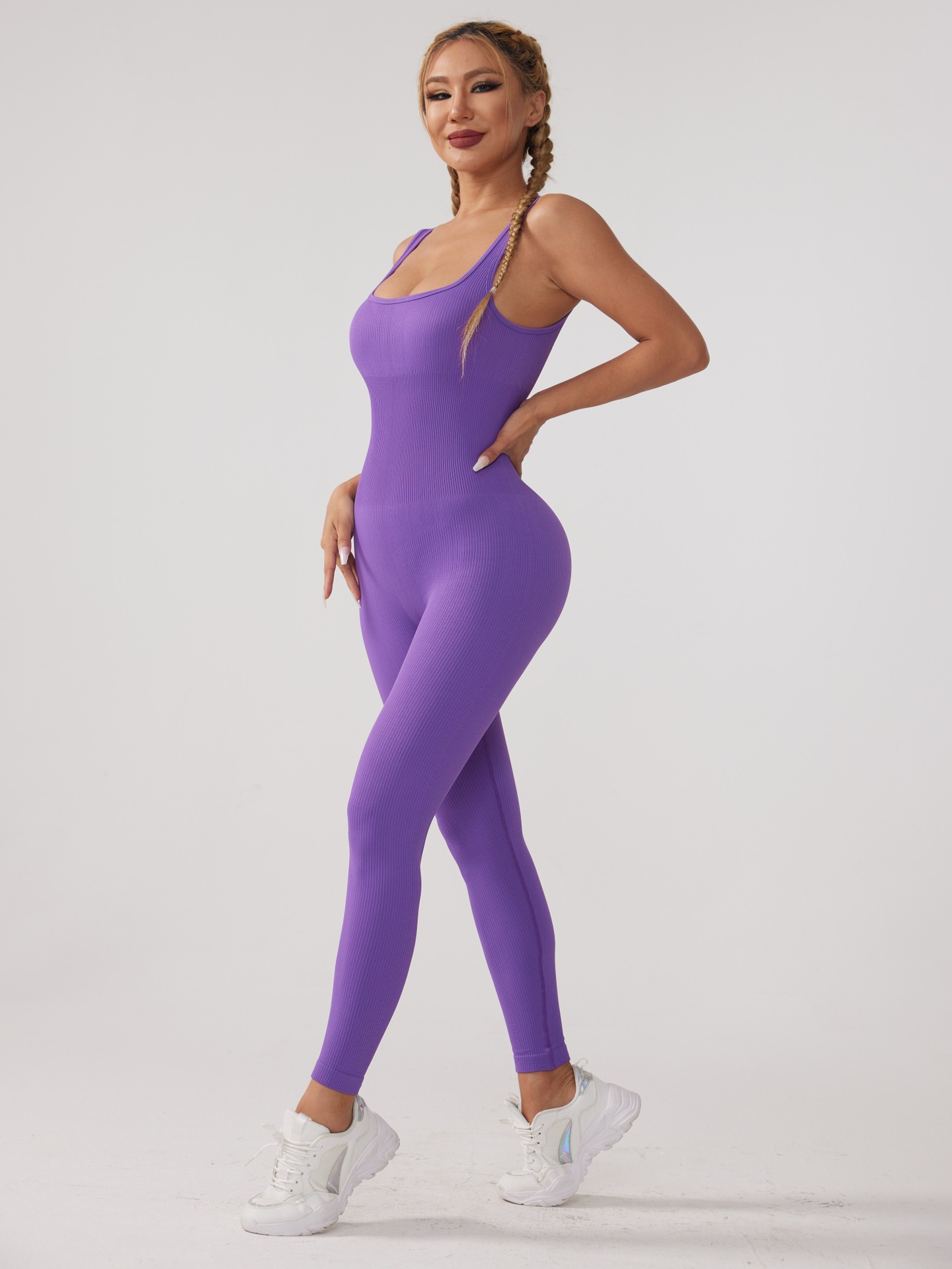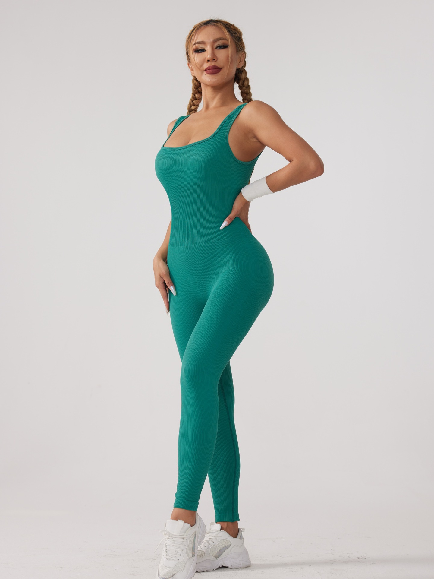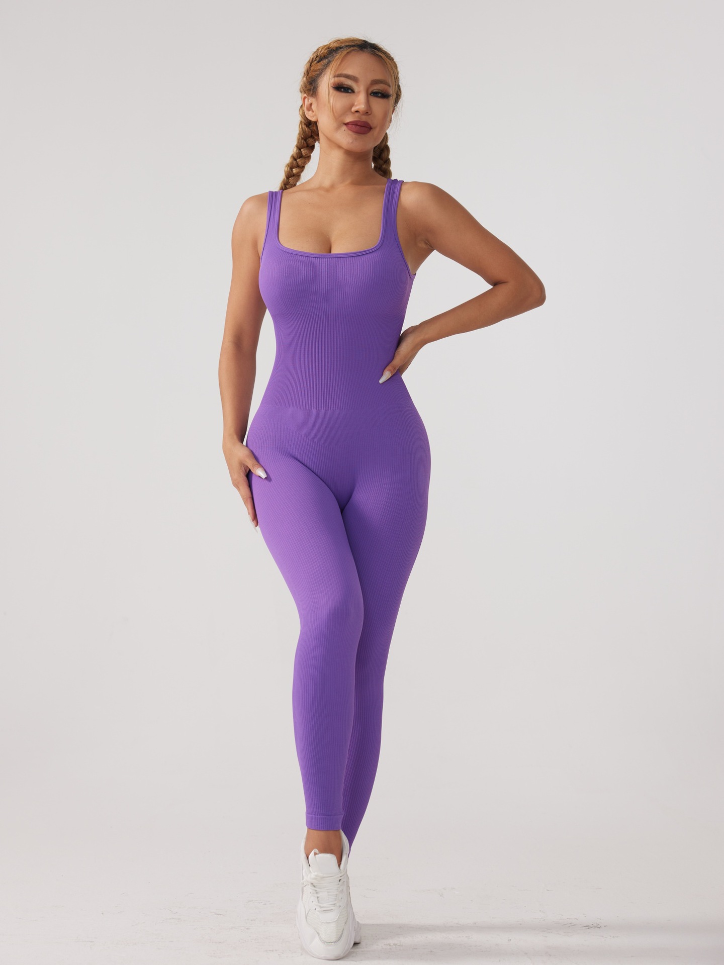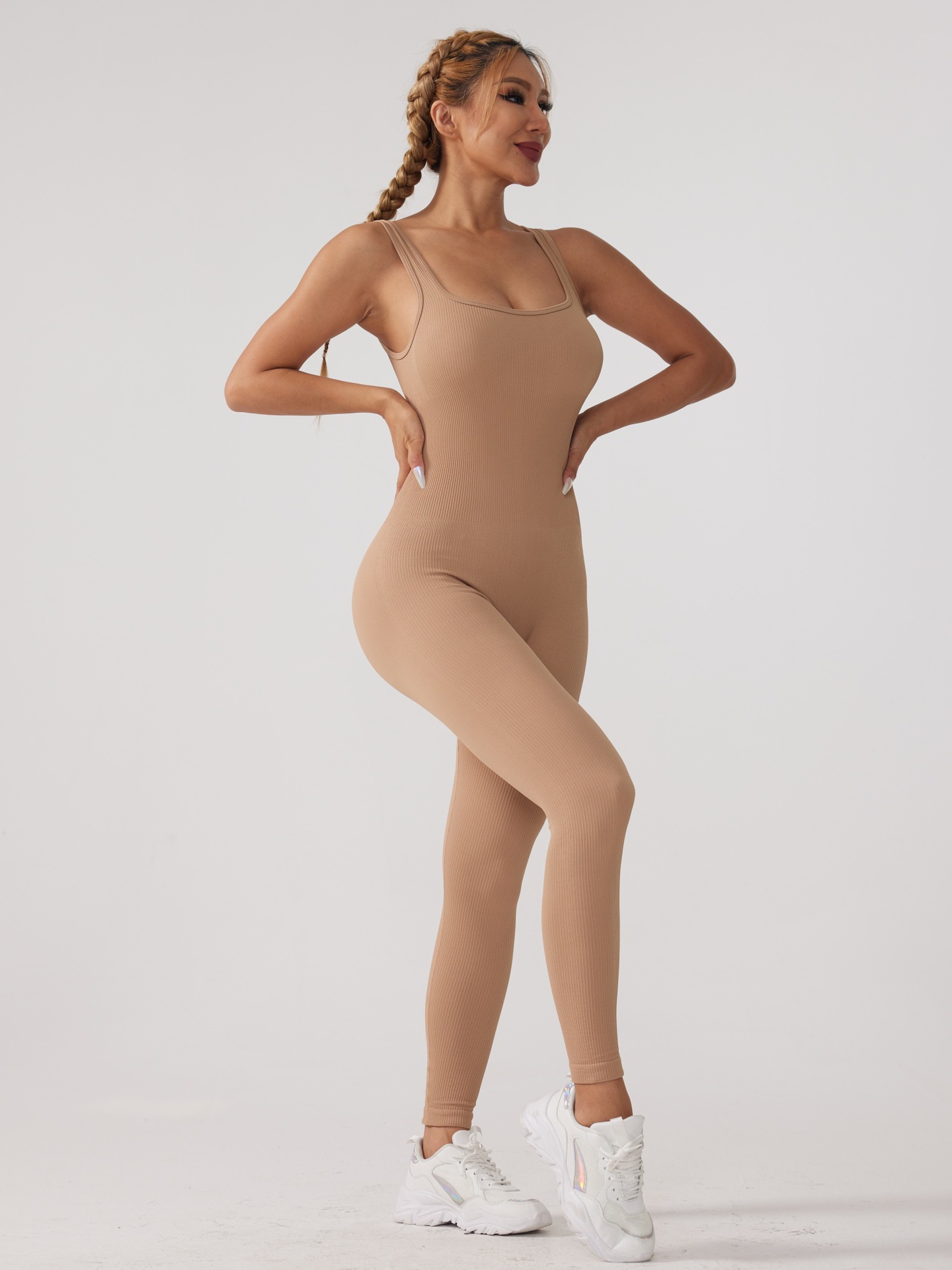 跨境无缝针织螺纹纯色紧身平领连体衣运动跑步健身瑜伽服连体套装
