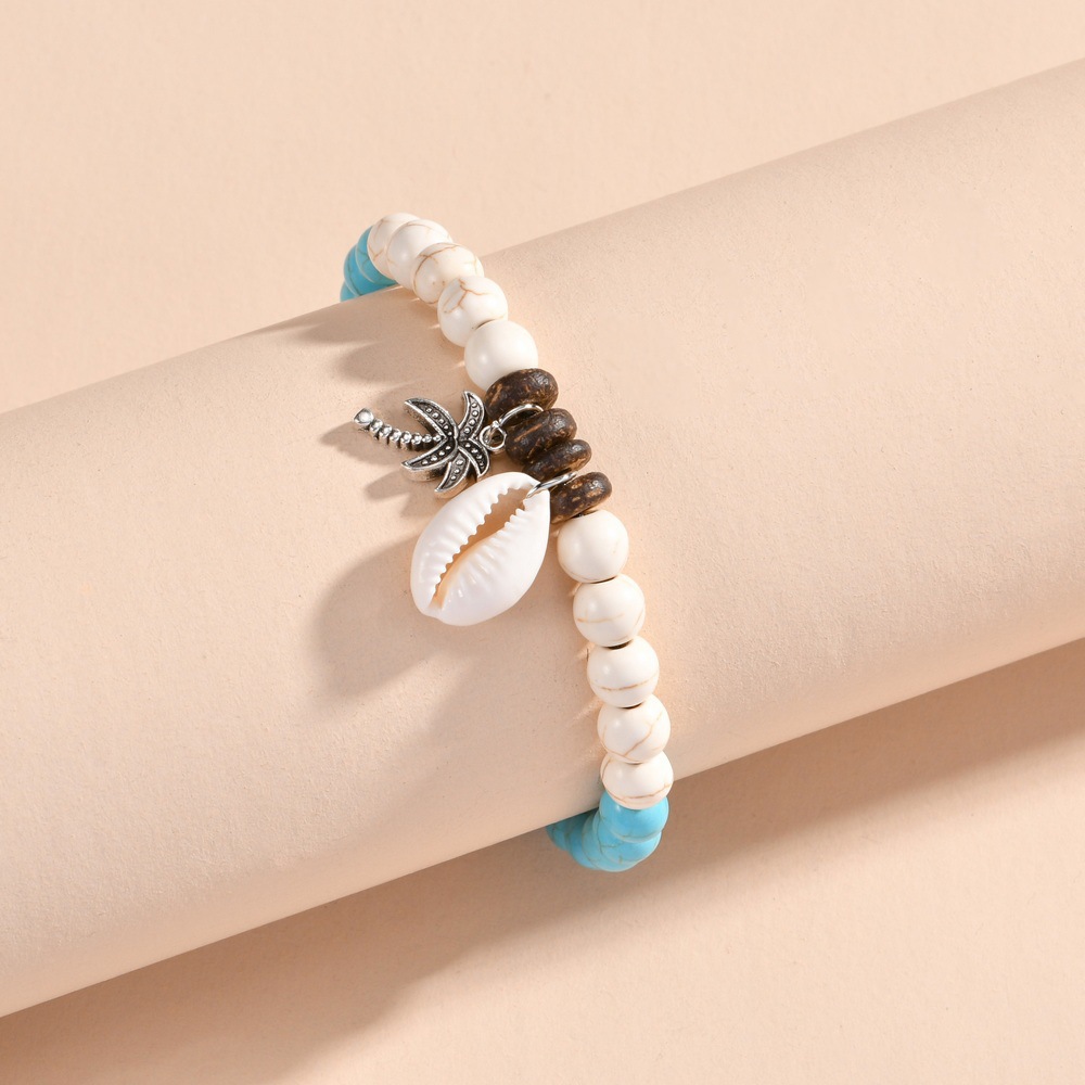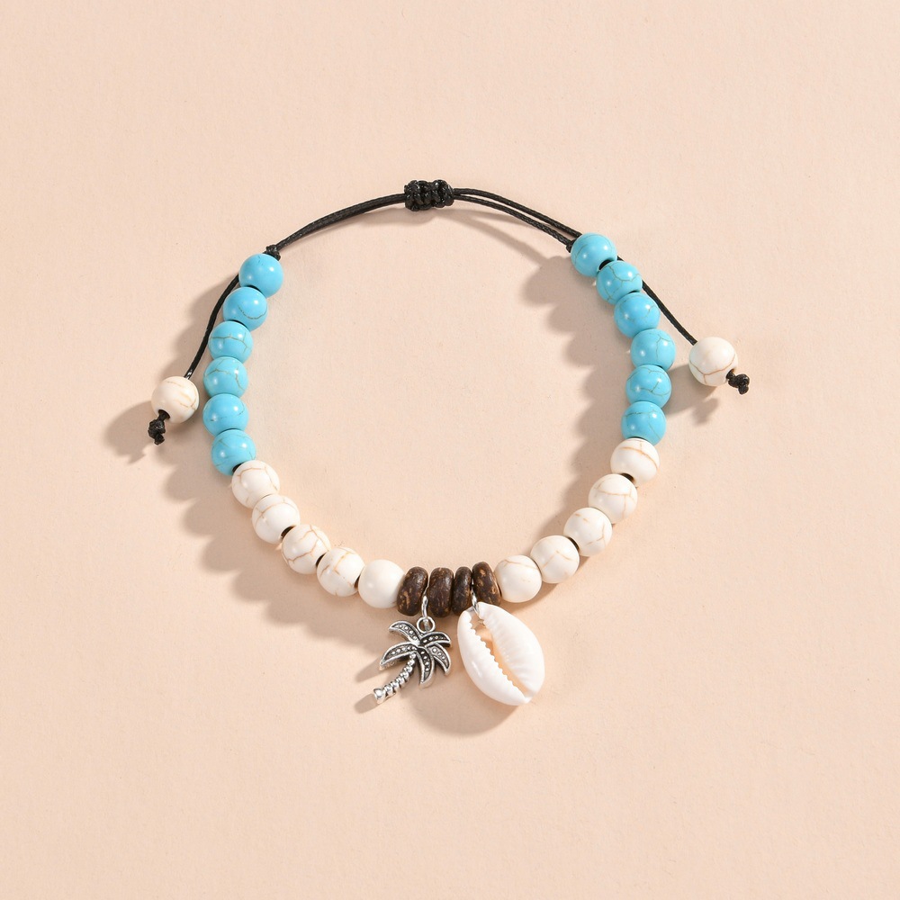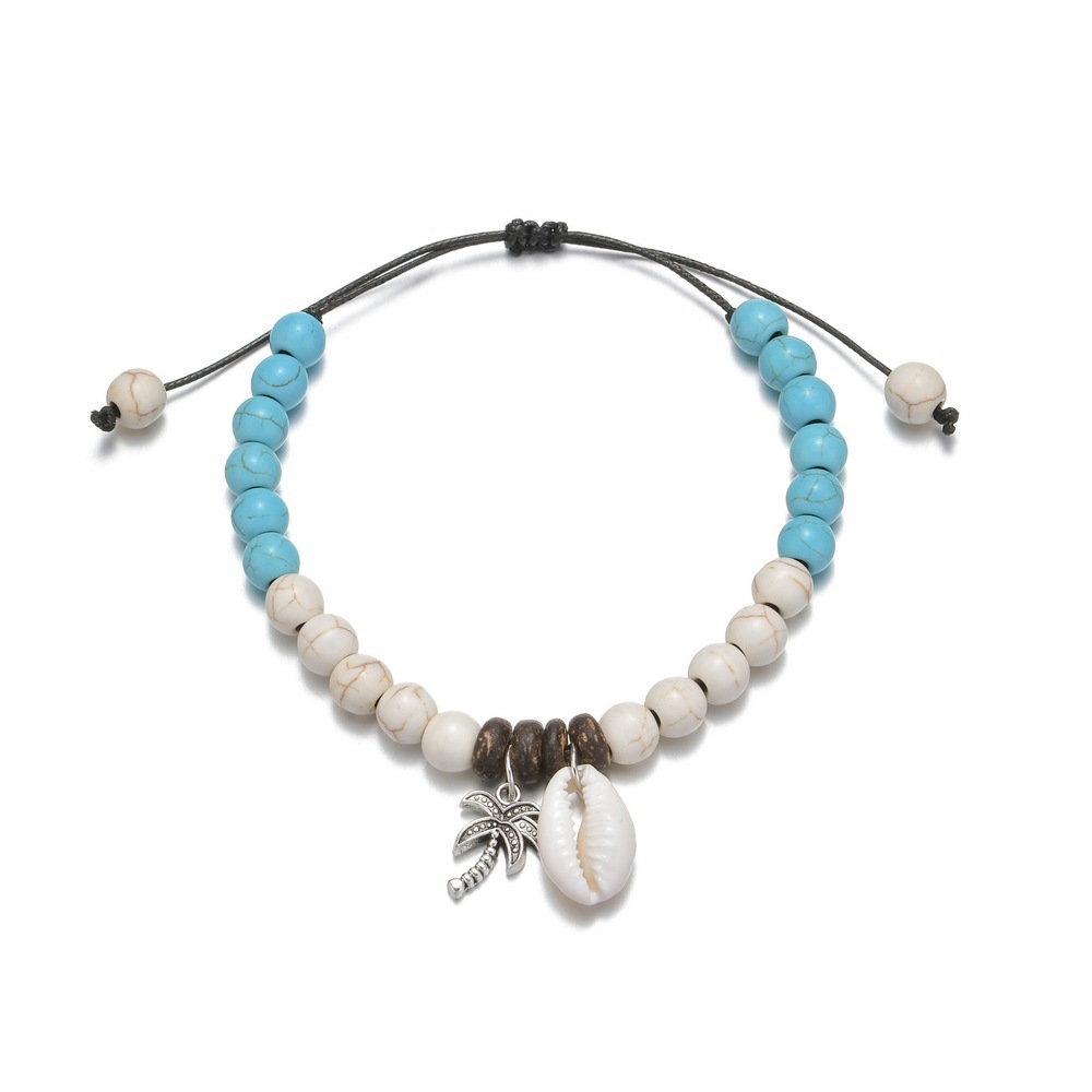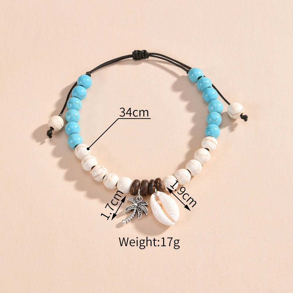 波西米亚度假海滩风天然贝壳松石合金椰树吊坠可调节编织女士脚链