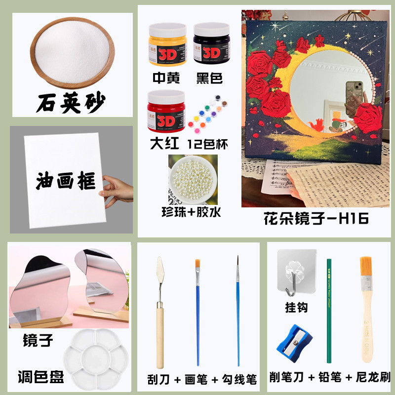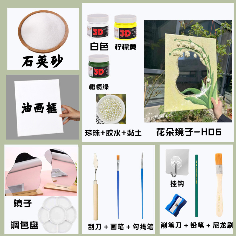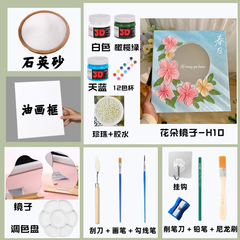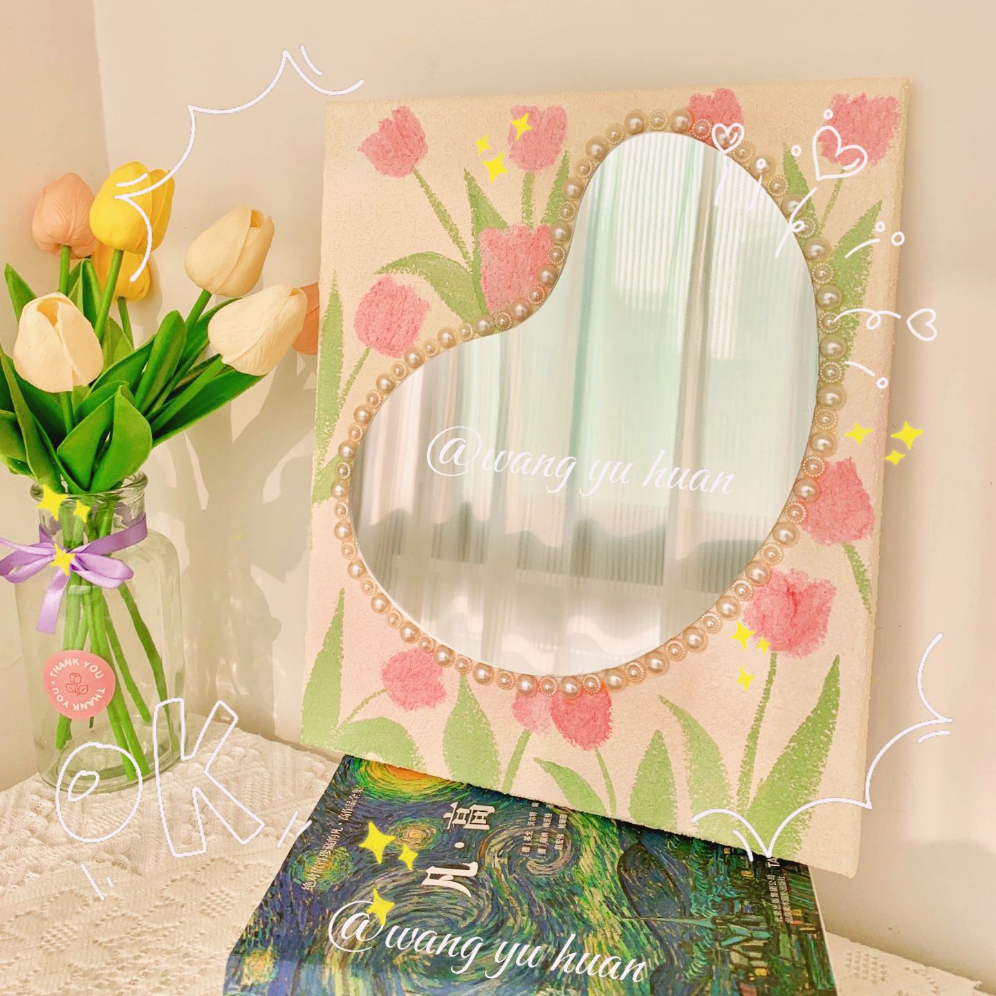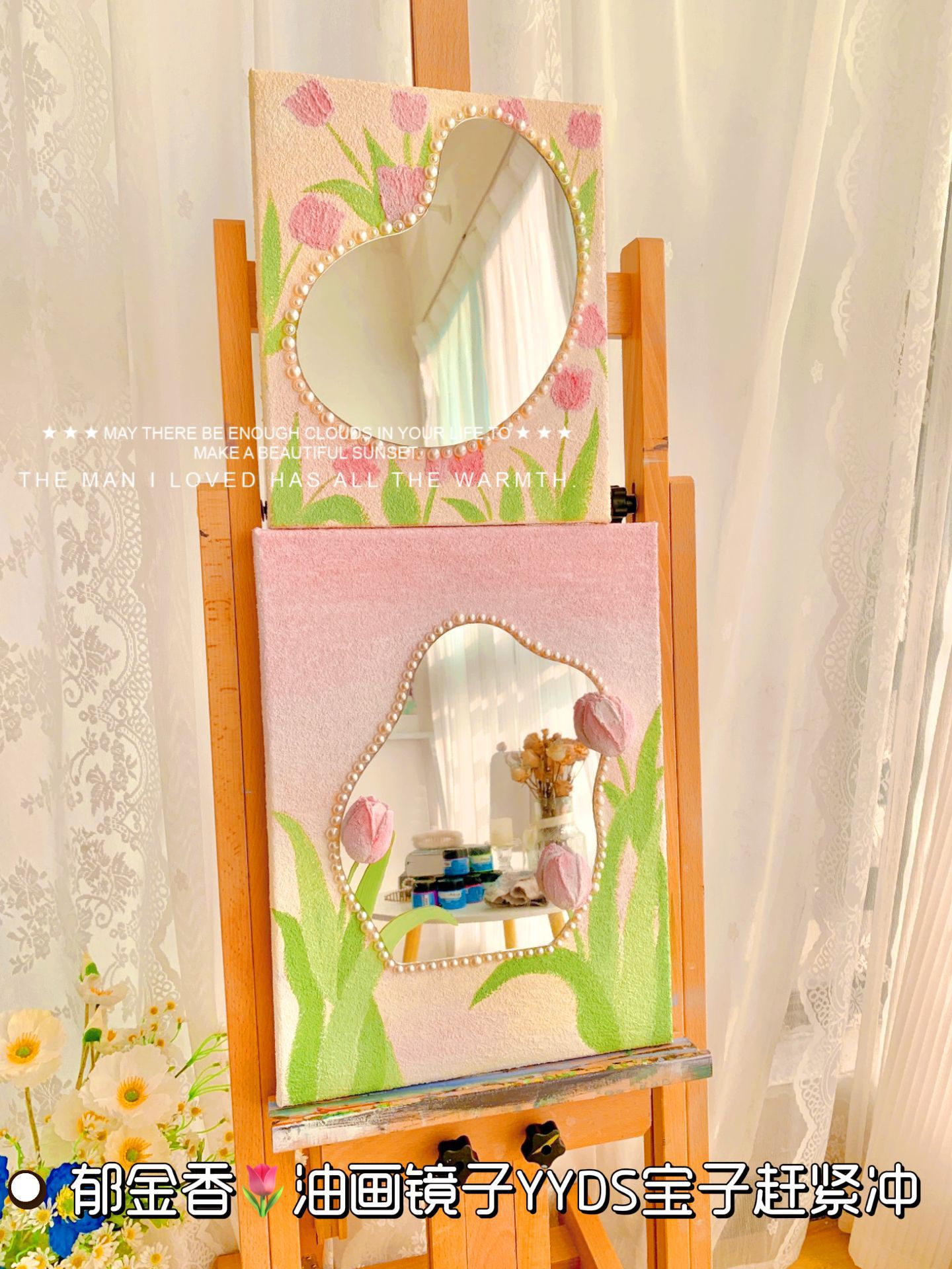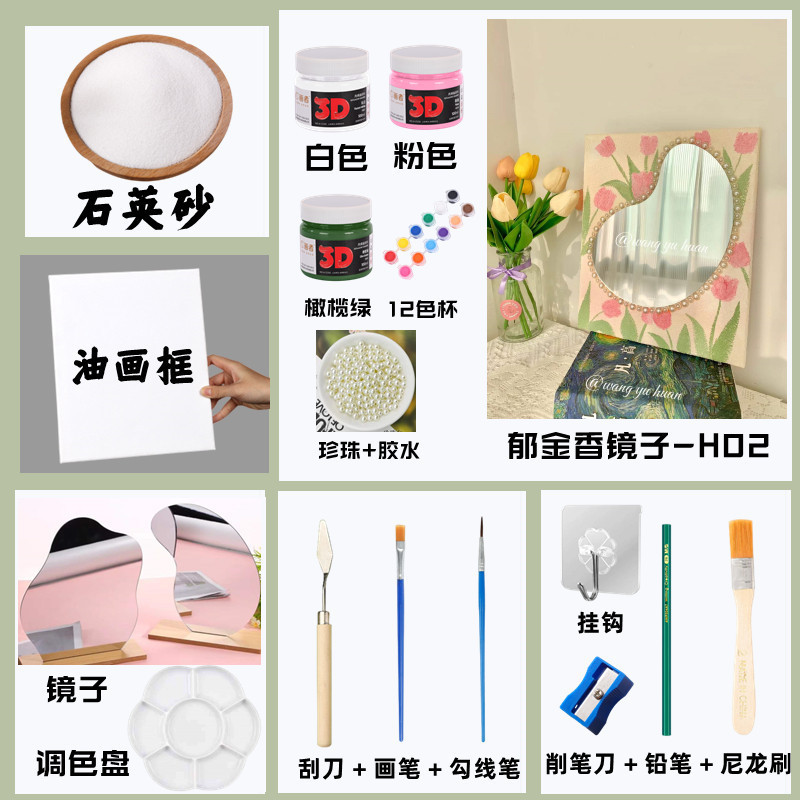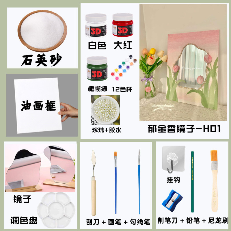 郁金香镜子DIY石英砂丙烯肌理画异形云朵化妆镜立体油彩画材料包