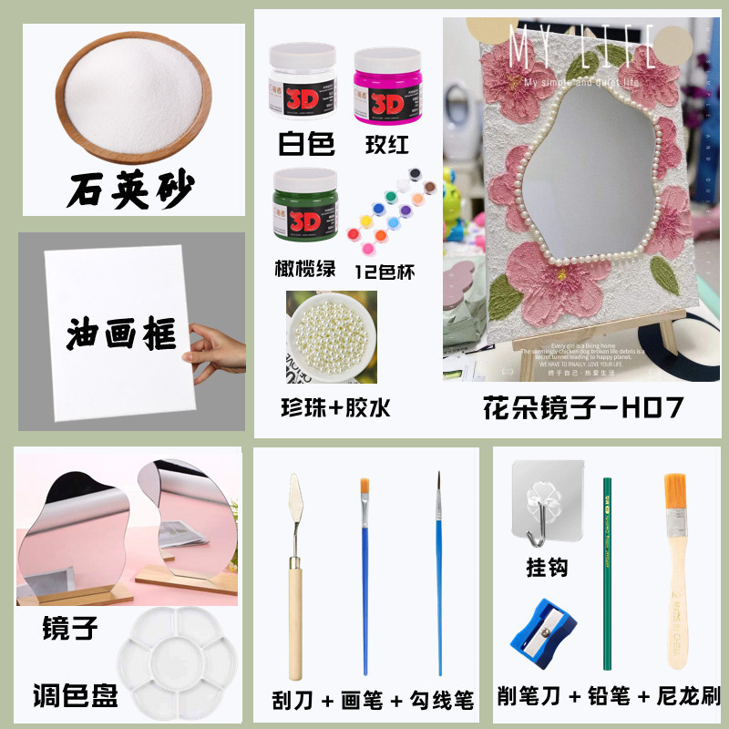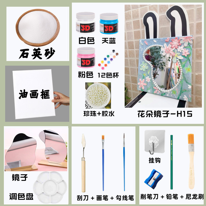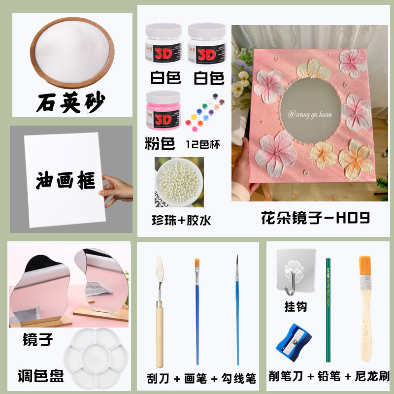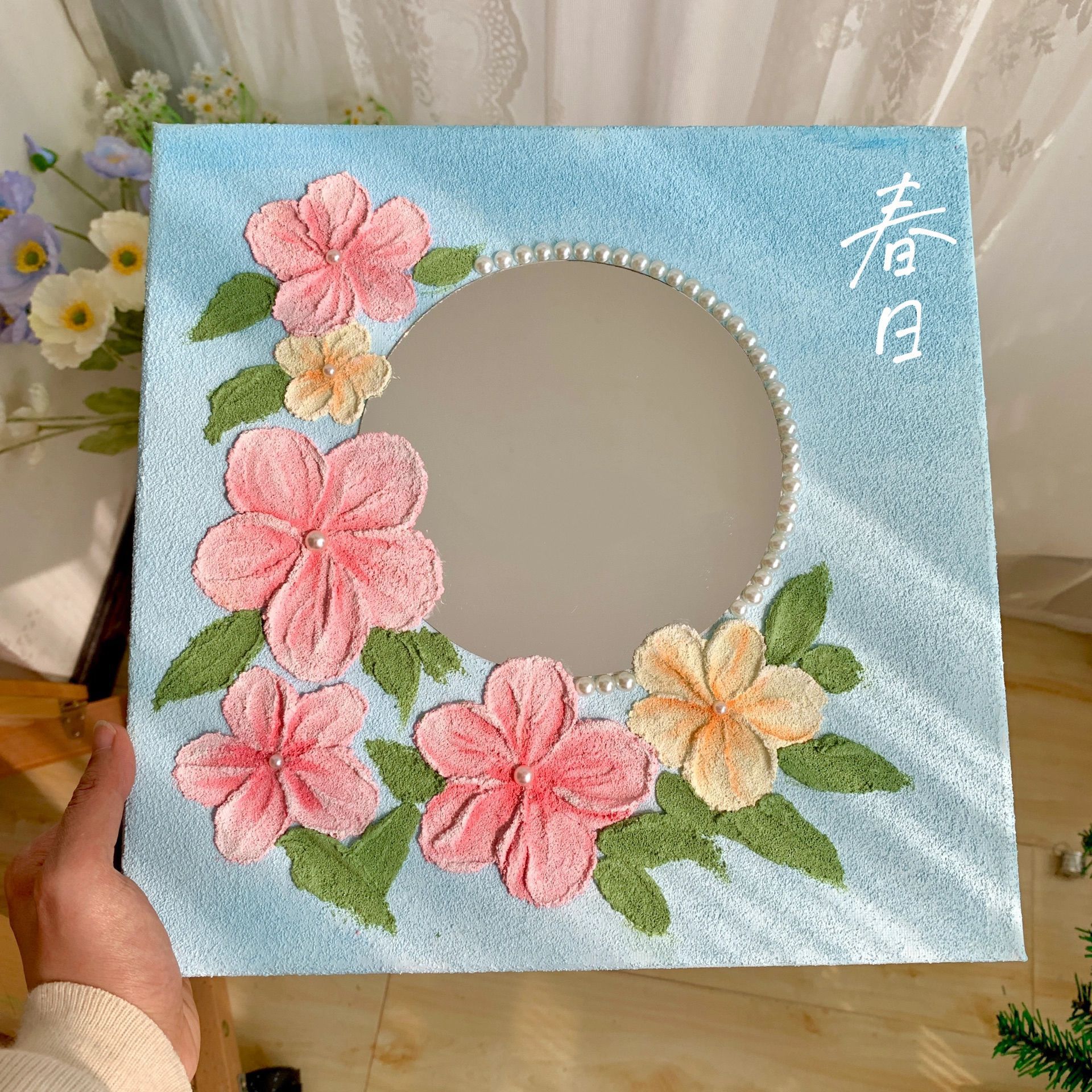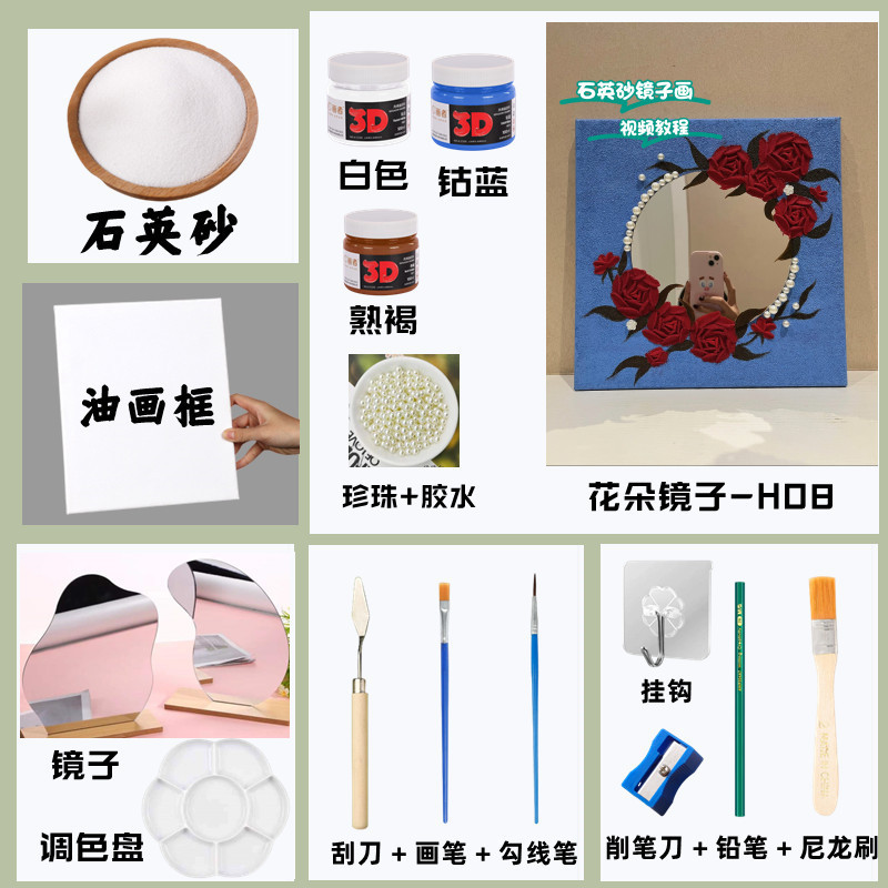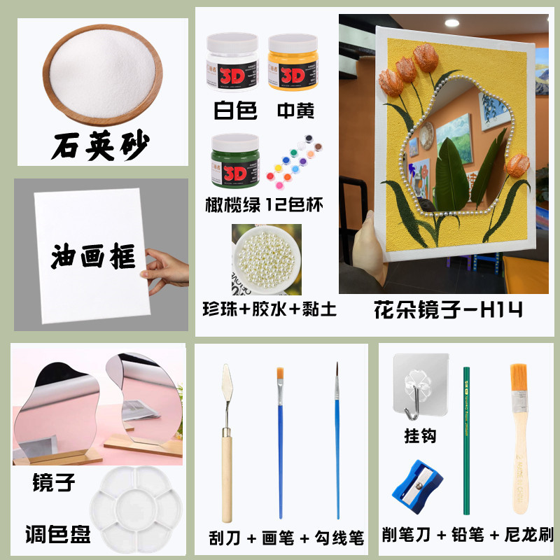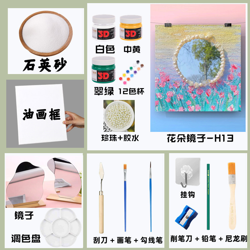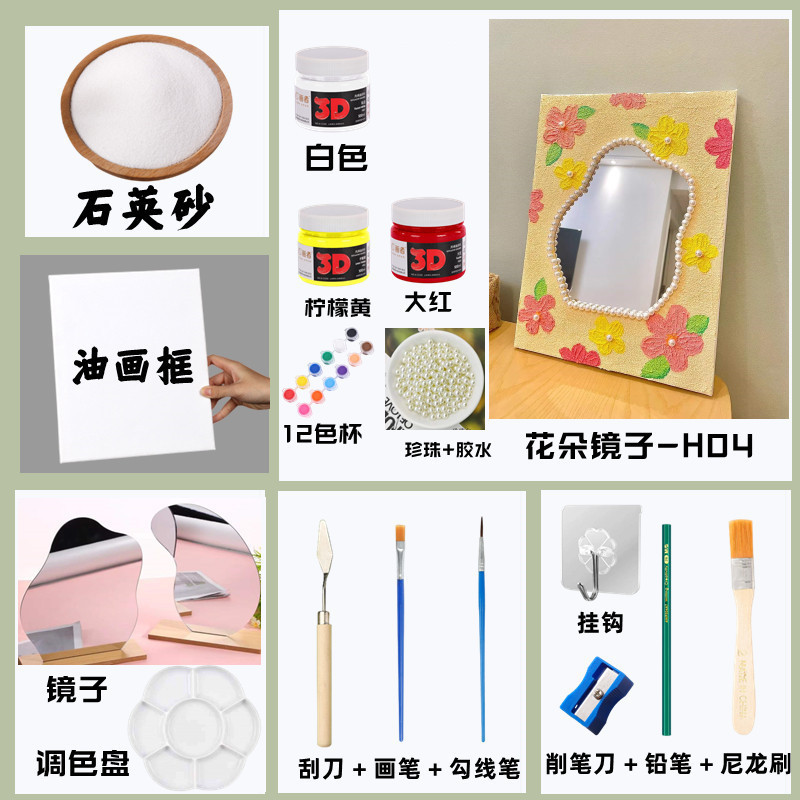 郁金香镜子DIY石英砂丙烯肌理画异形云朵化妆镜立体油彩画材料包