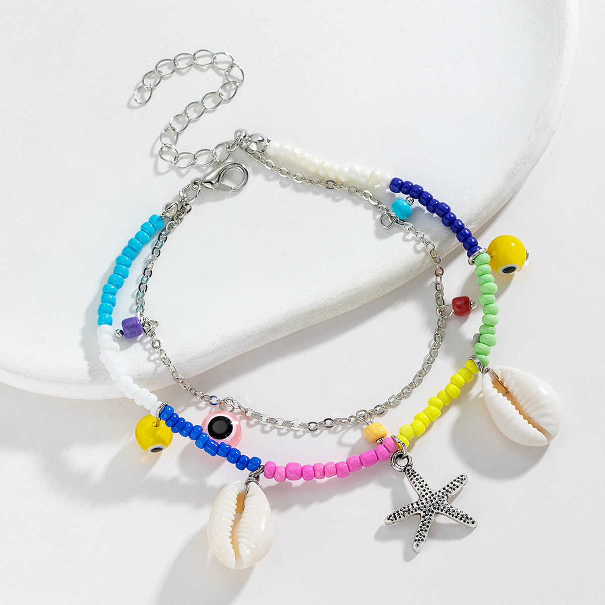 时尚海洋风合金海星贝壳恶魔之眼彩色米珠编织可调节女士双层脚链