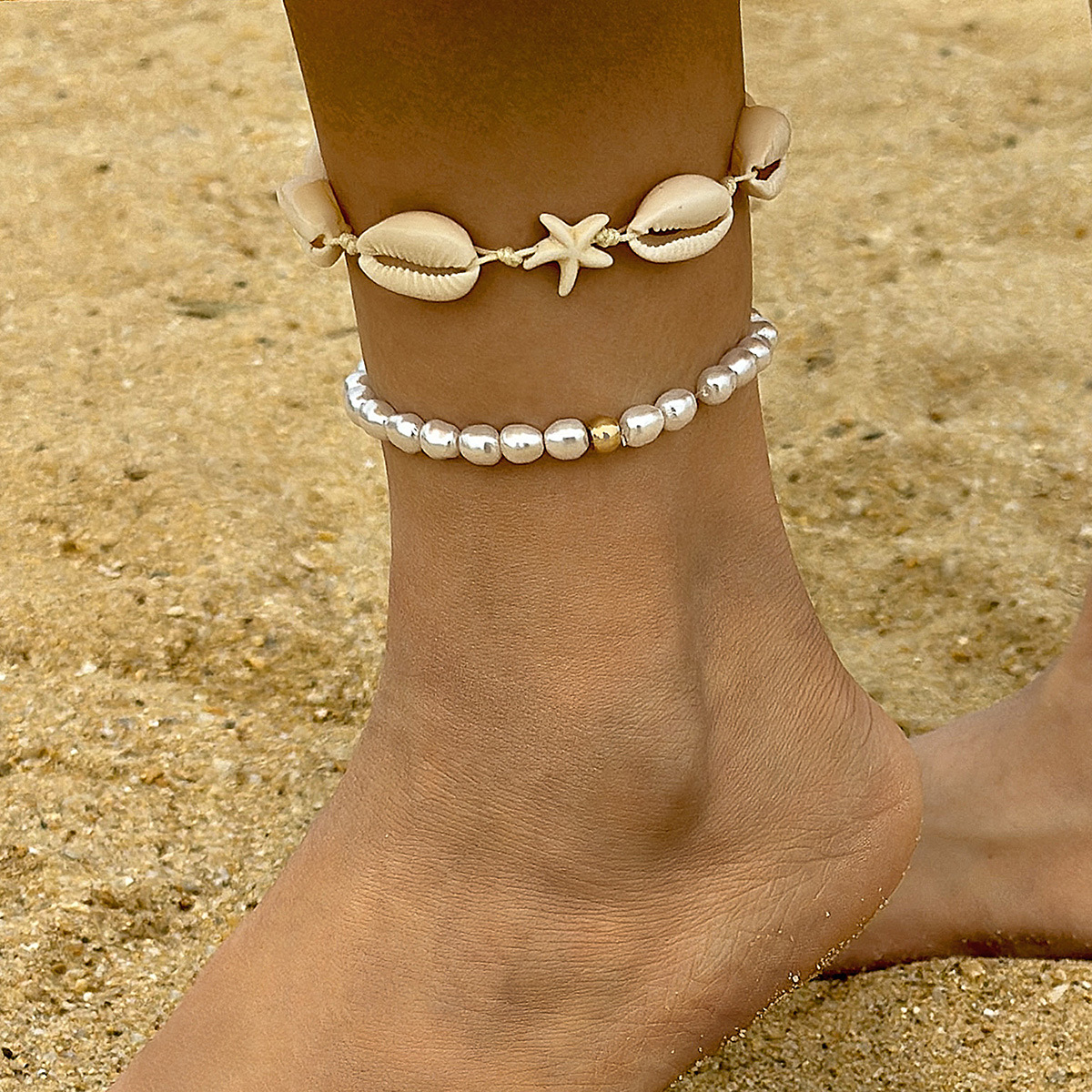 欧美跨境海洋沙滩度假风米珠两件套简约撞色贝壳手工编织脚链