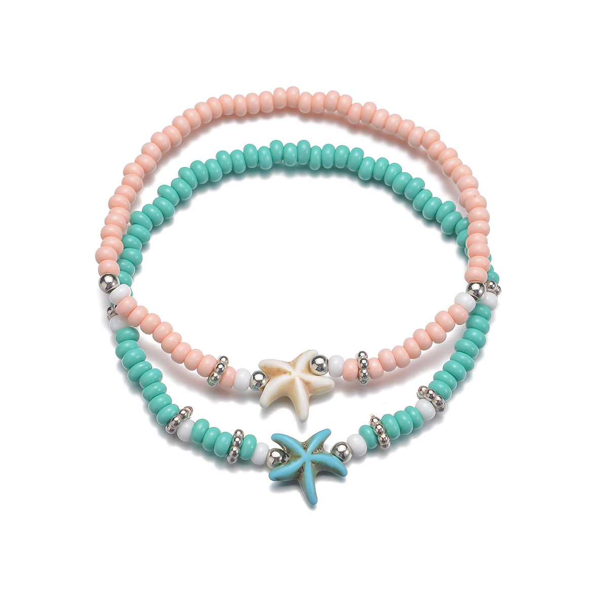 波西米亚民族风双色松石海星米珠弹力脚链2件套适合沙滩度假派对