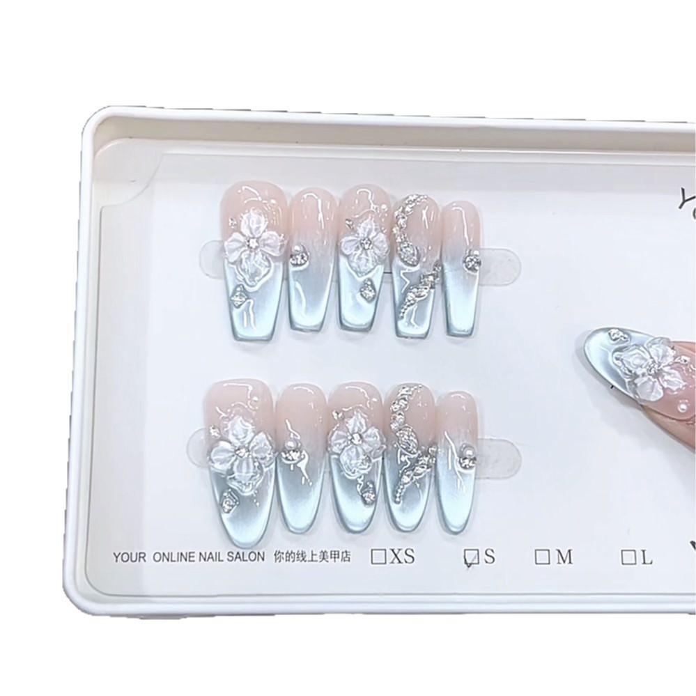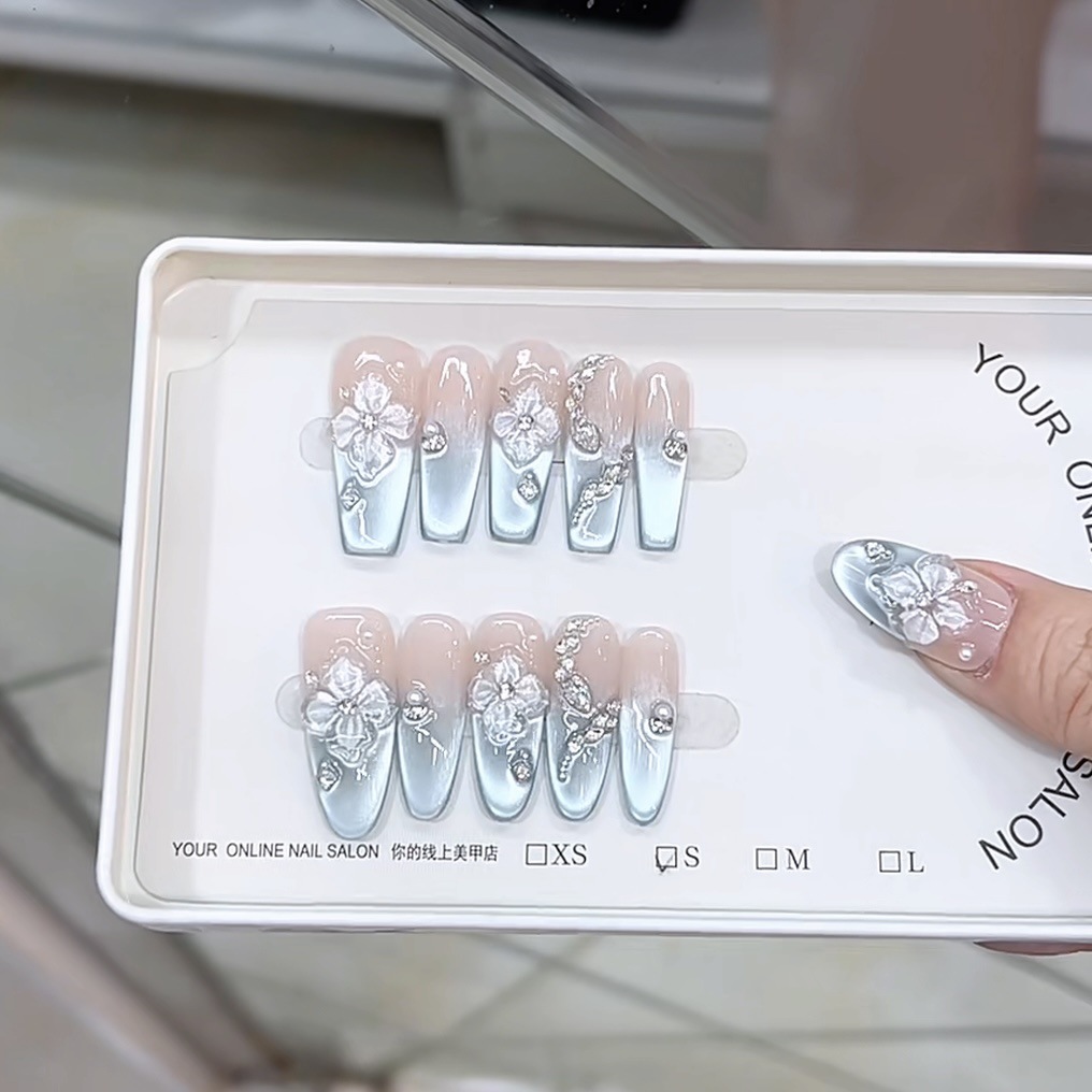 奈姿 手工穿戴甲海边冰花立体手绘浮雕小花猫眼款纯欲气质美甲贴