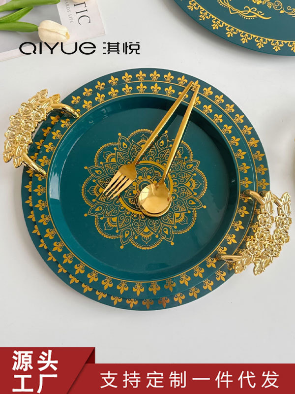 圆形烫金绿色托盘厂家批发北欧轻奢果盘茶盘高级酒店托盘欧式盘子