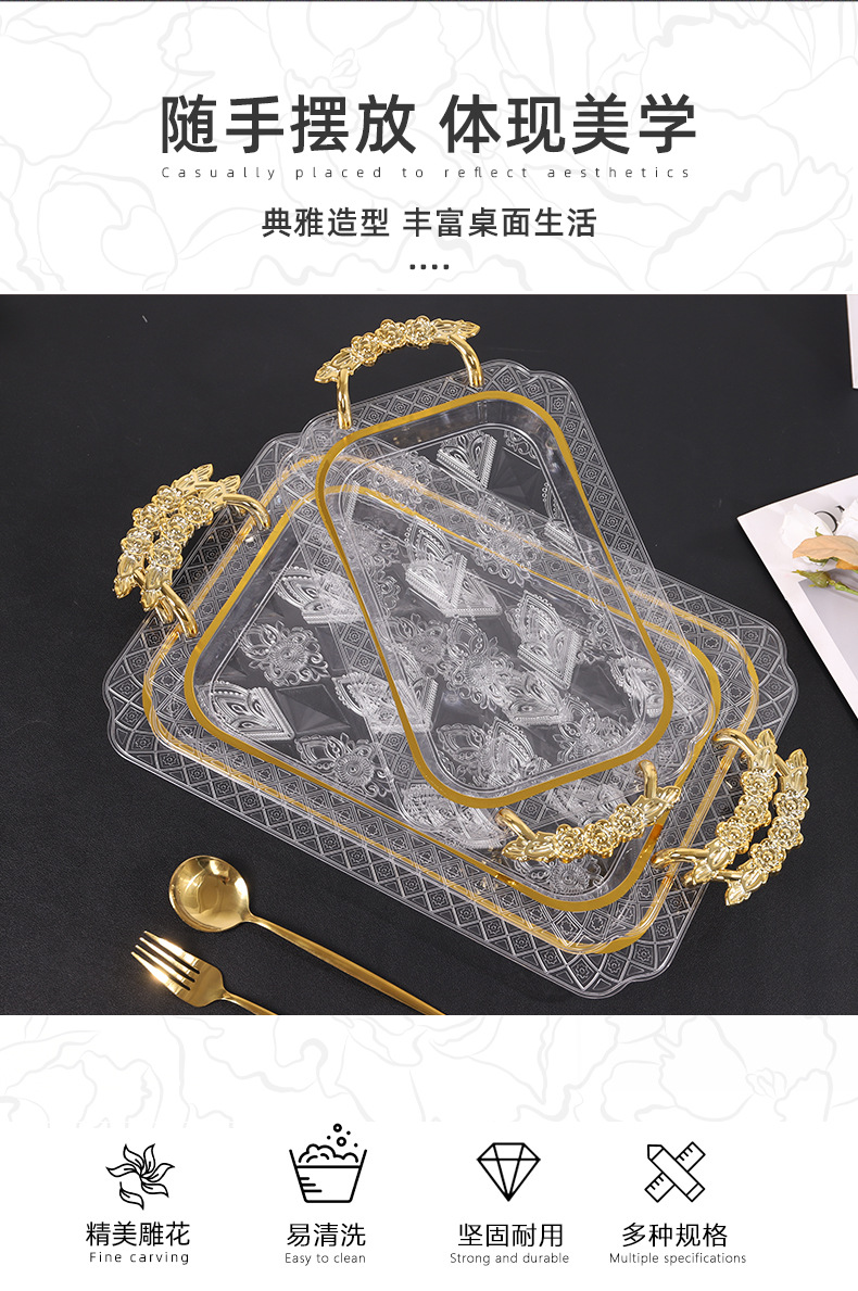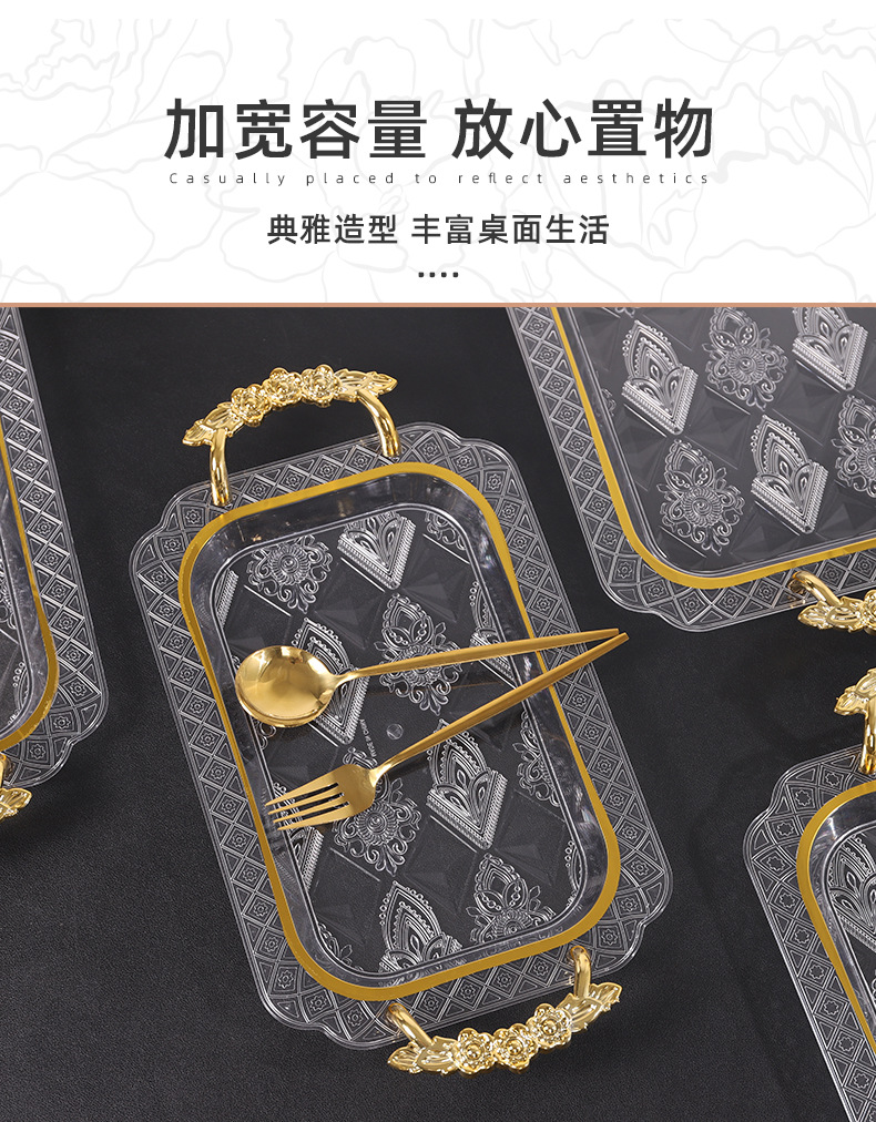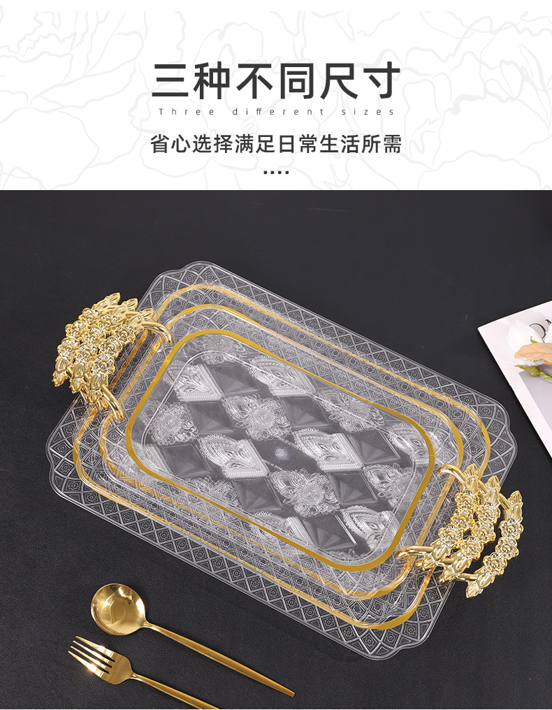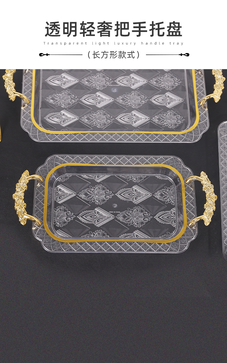 透明长方形玫瑰手柄烫金轻奢托盘跨境tray茶盘果盘点心盘放水杯盘