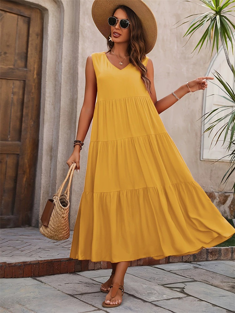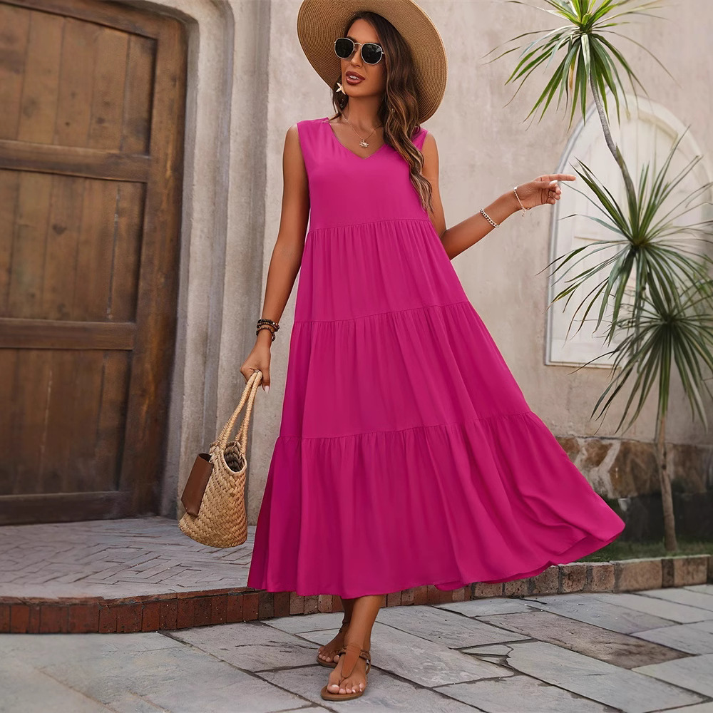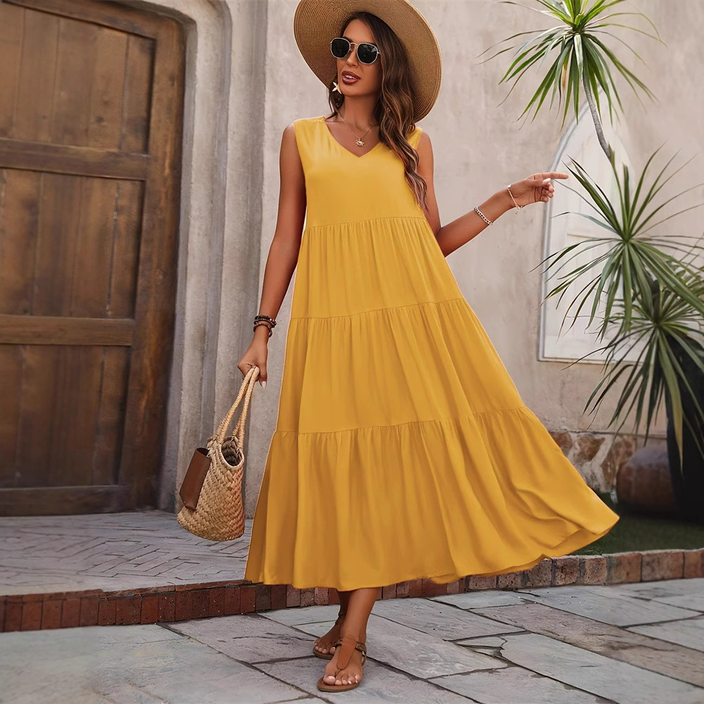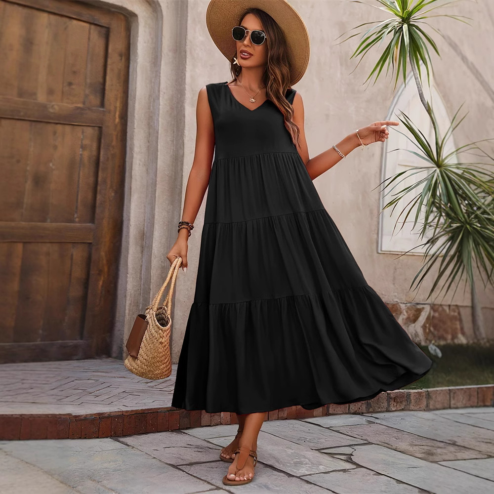 2025新款优雅假日纯色V领分层拼接下摆宽松连衣裙 蛋糕裙