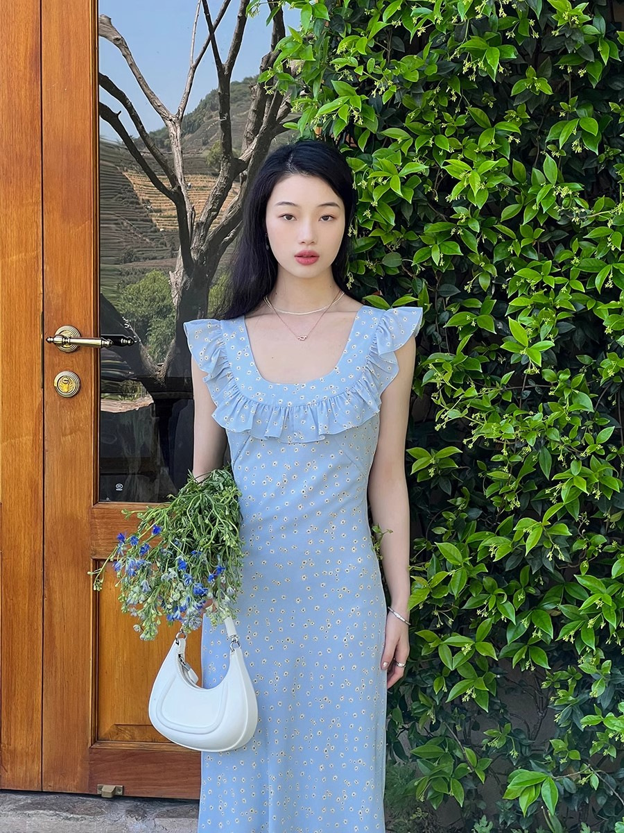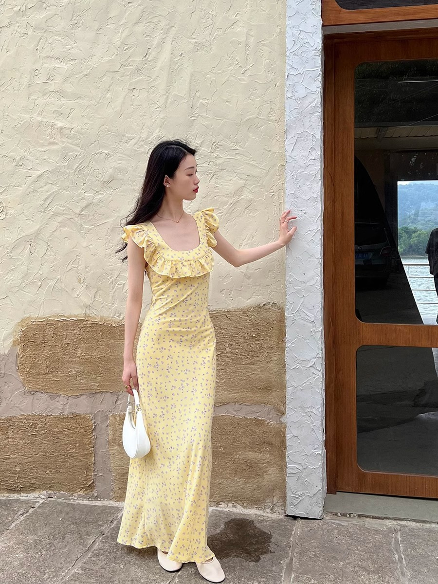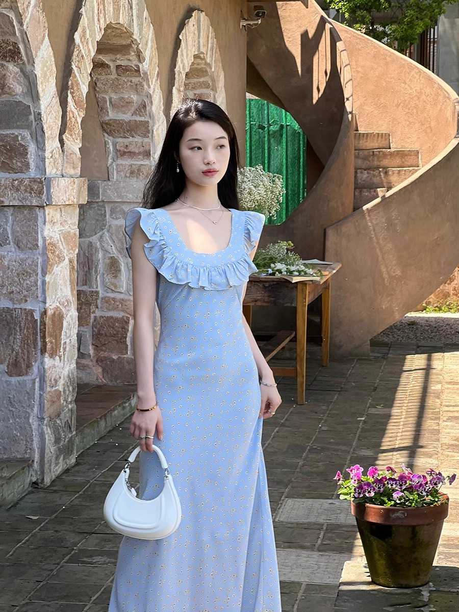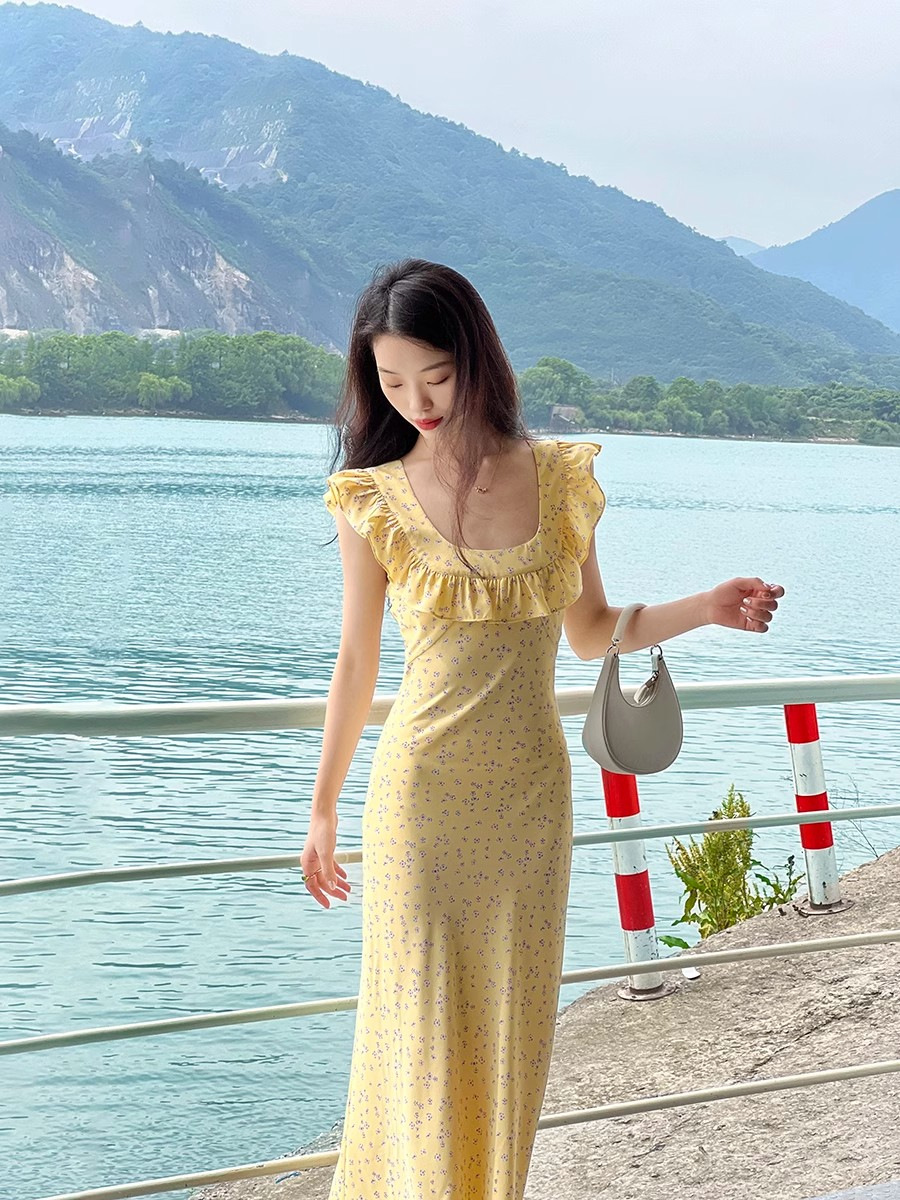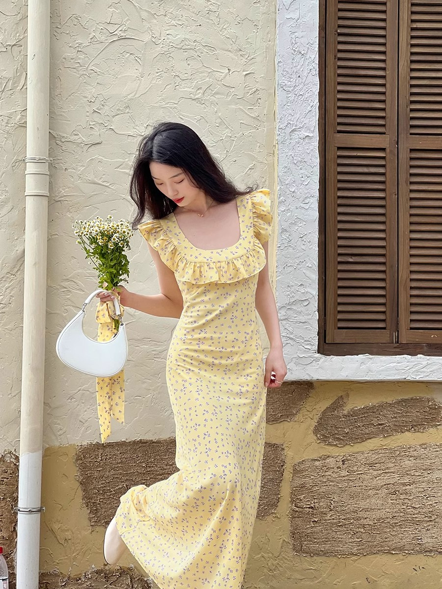 法式复古碎花连衣裙中长款气质淑女方领荷叶边裙子女夏季过膝长裙