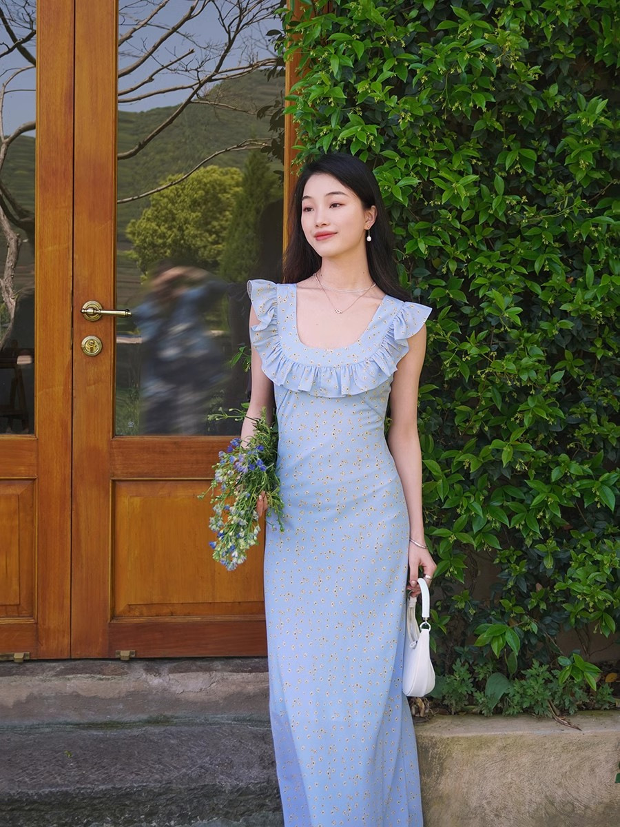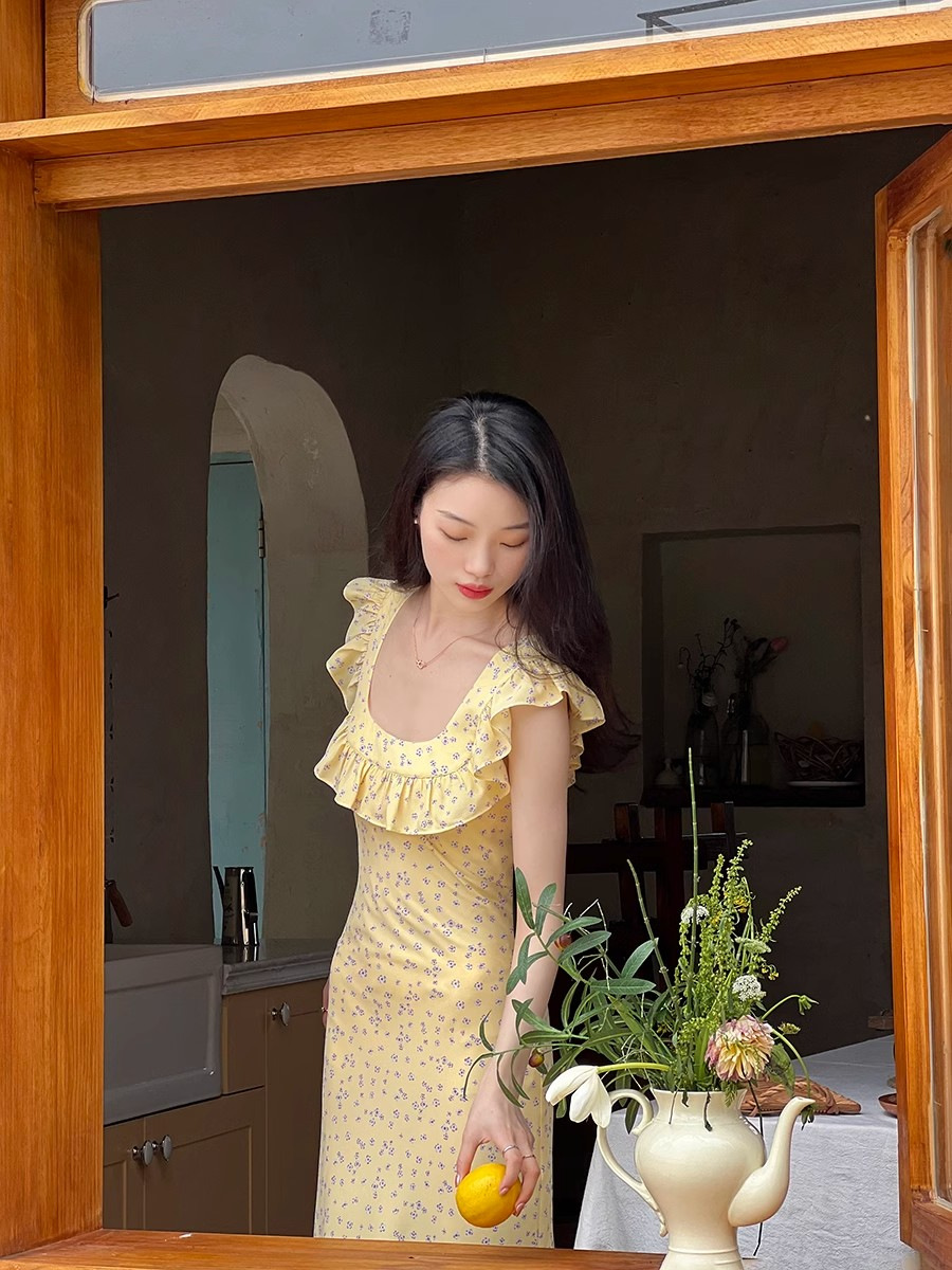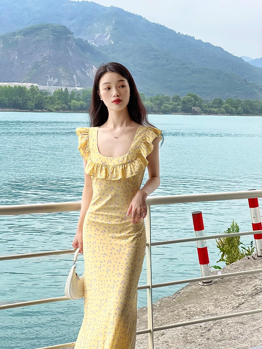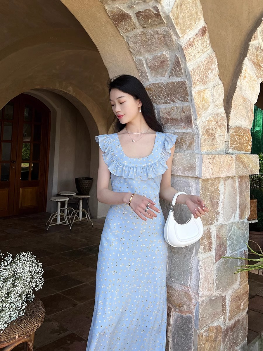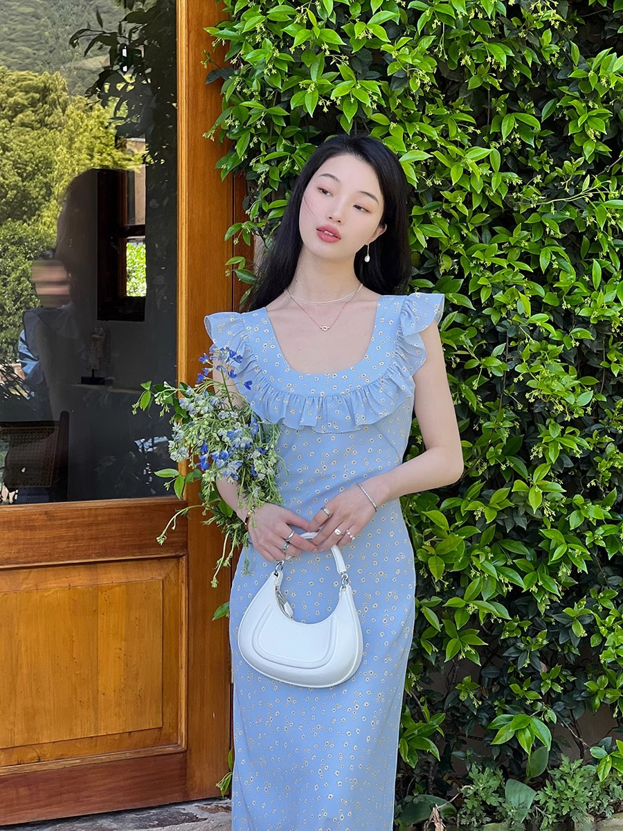 法式复古碎花连衣裙中长款气质淑女方领荷叶边裙子女夏季过膝长裙