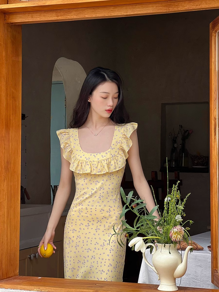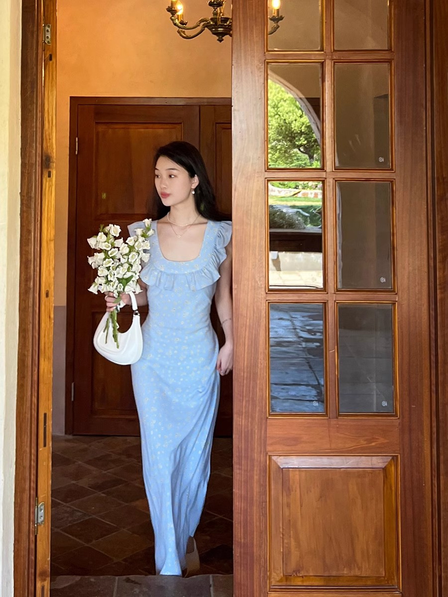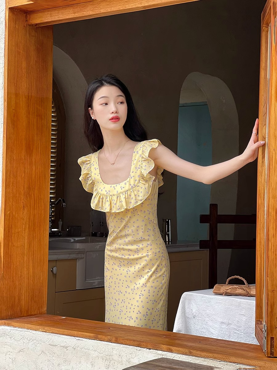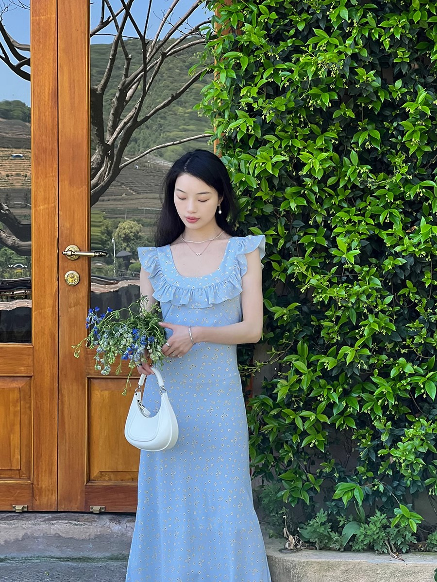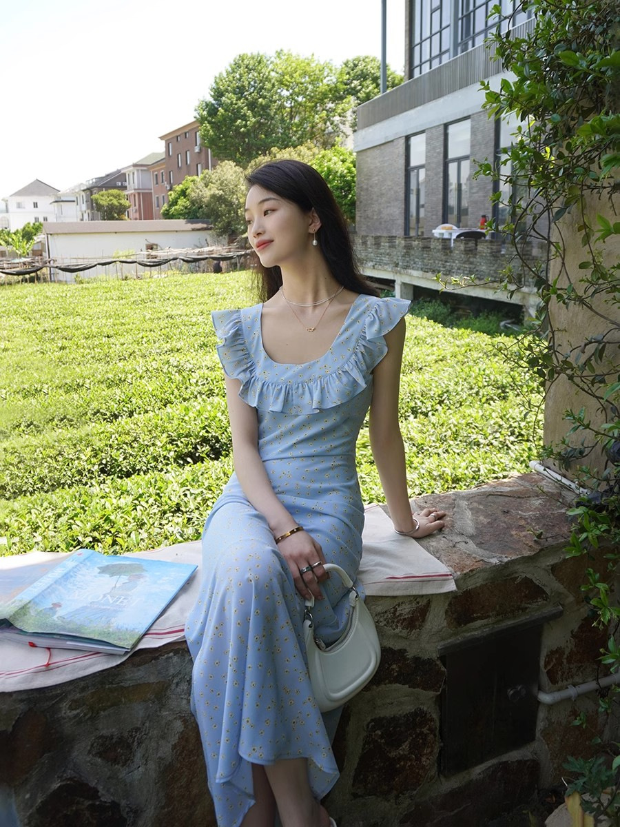 法式复古碎花连衣裙中长款气质淑女方领荷叶边裙子女夏季过膝长裙