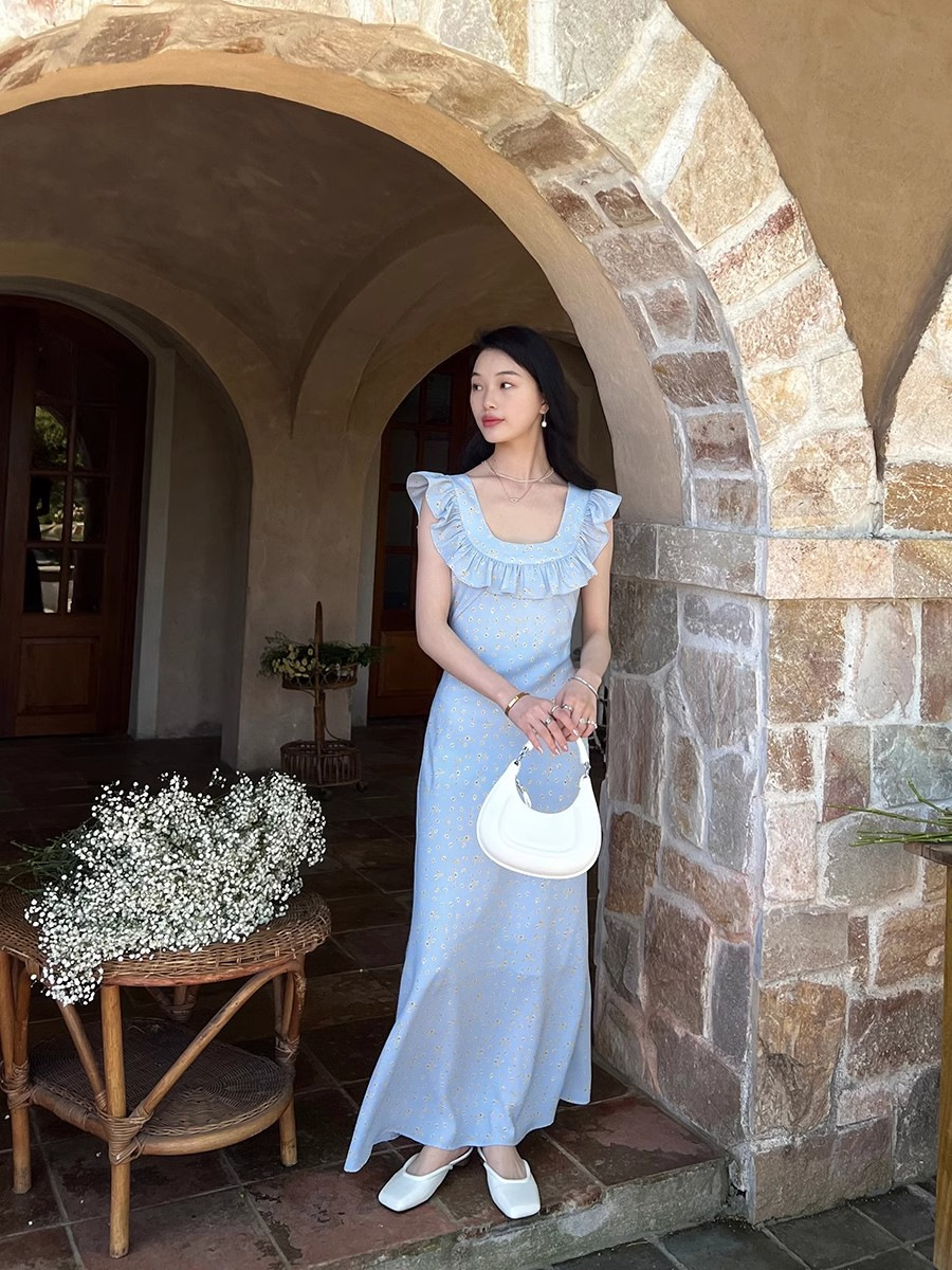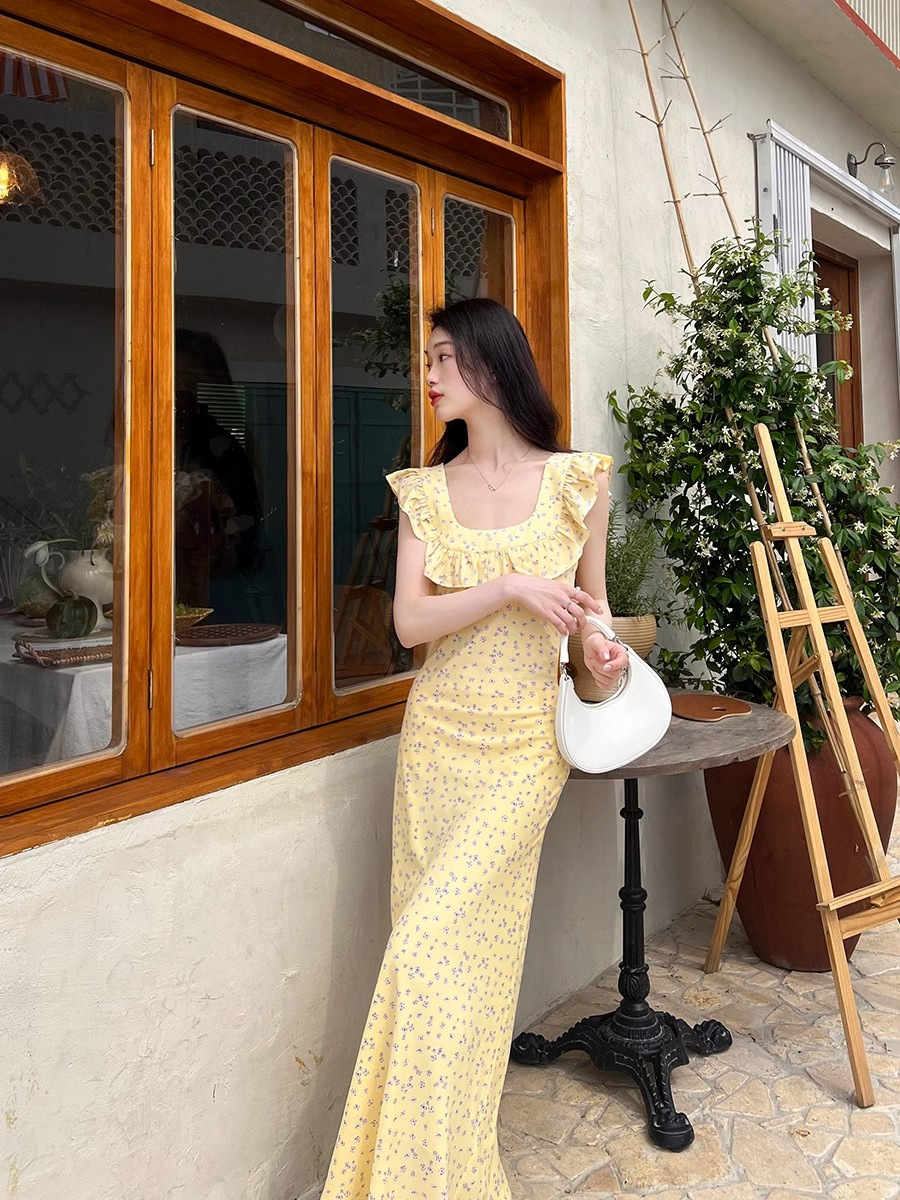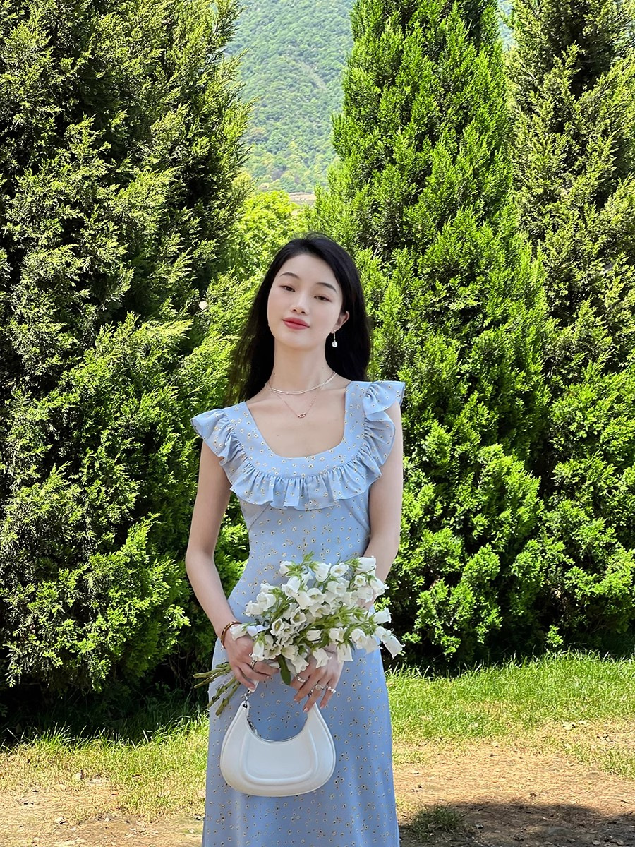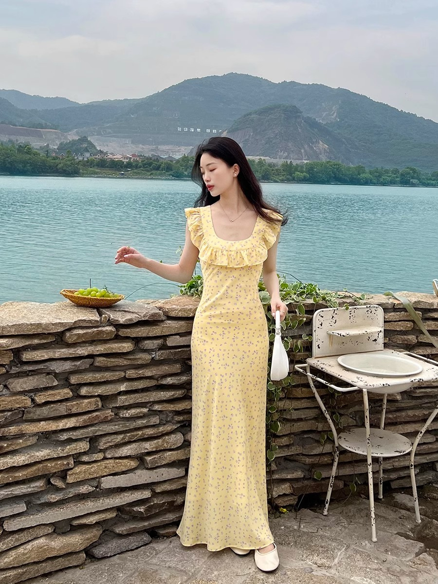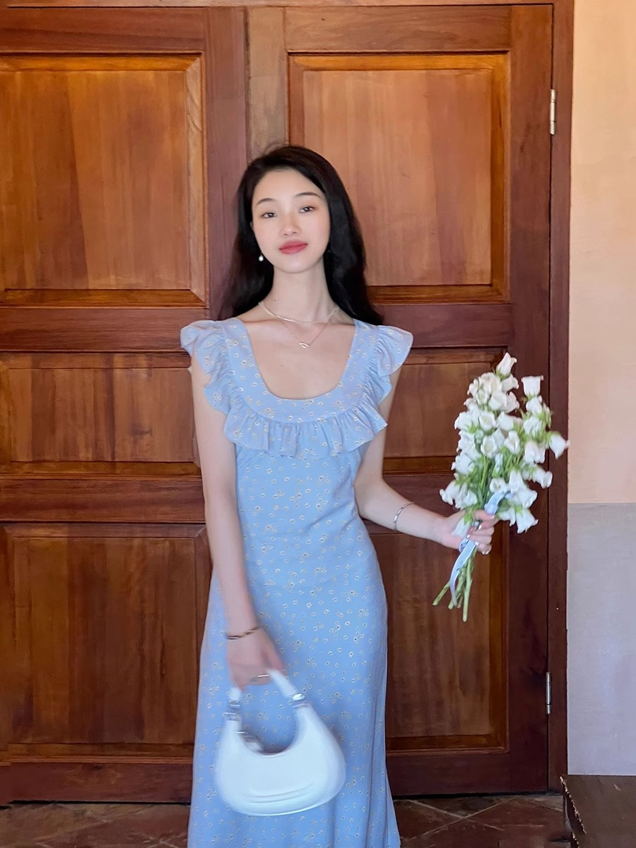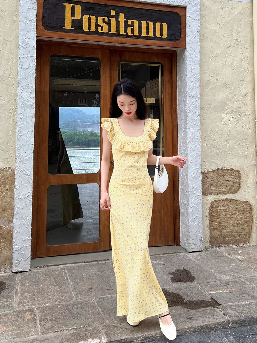 法式复古碎花连衣裙中长款气质淑女方领荷叶边裙子女夏季过膝长裙