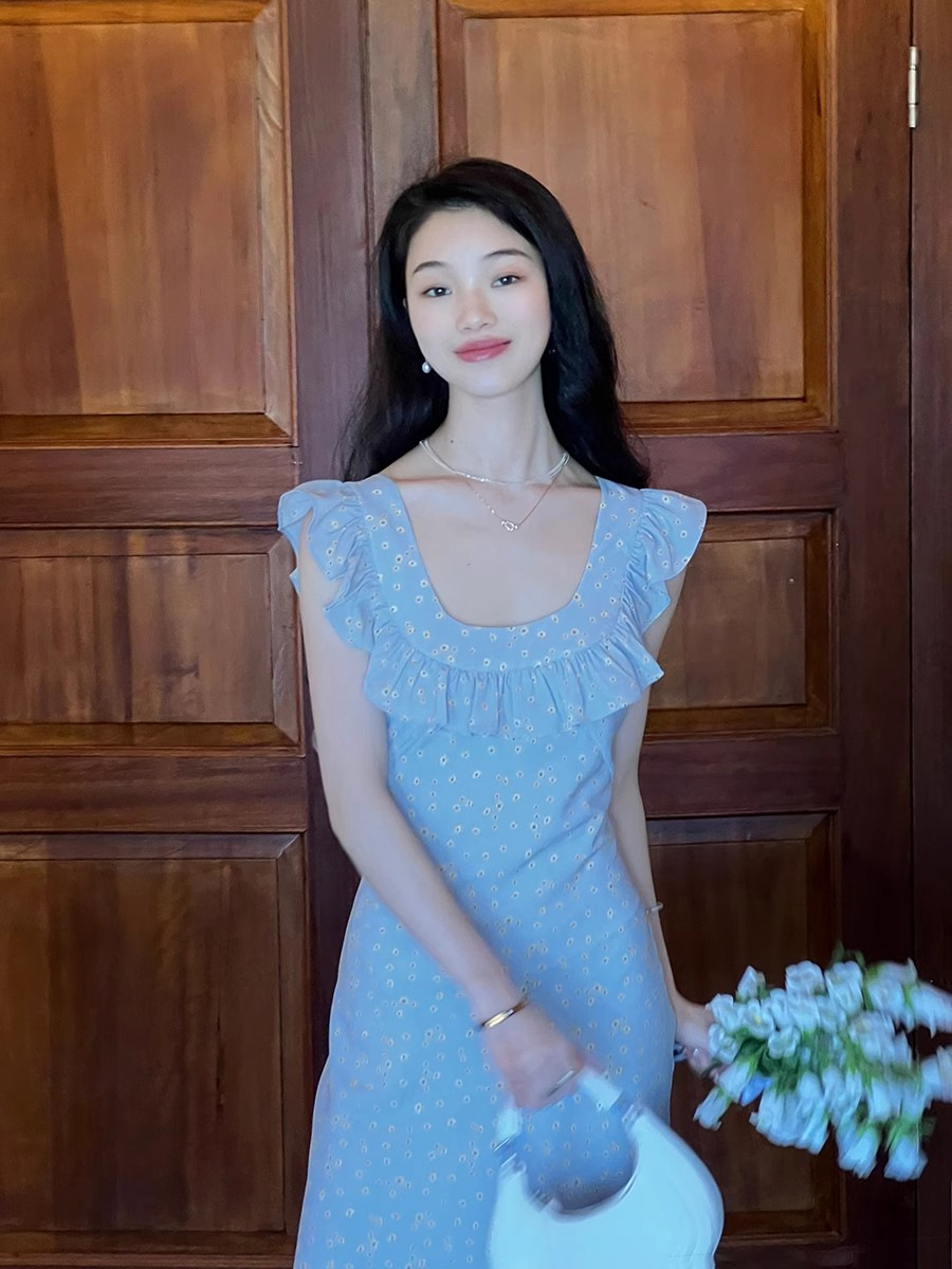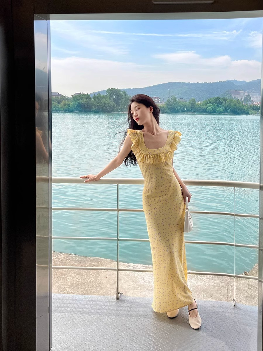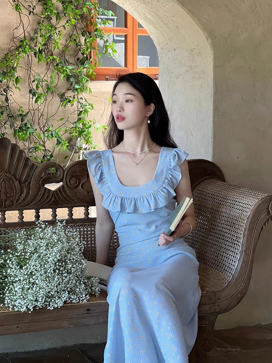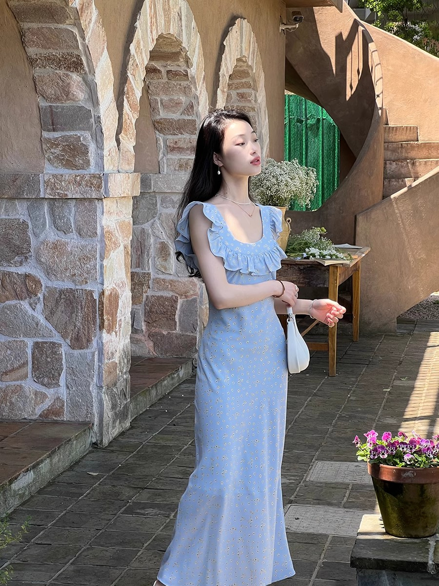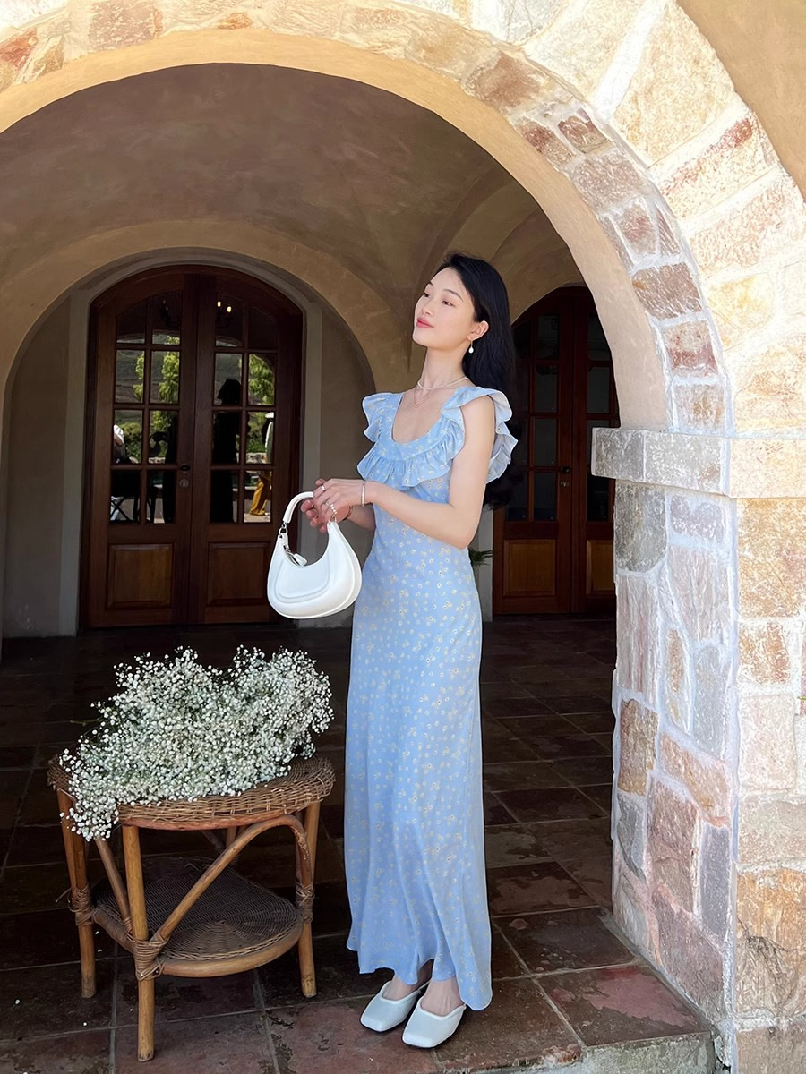 法式复古碎花连衣裙中长款气质淑女方领荷叶边裙子女夏季过膝长裙