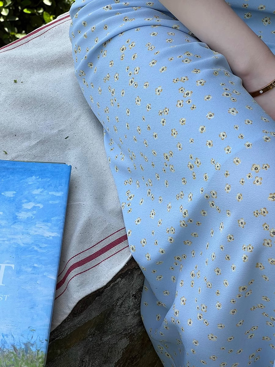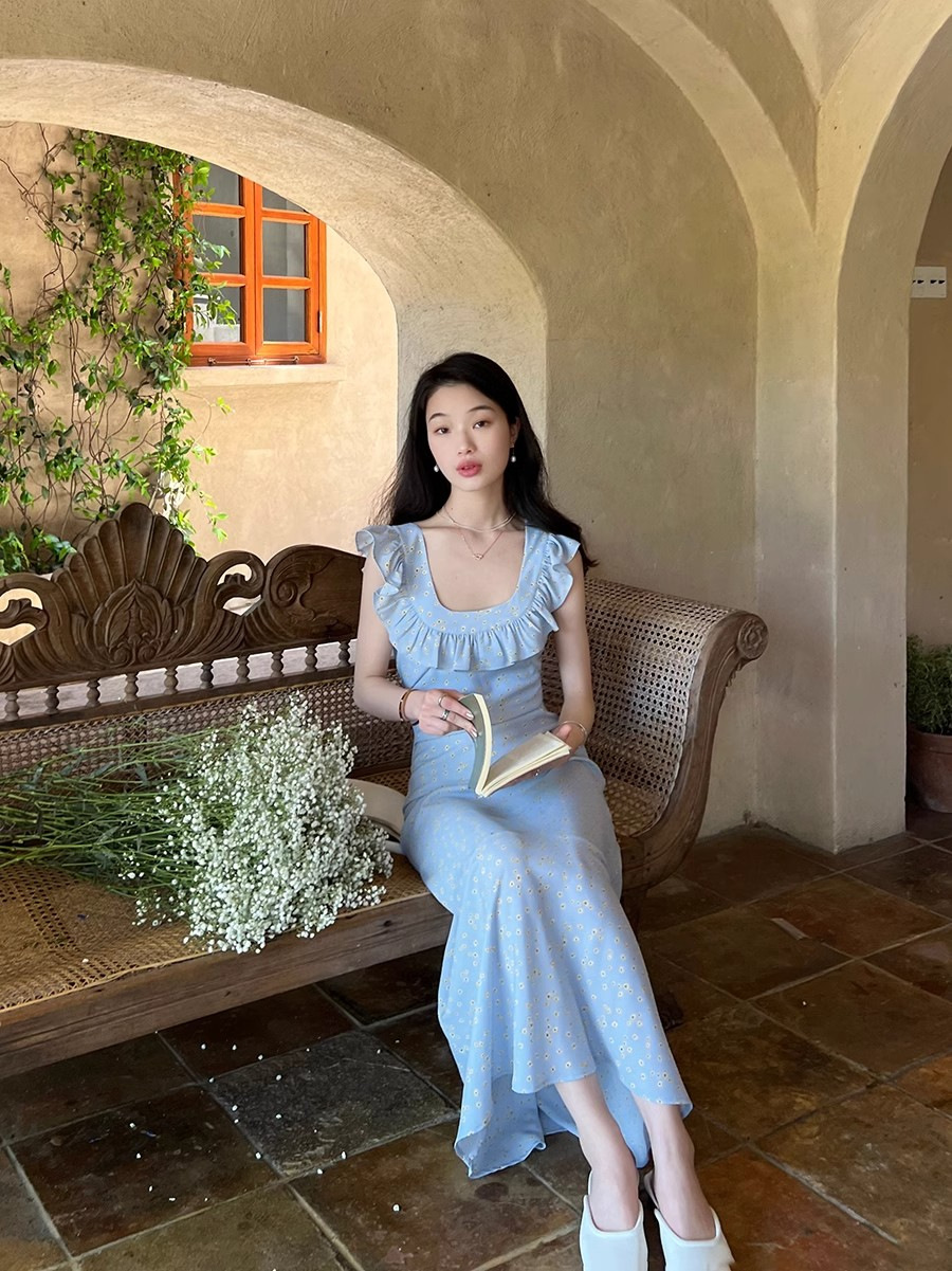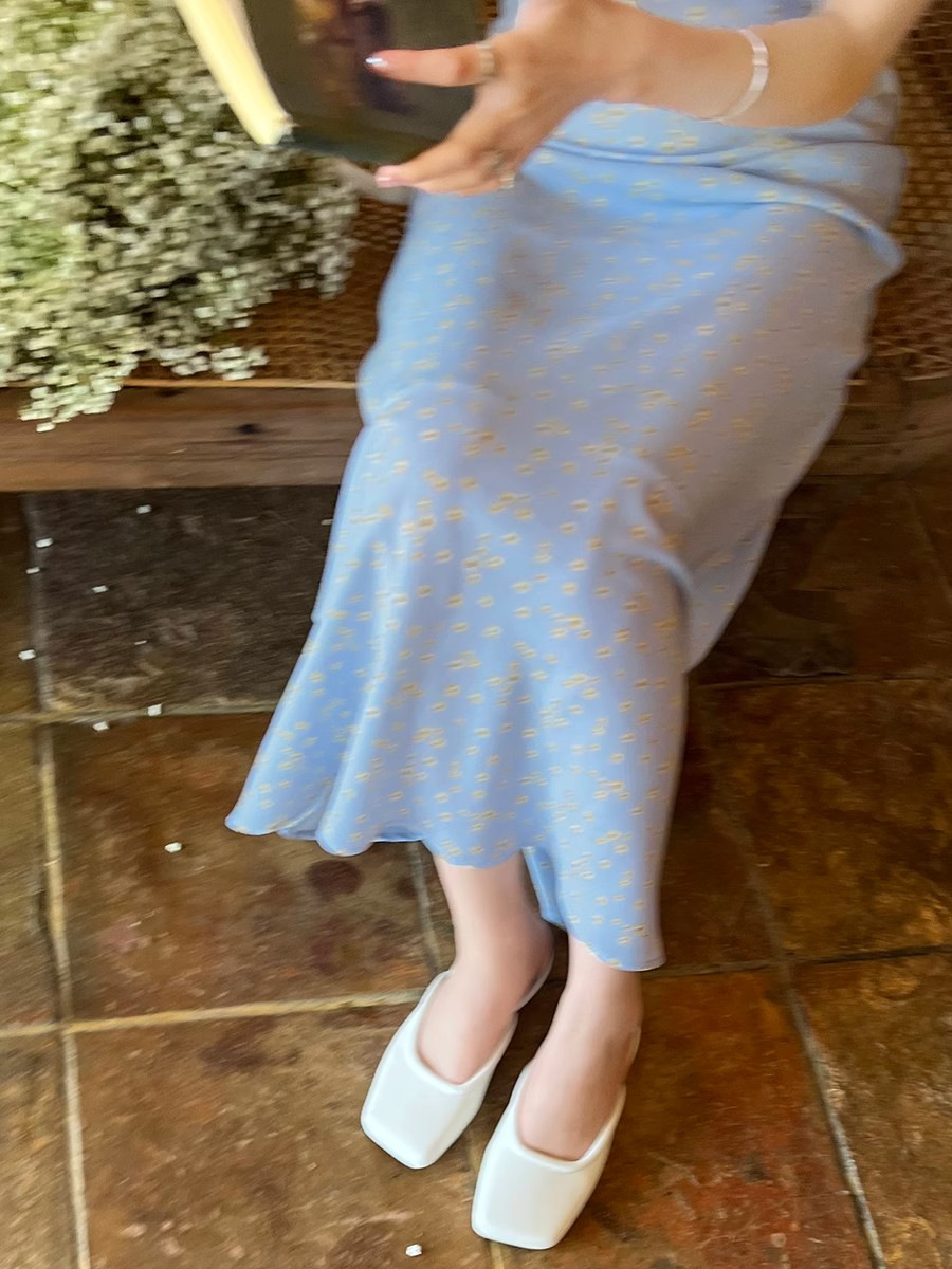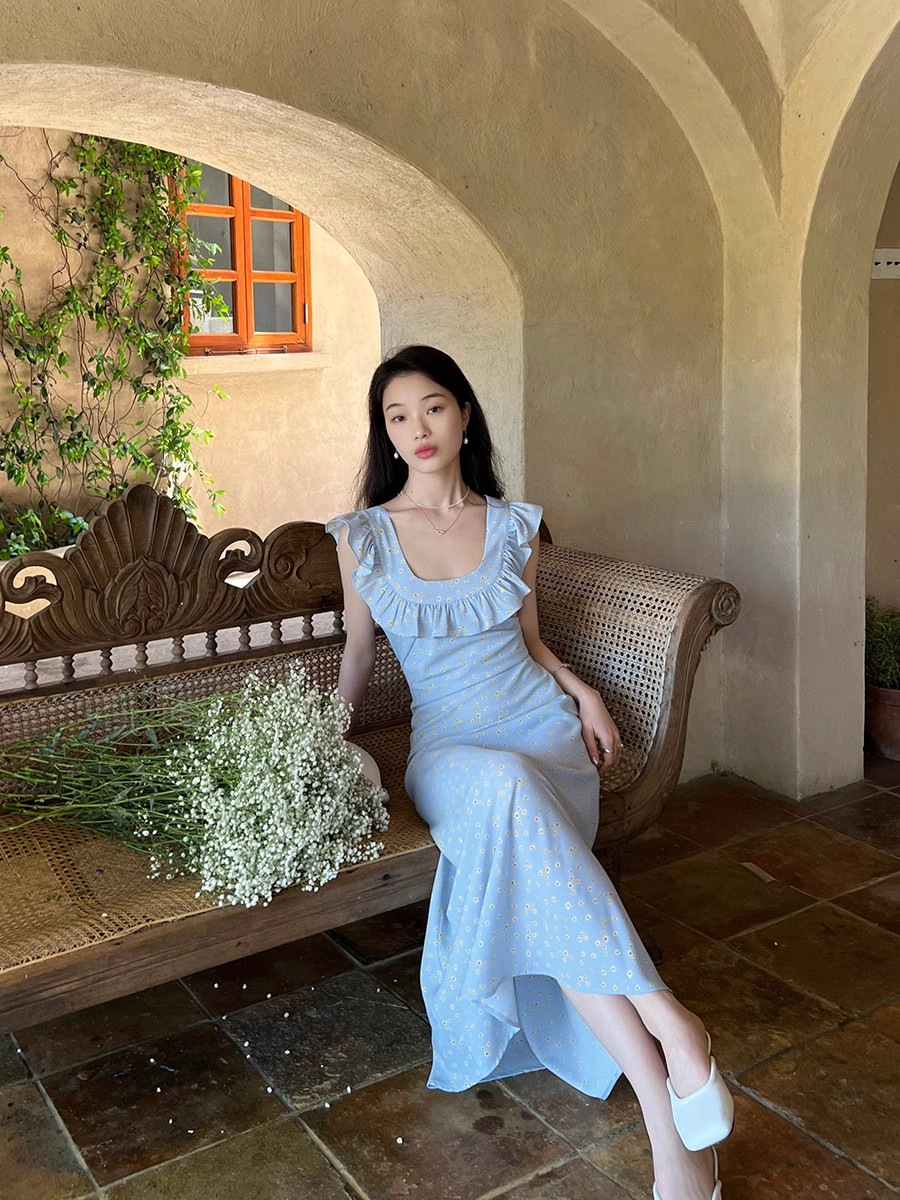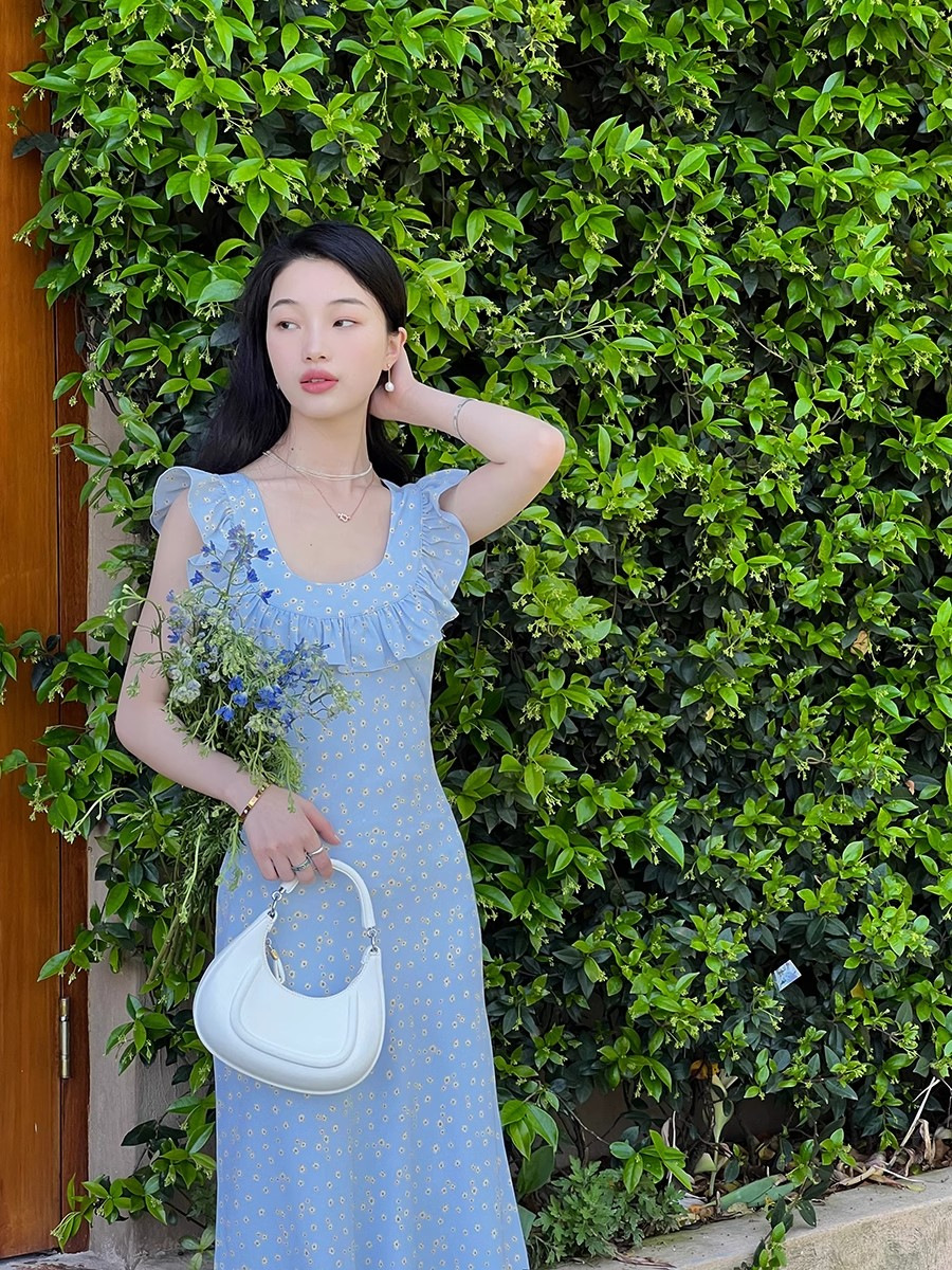 法式复古碎花连衣裙中长款气质淑女方领荷叶边裙子女夏季过膝长裙