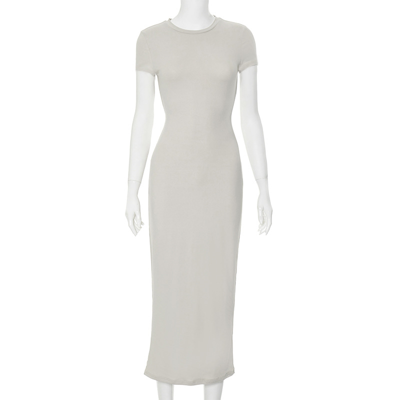 M23DS760欧美女装2024亚马逊新款时尚纯色圆领修身短袖连衣裙批发