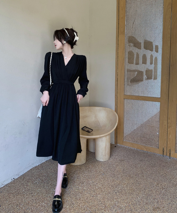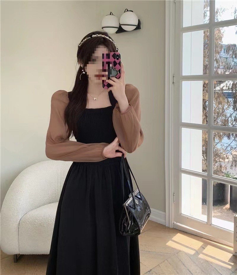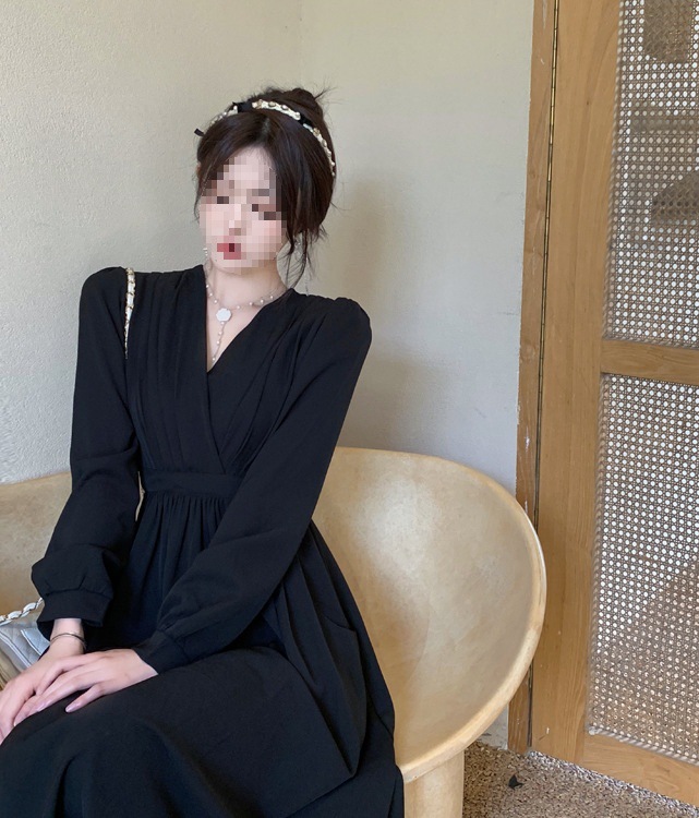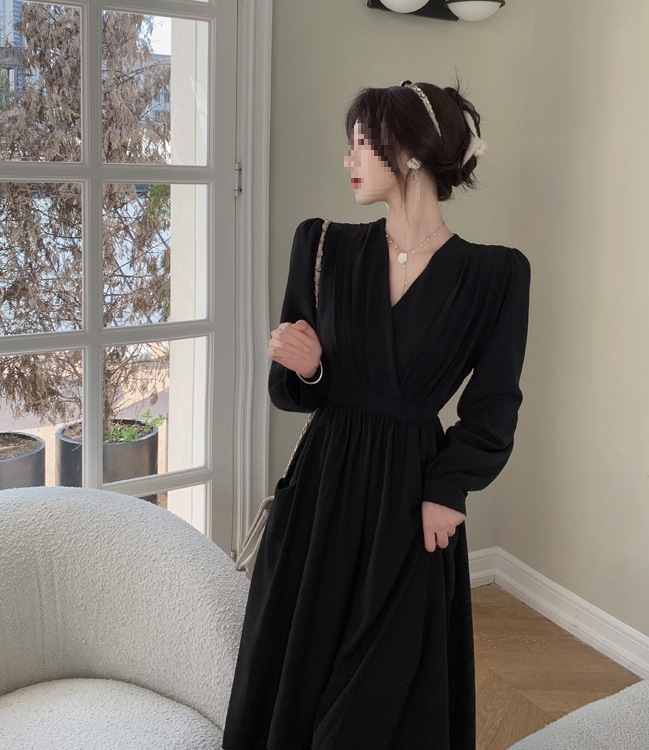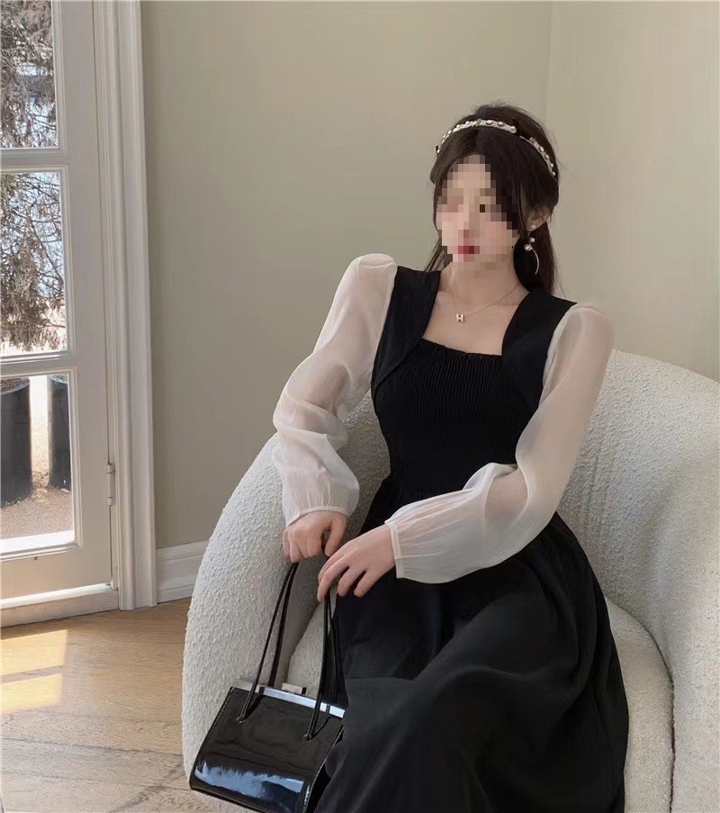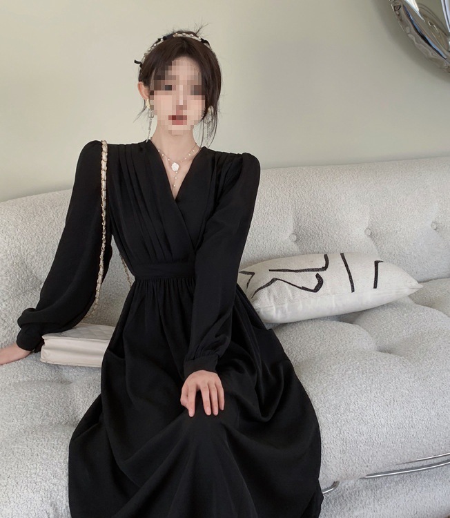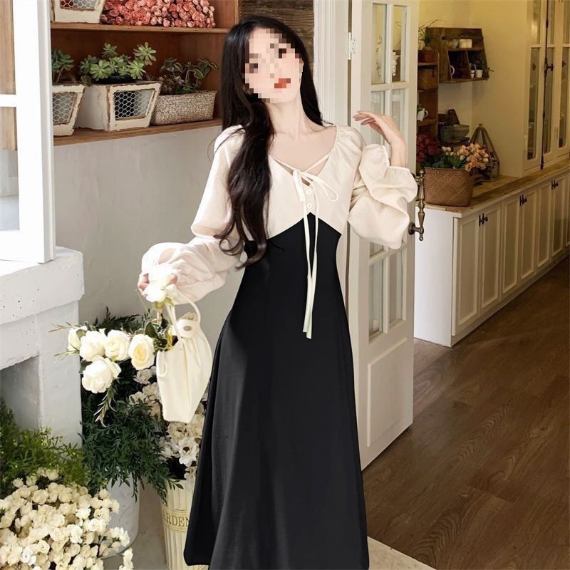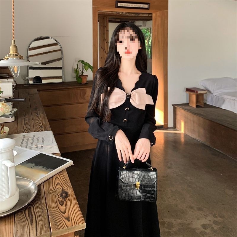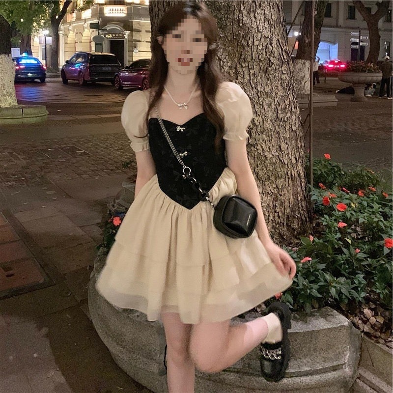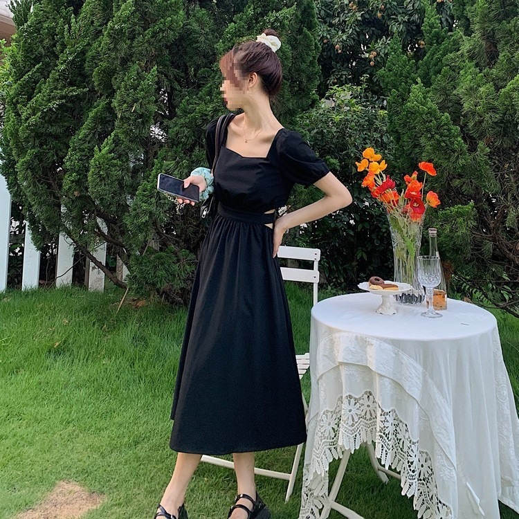 裙子女夏新款黑色连衣裙法式减龄遮肚复古方领过膝收腰长款裙