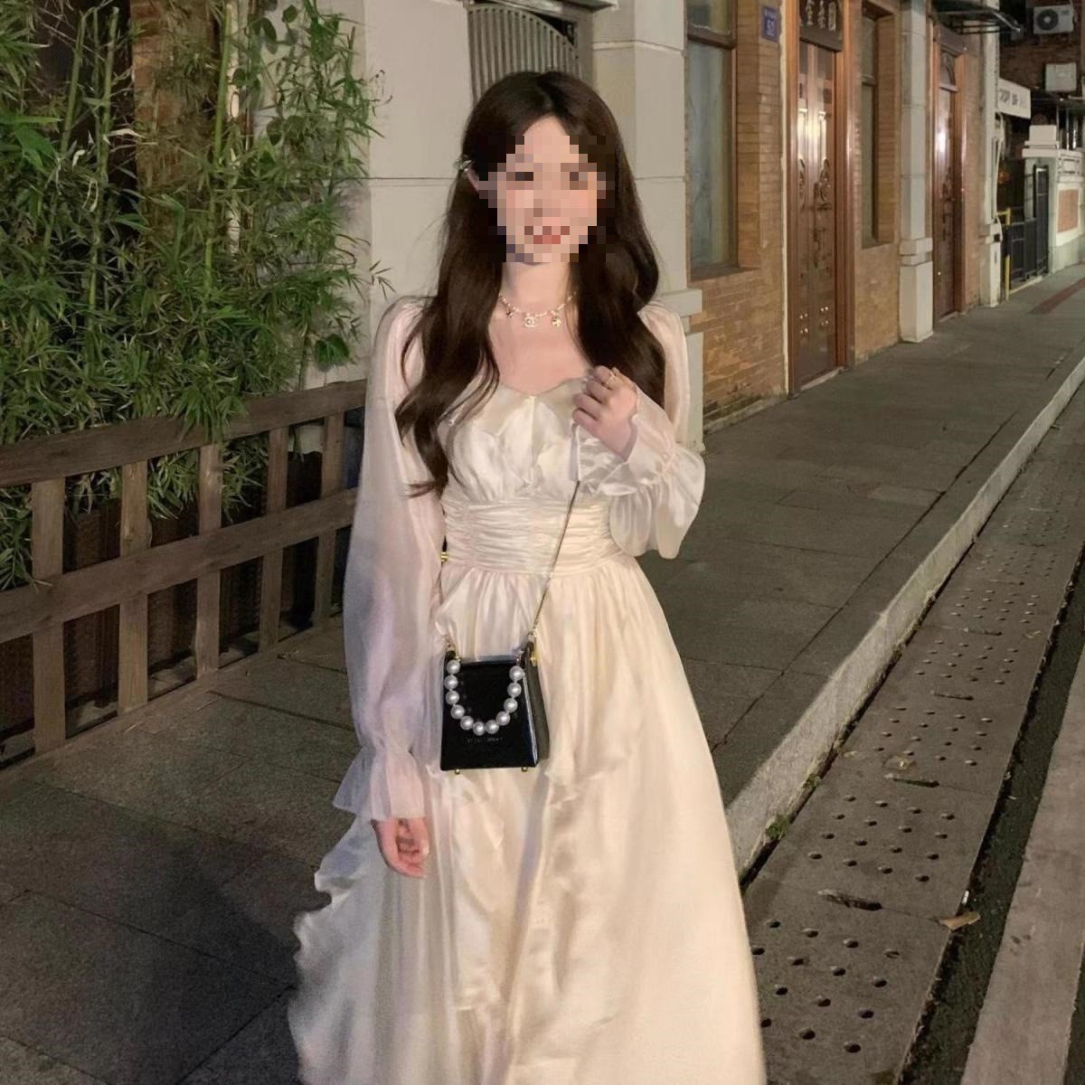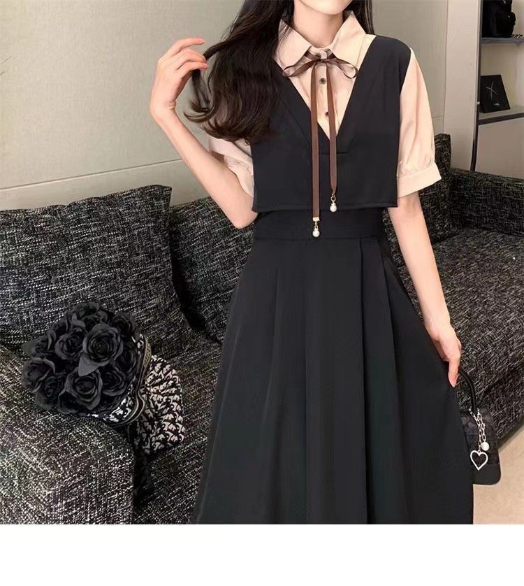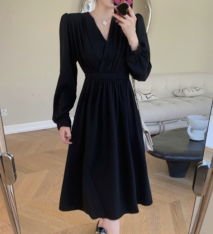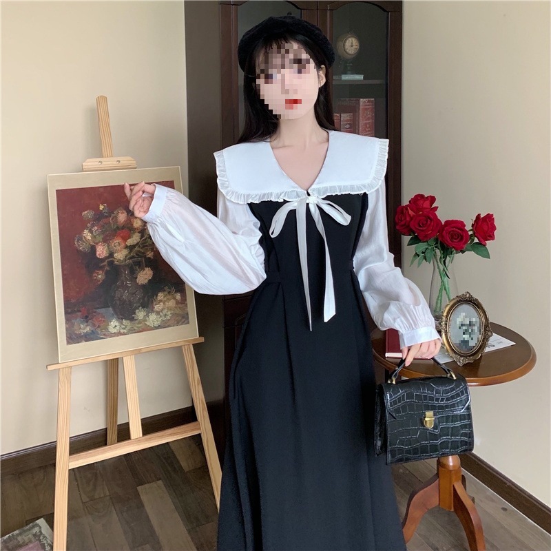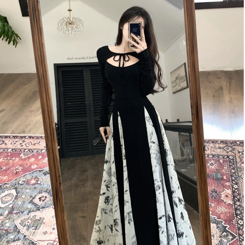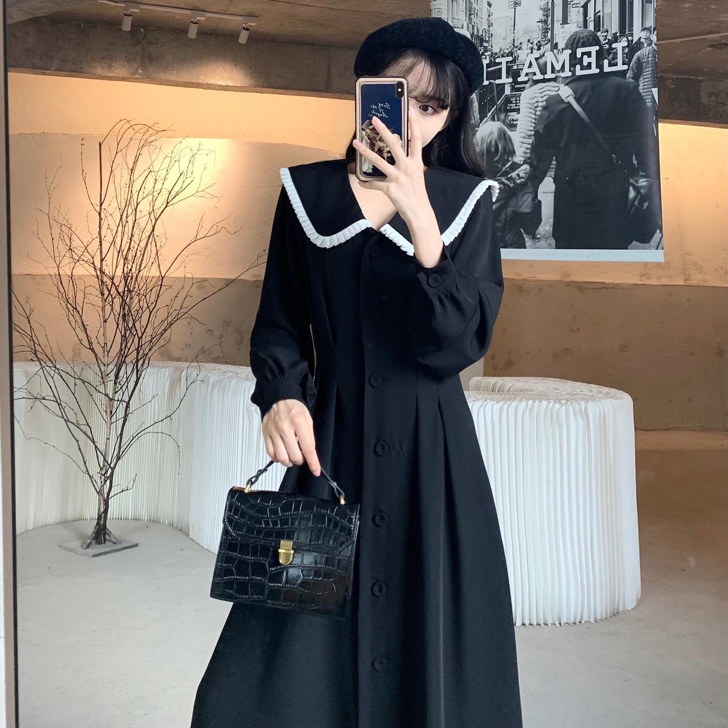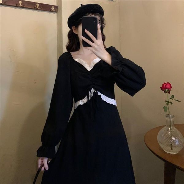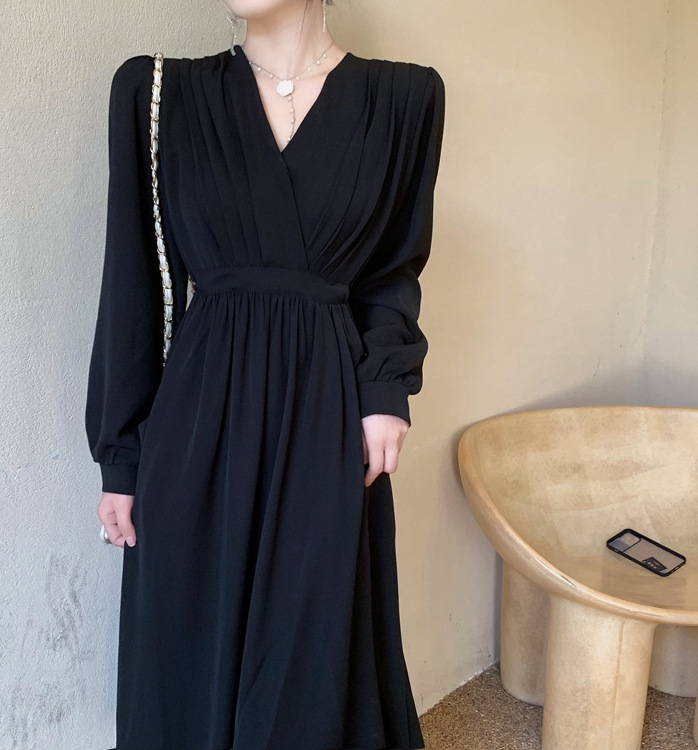 裙子女夏新款黑色连衣裙法式减龄遮肚复古方领过膝收腰长款裙