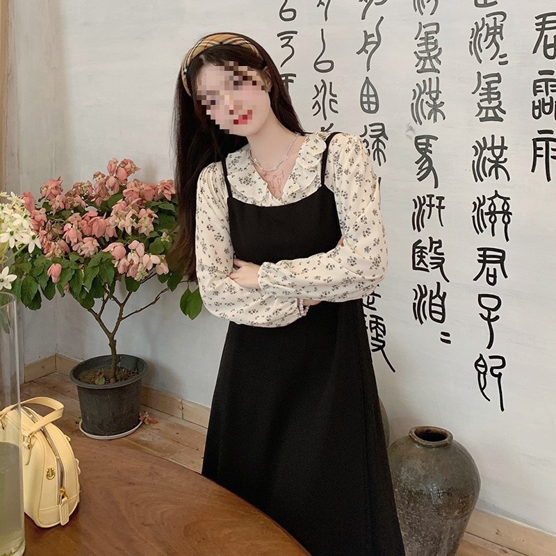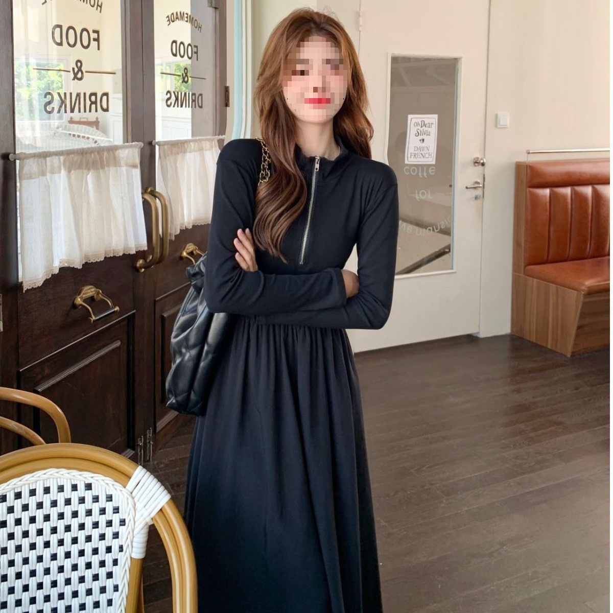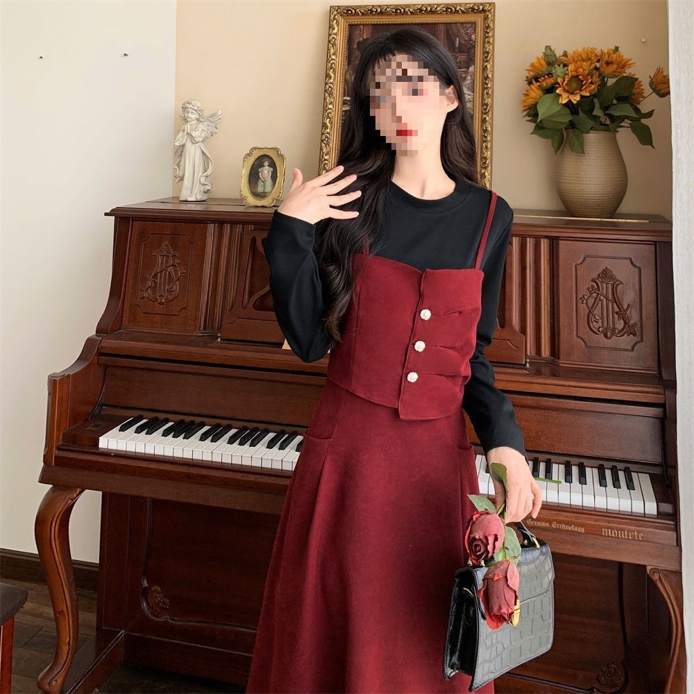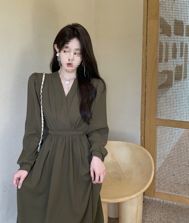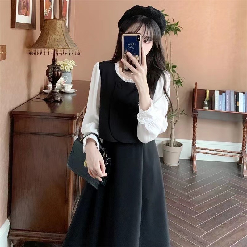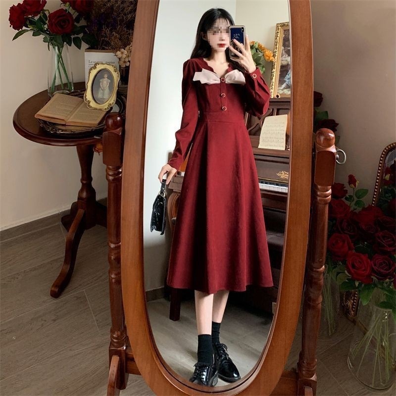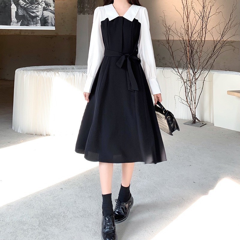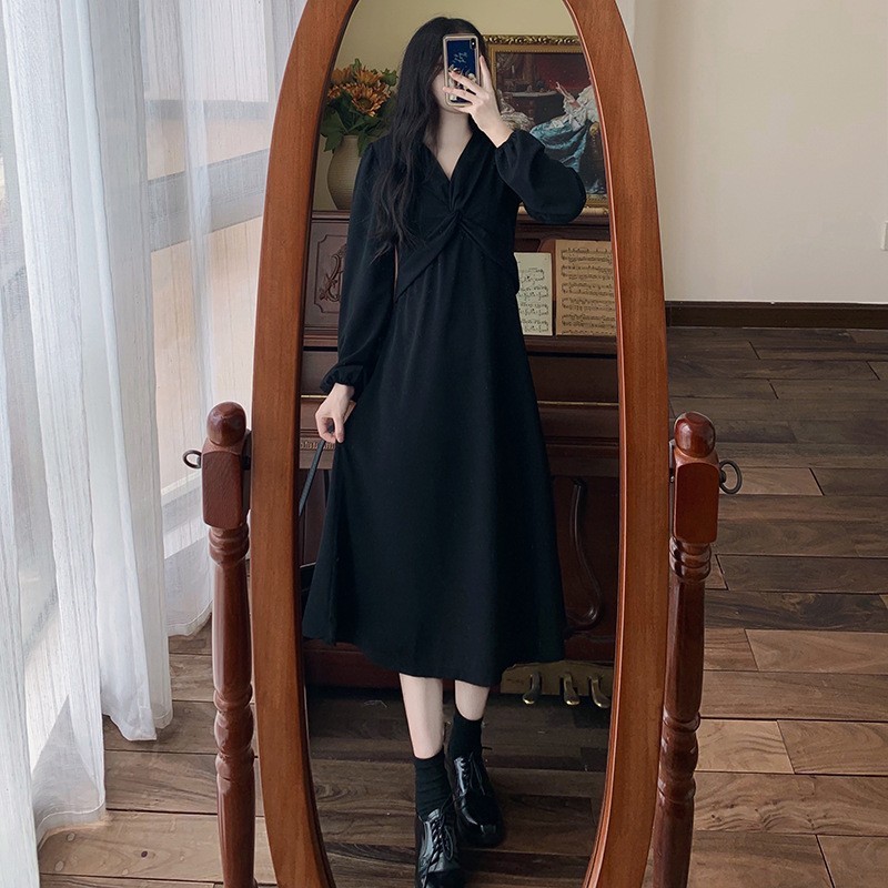 裙子女夏新款黑色连衣裙法式减龄遮肚复古方领过膝收腰长款裙