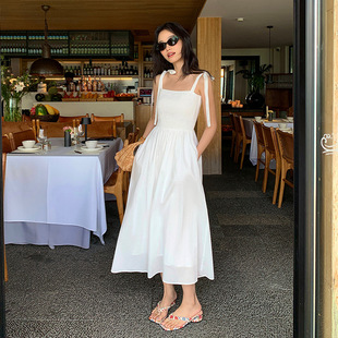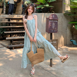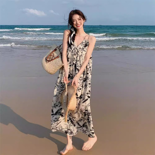 2024夏新款度假风挂脖连衣裙女宽松垂感仙女裙显瘦小心机露肩长裙