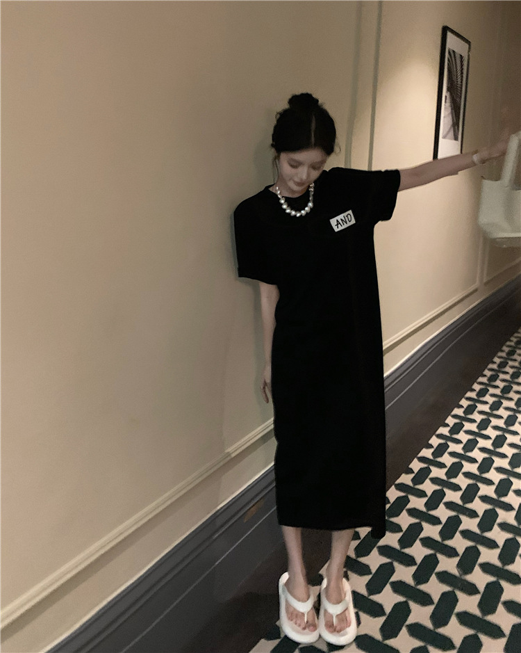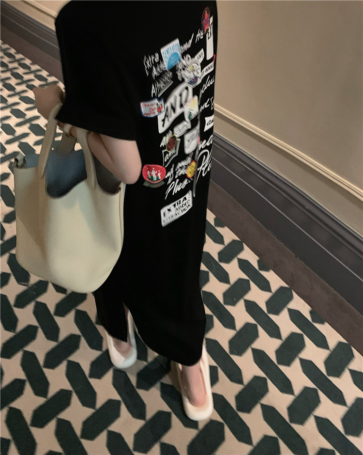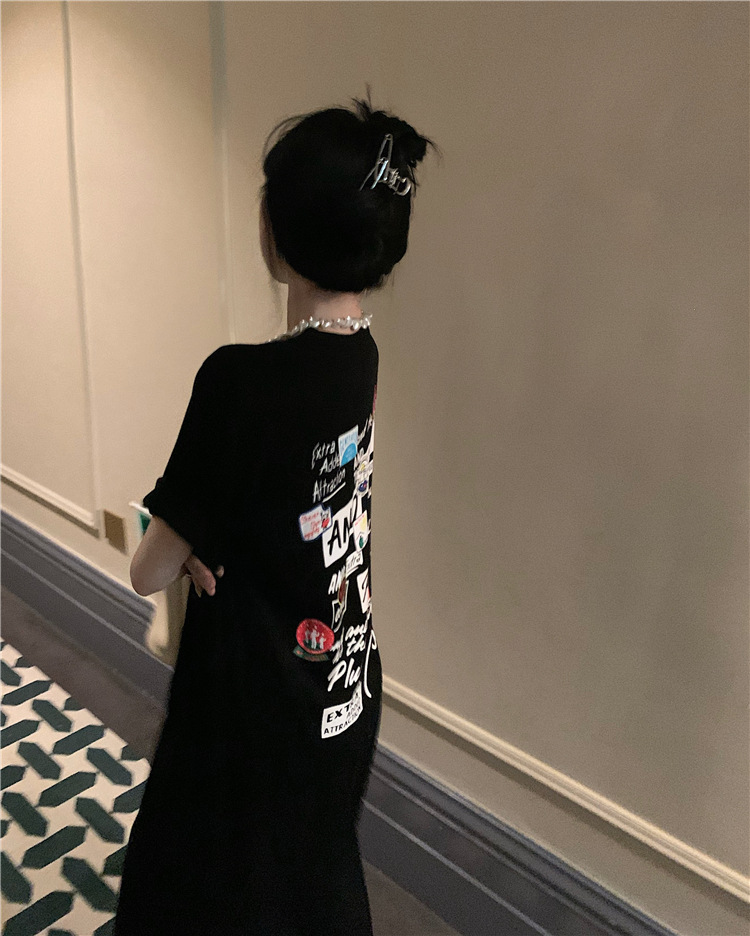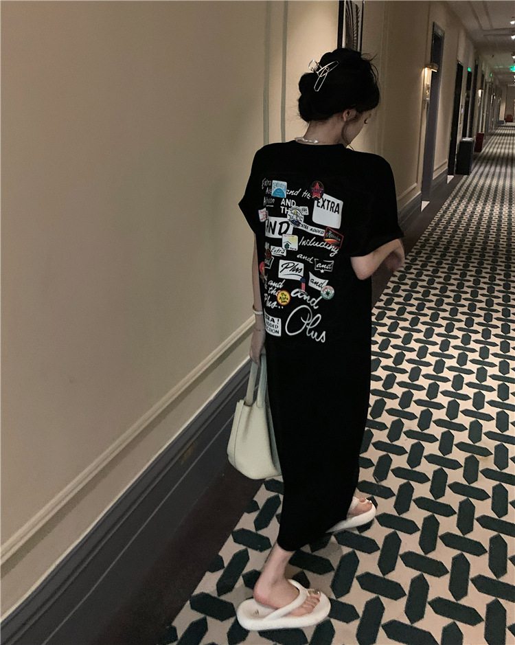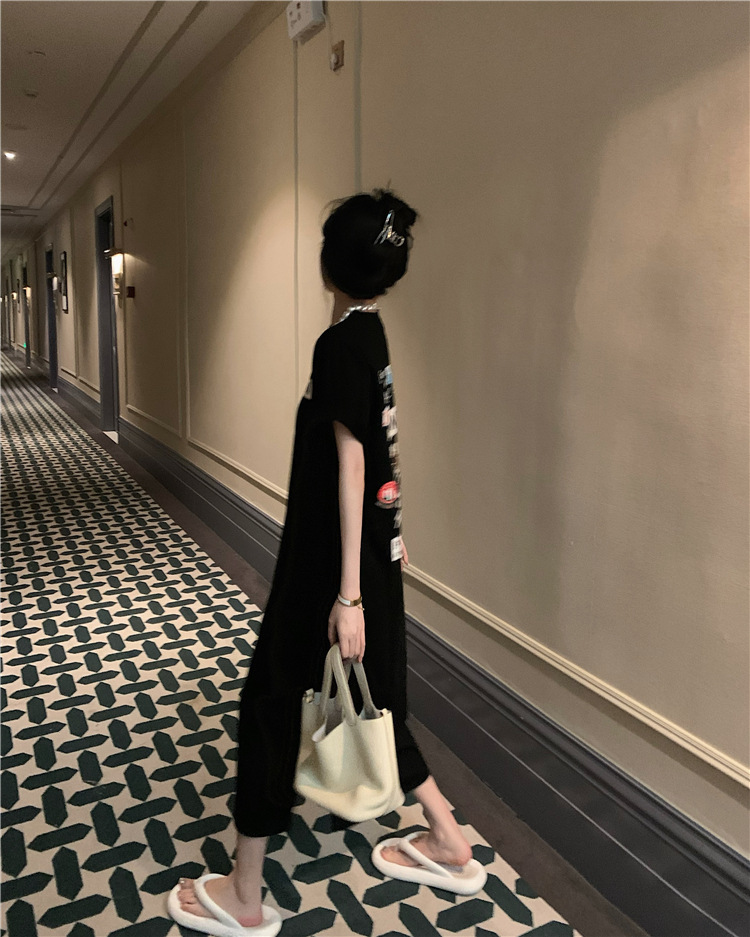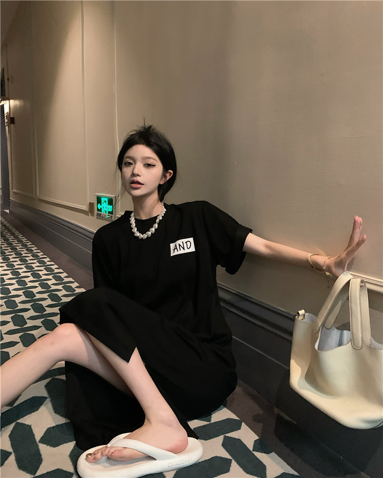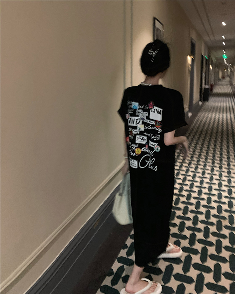 韩系chic黑色印花T恤连衣裙女夏季2022年新款宽松开叉中长款裙子
