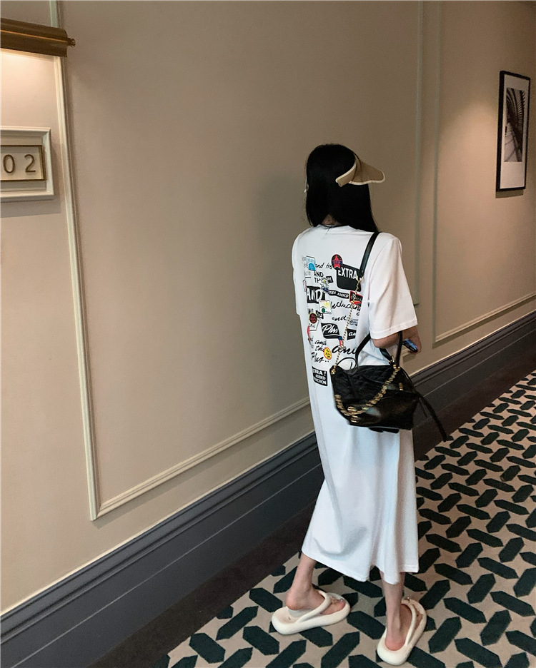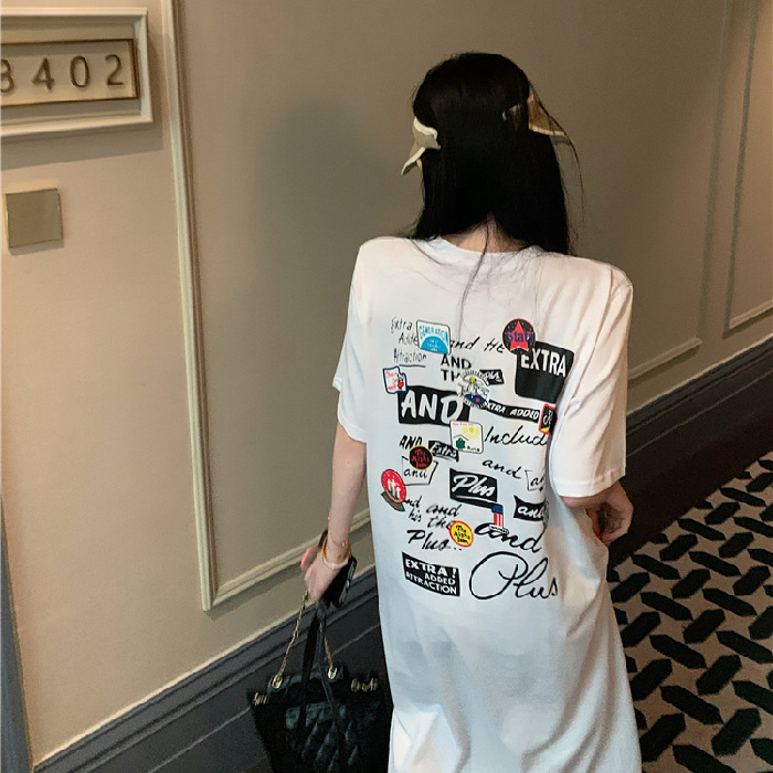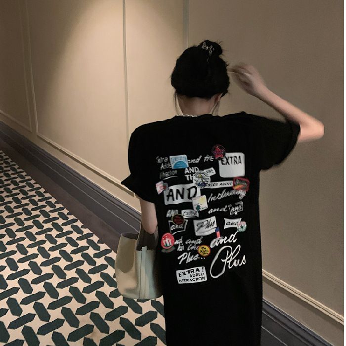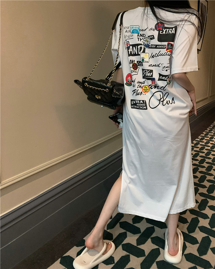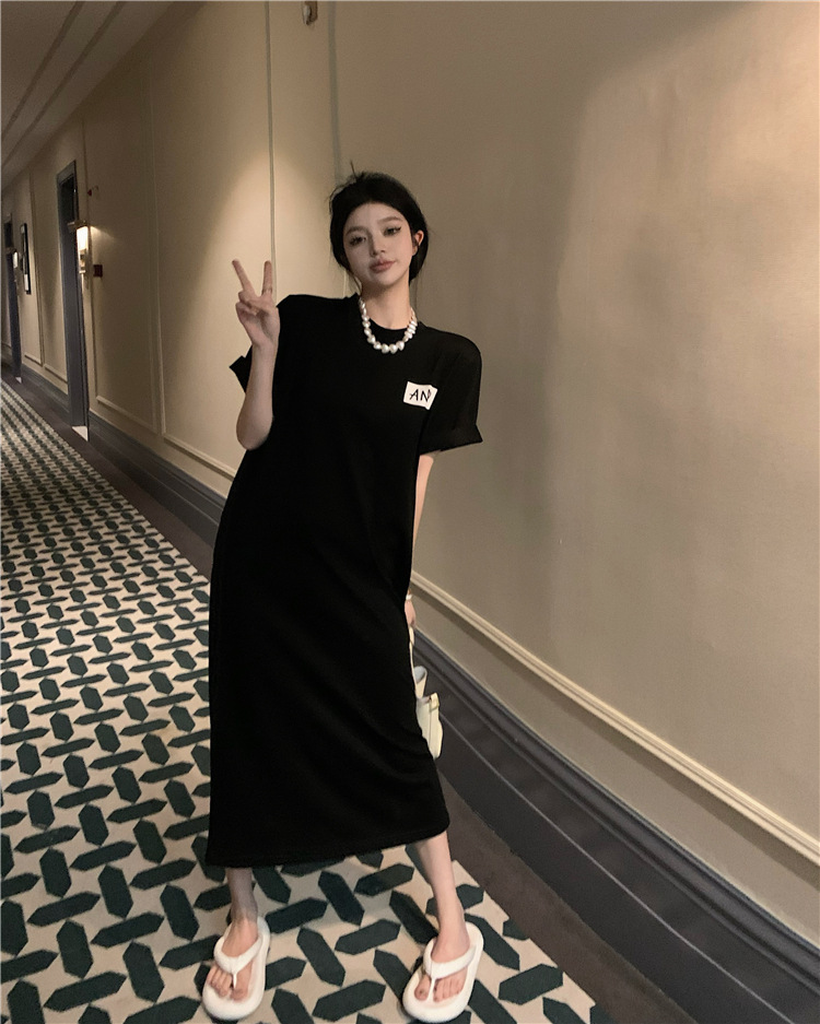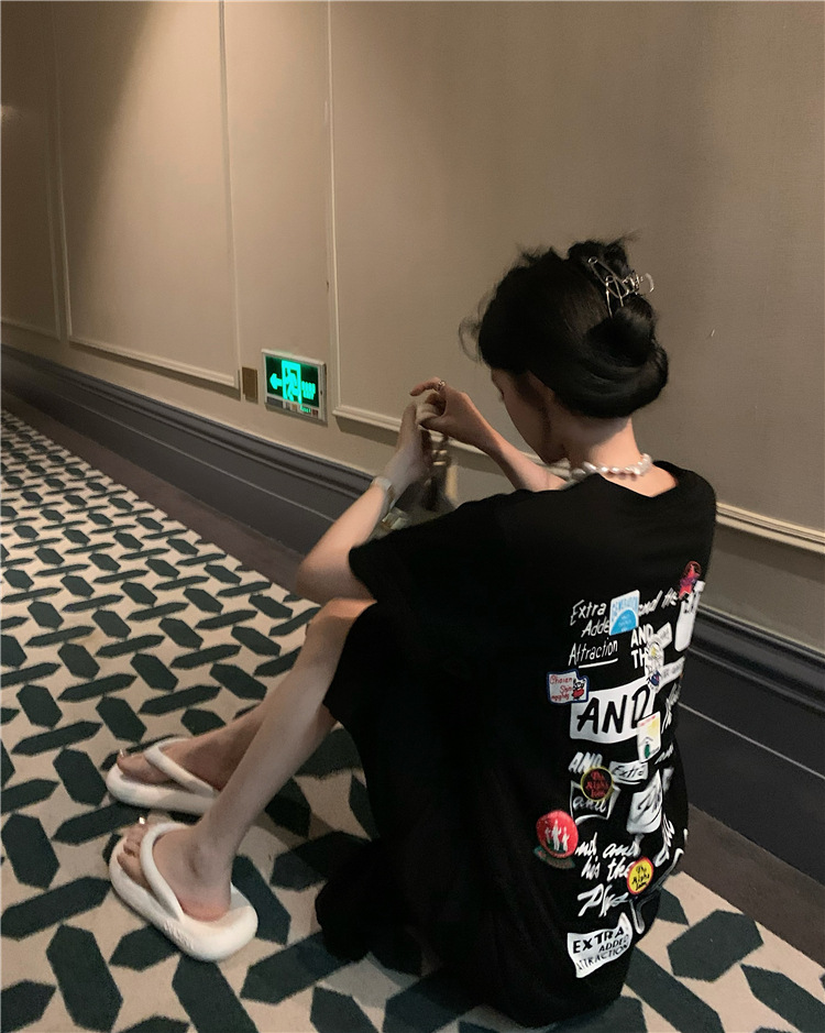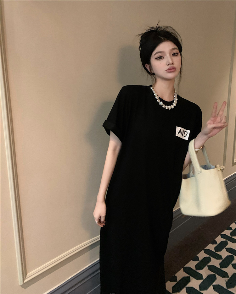 韩系chic黑色印花T恤连衣裙女夏季2022年新款宽松开叉中长款裙子