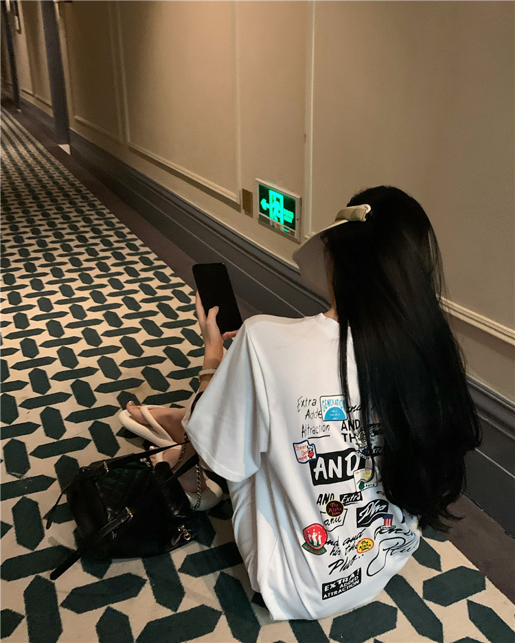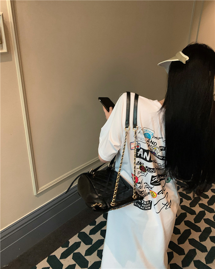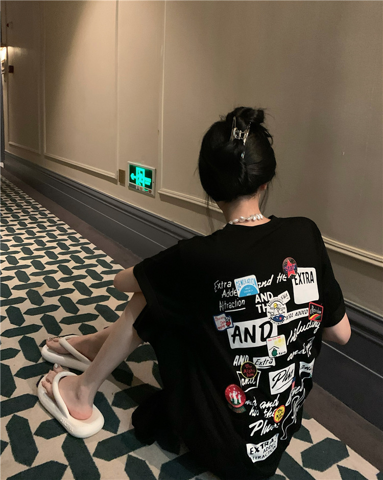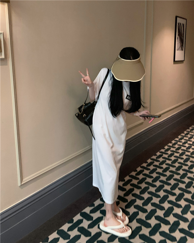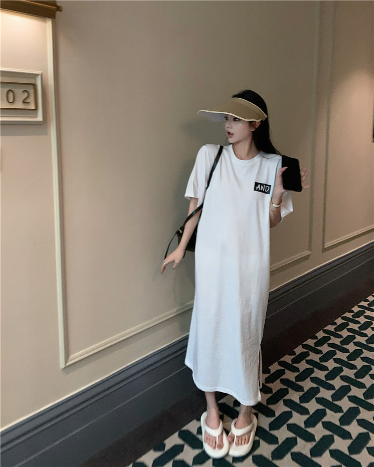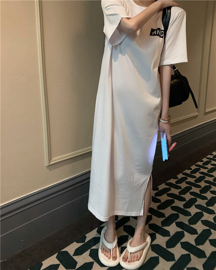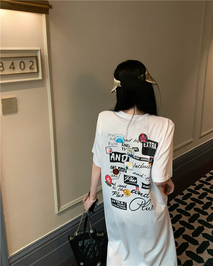 韩系chic黑色印花T恤连衣裙女夏季2022年新款宽松开叉中长款裙子