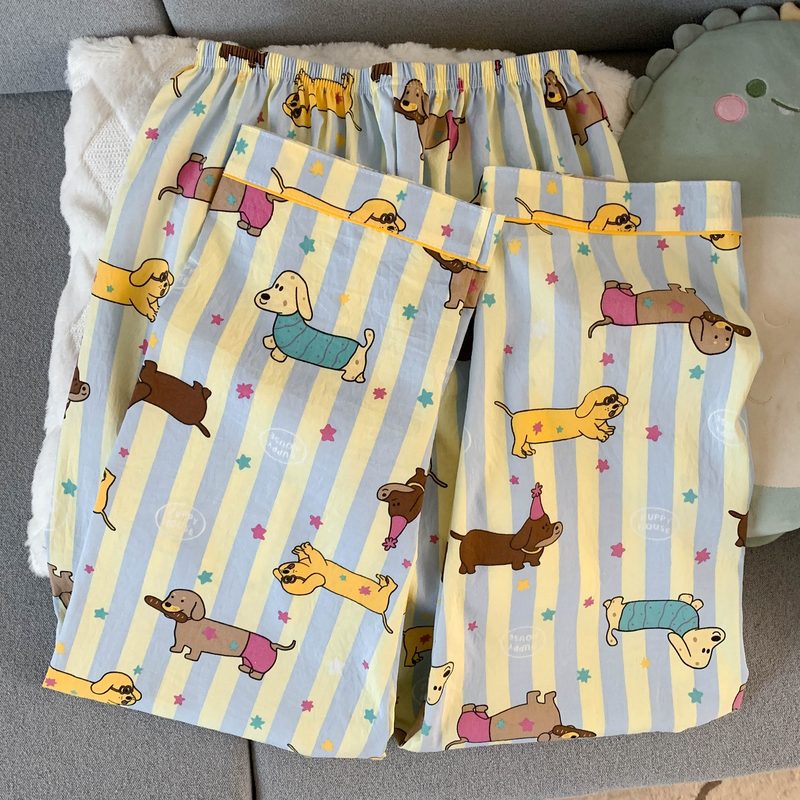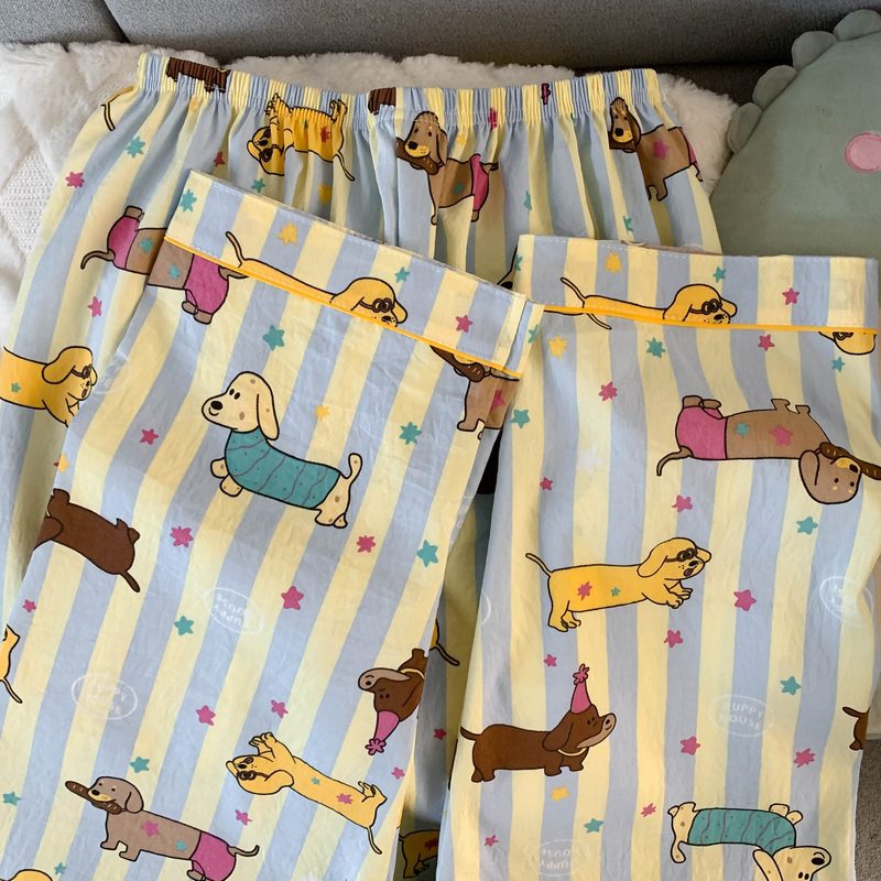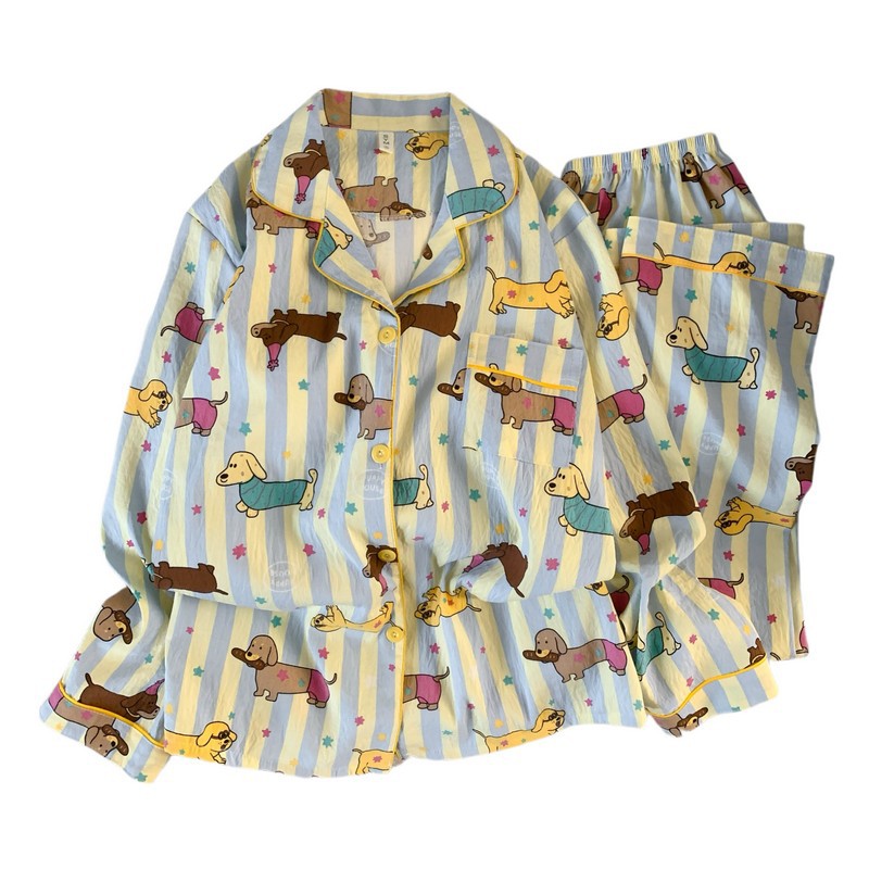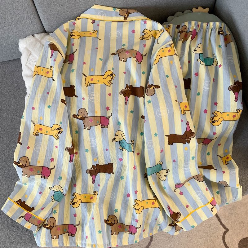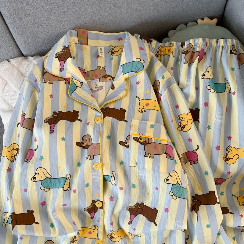厂家批发大码睡衣女卡通条纹眼镜小狗春秋季可爱少女家居服两件套