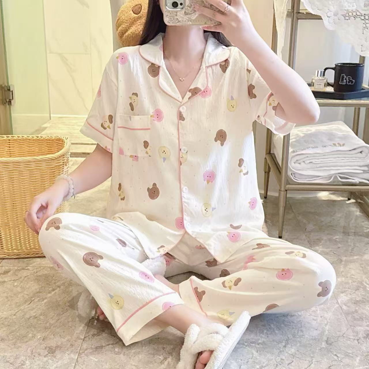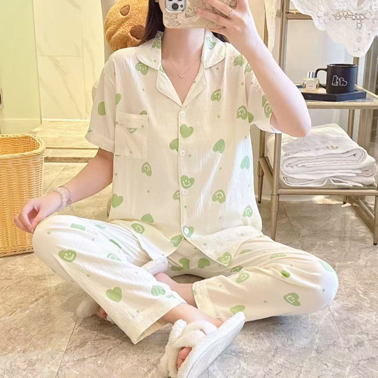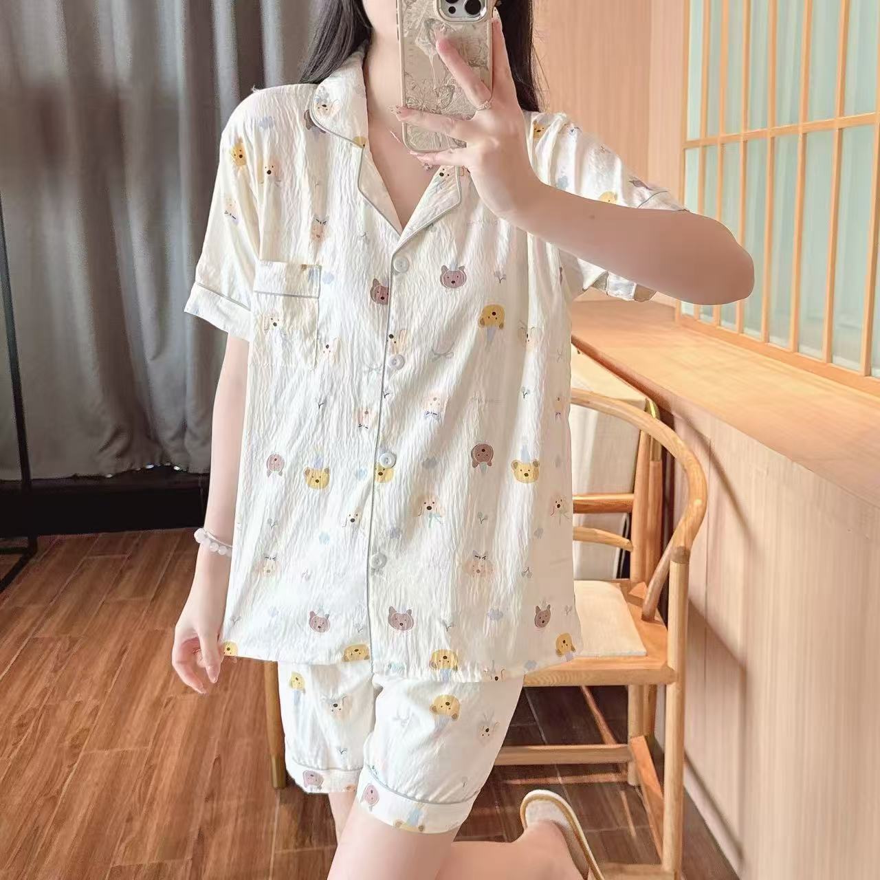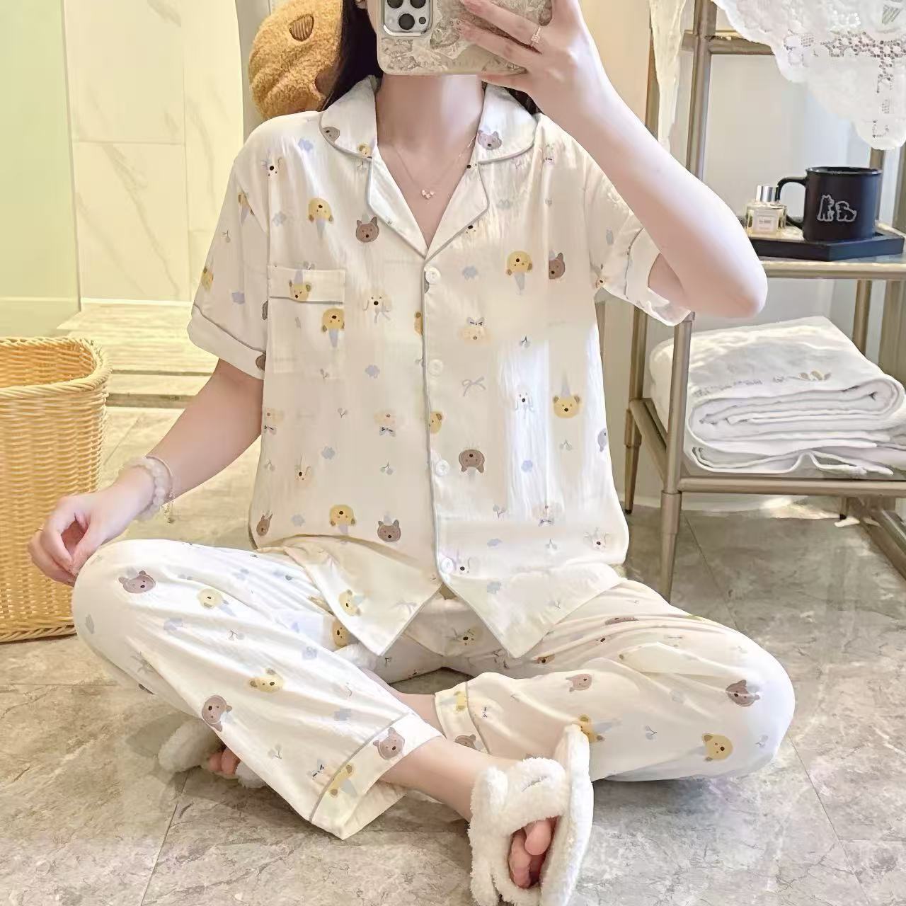 跨境专供春夏短袖云朵棉睡衣女短袖长裤皱布翻领宽松家居服女套装