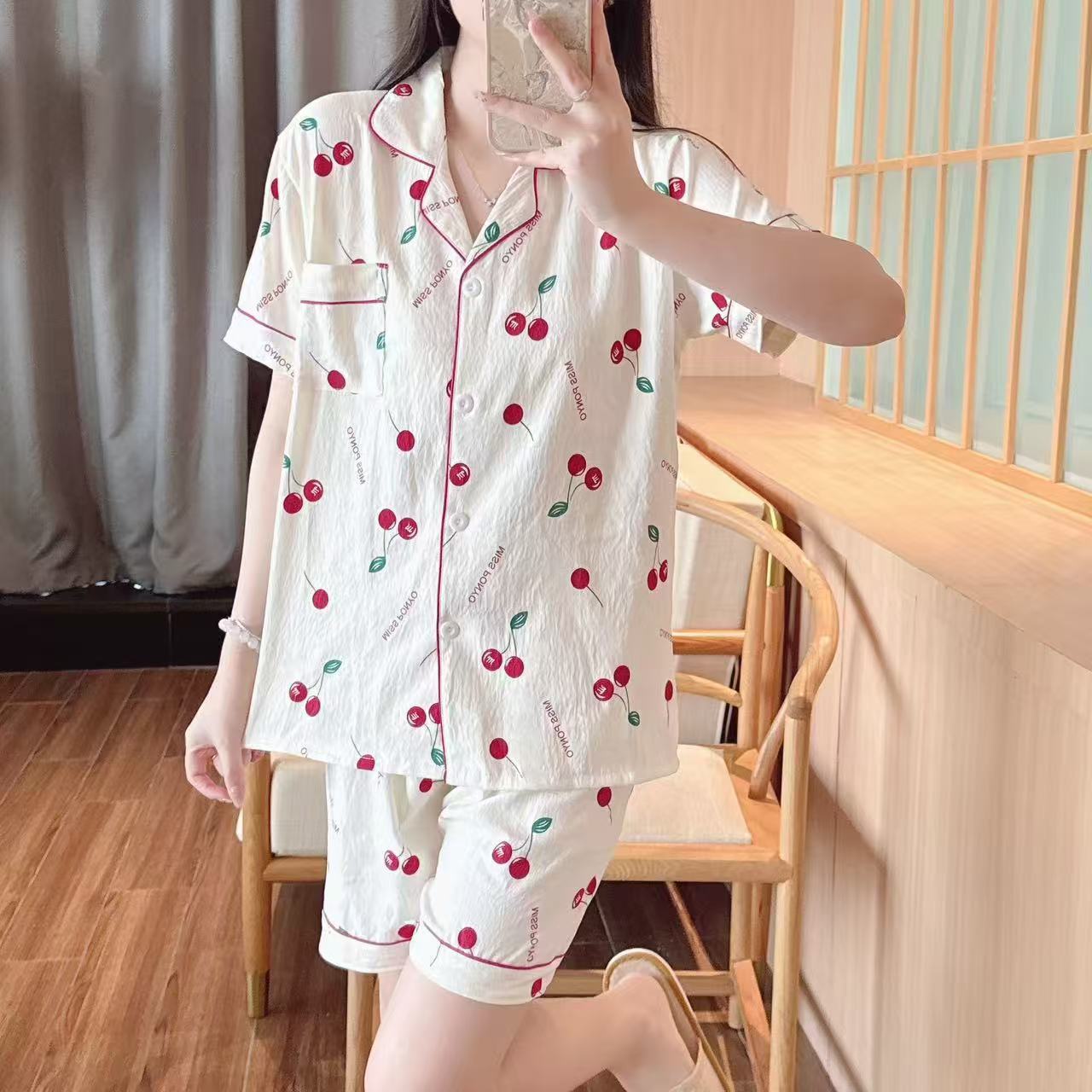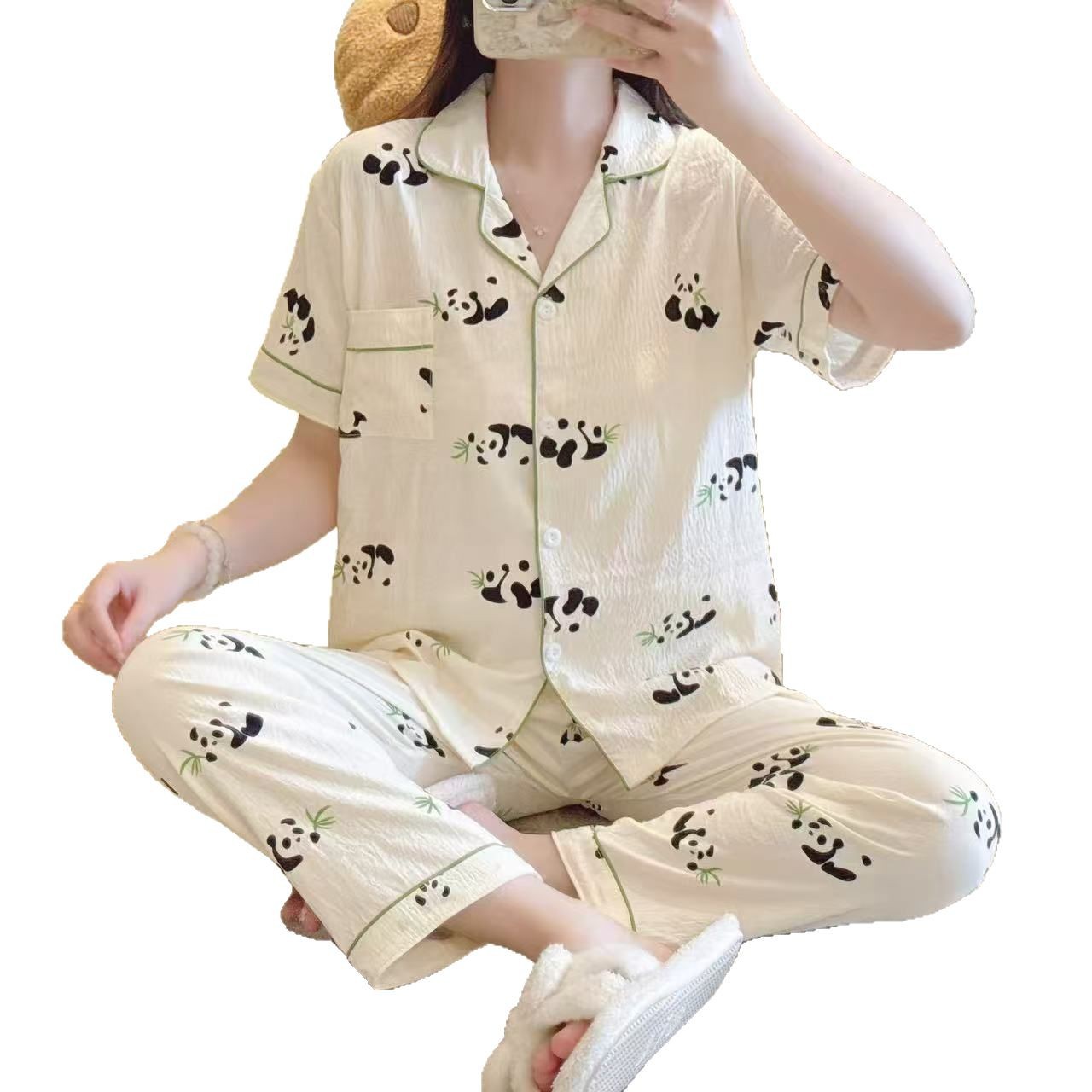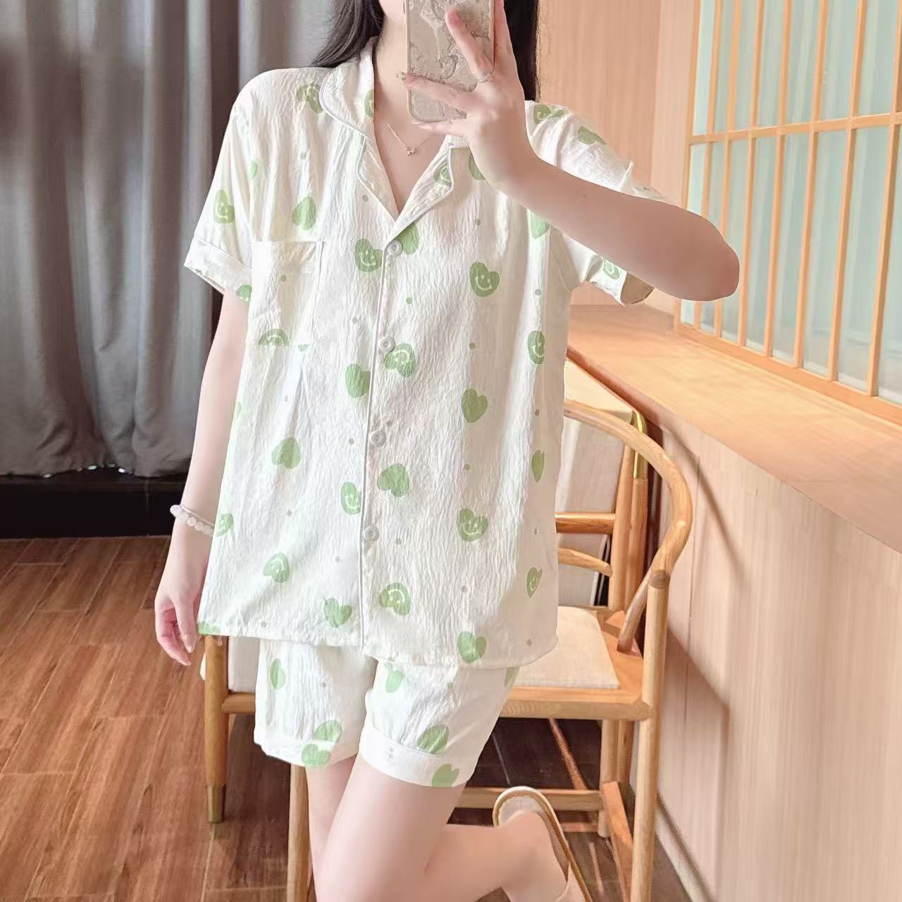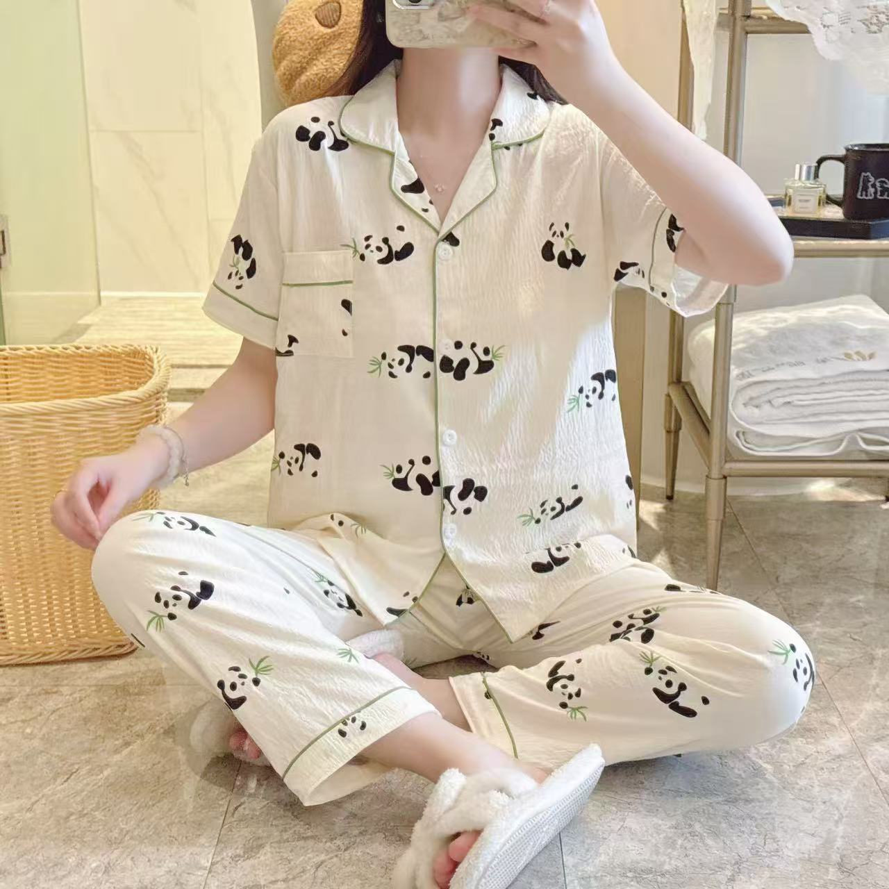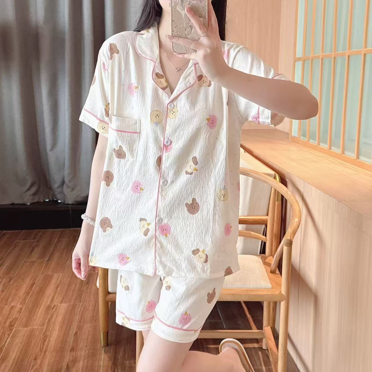 跨境专供春夏短袖云朵棉睡衣女短袖长裤皱布翻领宽松家居服女套装