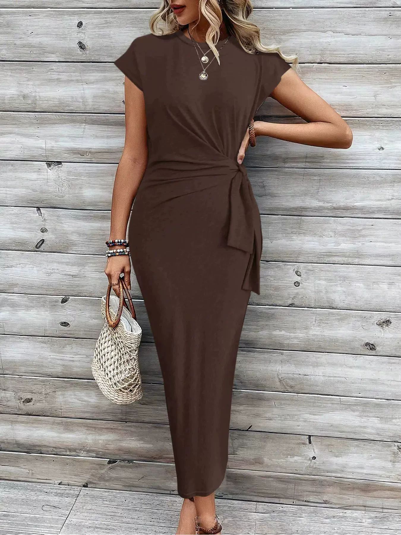 2025跨境气质优雅腰部绑带条纹圆领短袖长款连衣裙夏女高级感女装