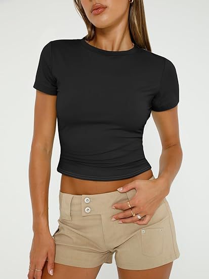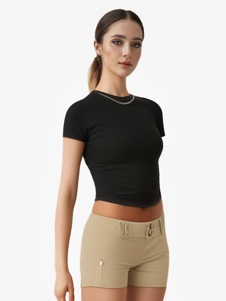 欧美夏季女式套头t恤辣妹外穿修身上衣时尚圆领高级感牛奶丝女装