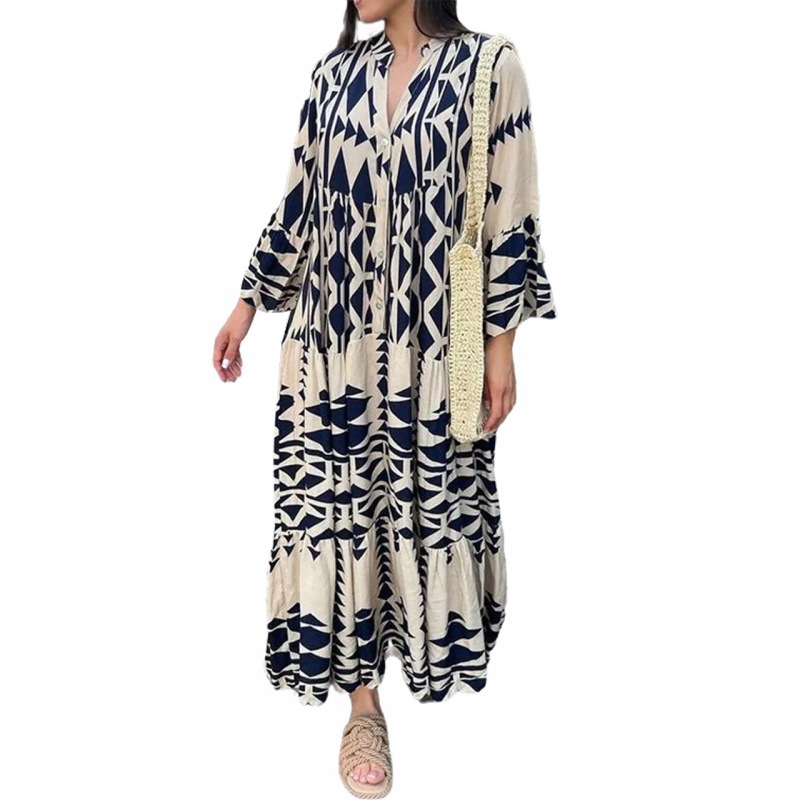 2023跨境大码欧美女装亚马逊秋季新款套头印花波西米亚连衣裙女