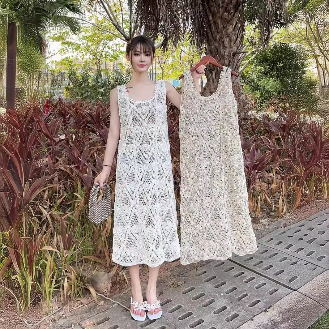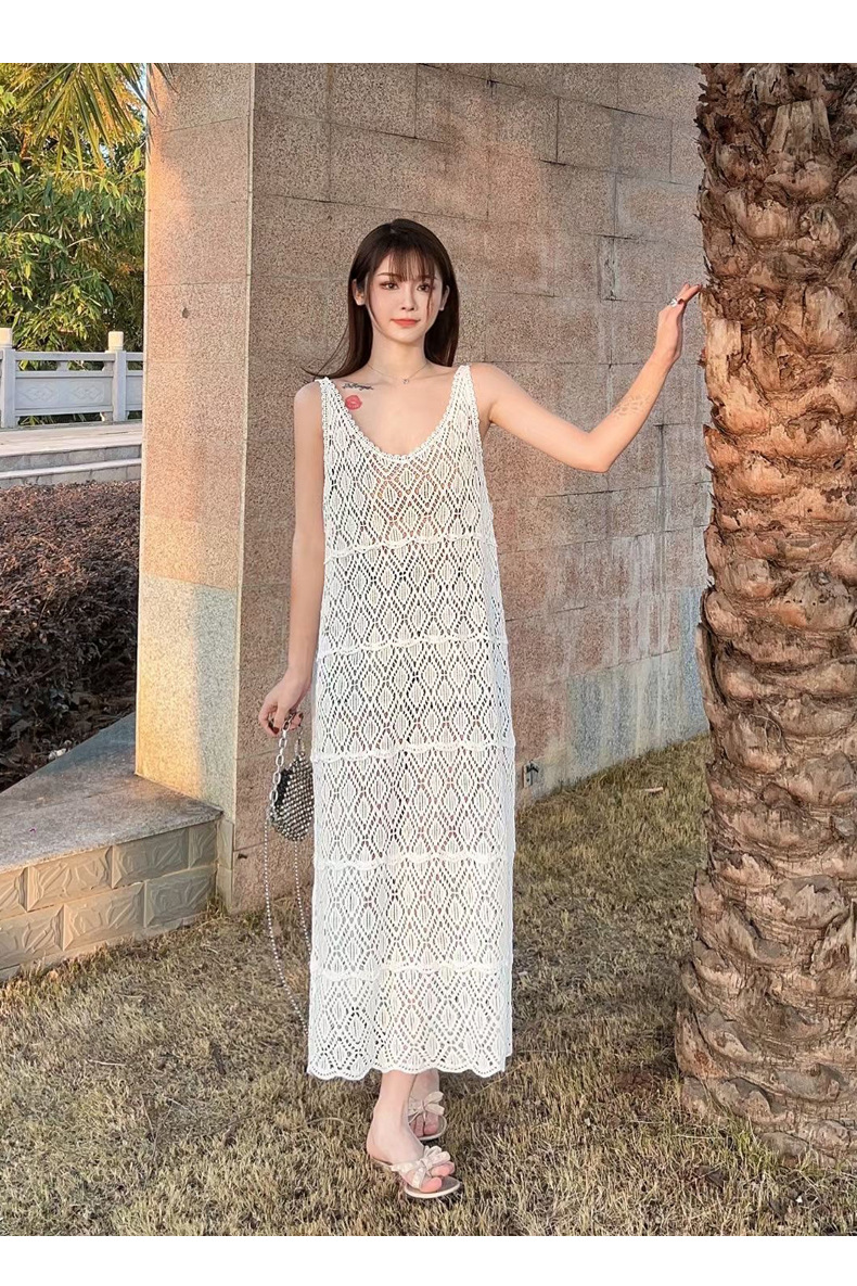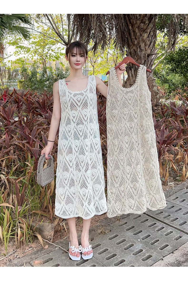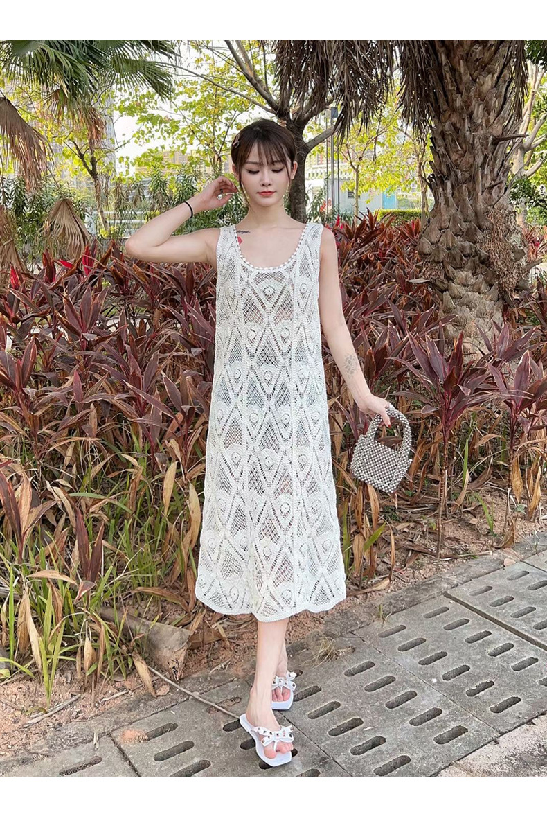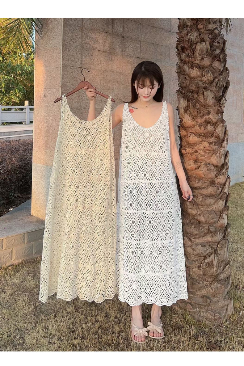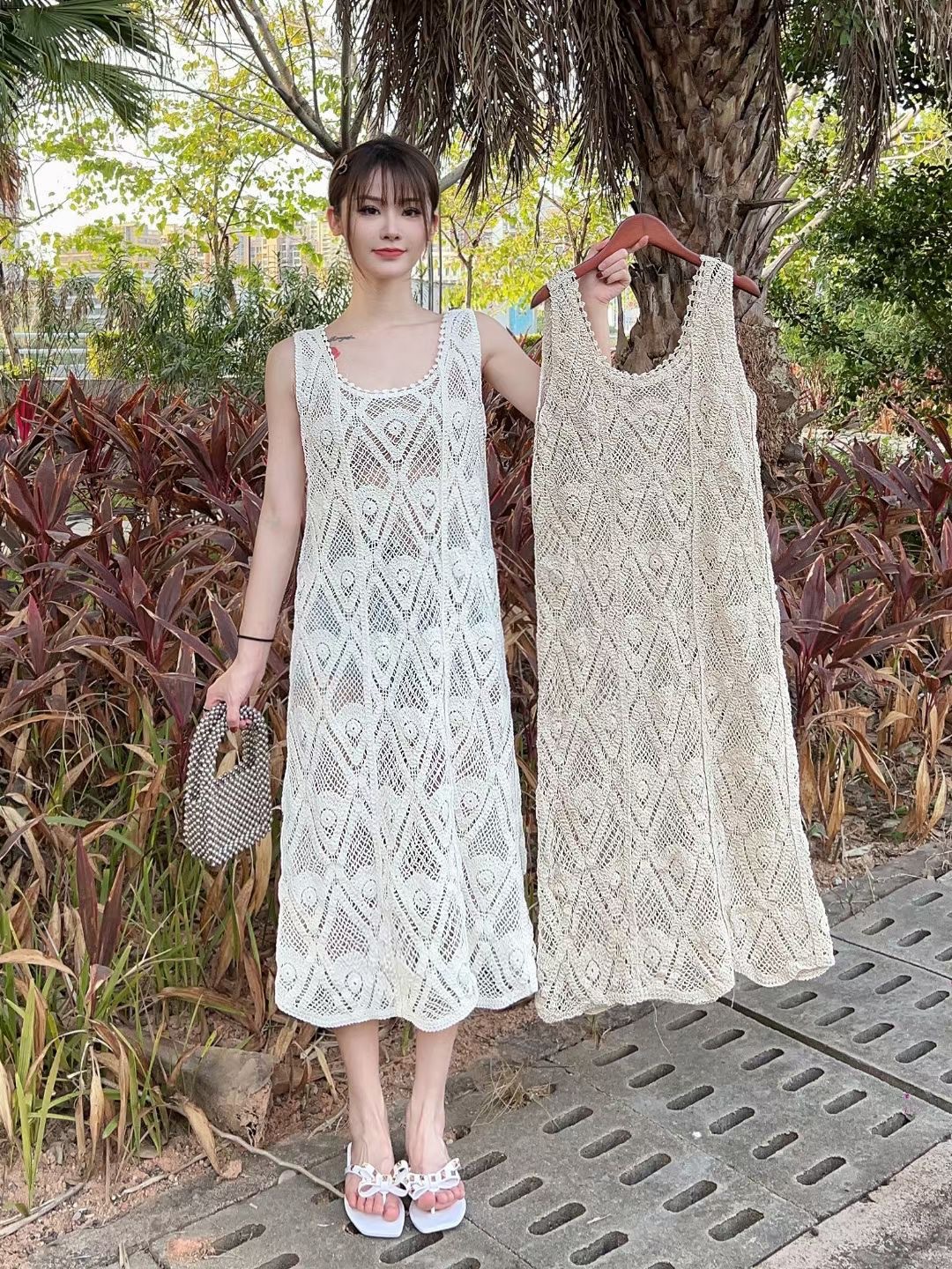 2025镂空罩衫针织吊带连衣裙女夏宽松叠穿罩衫海边度假无袖背心裙