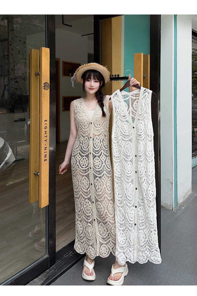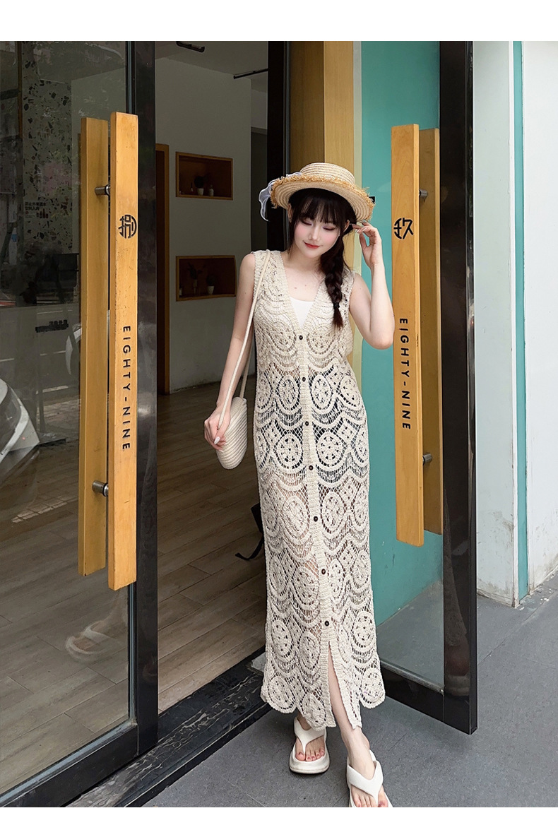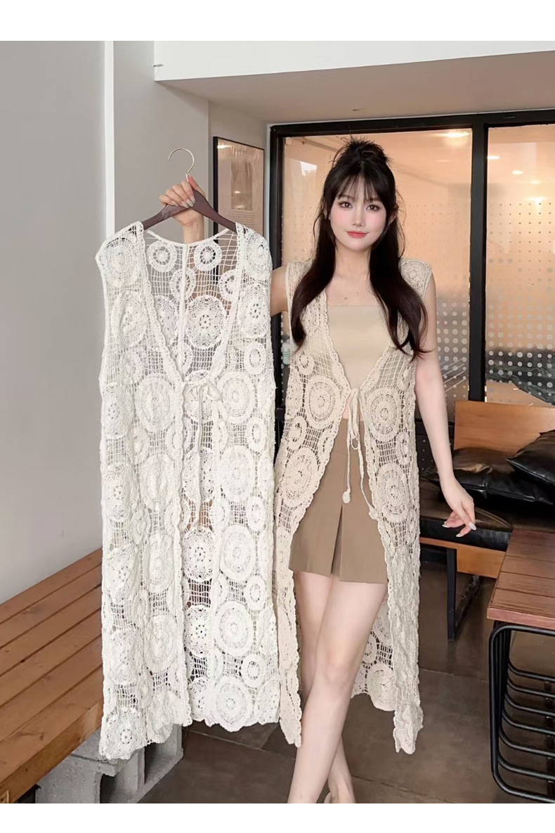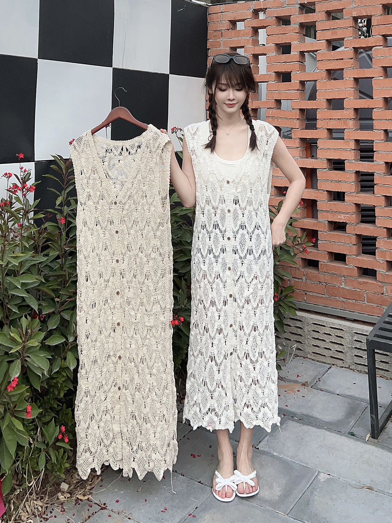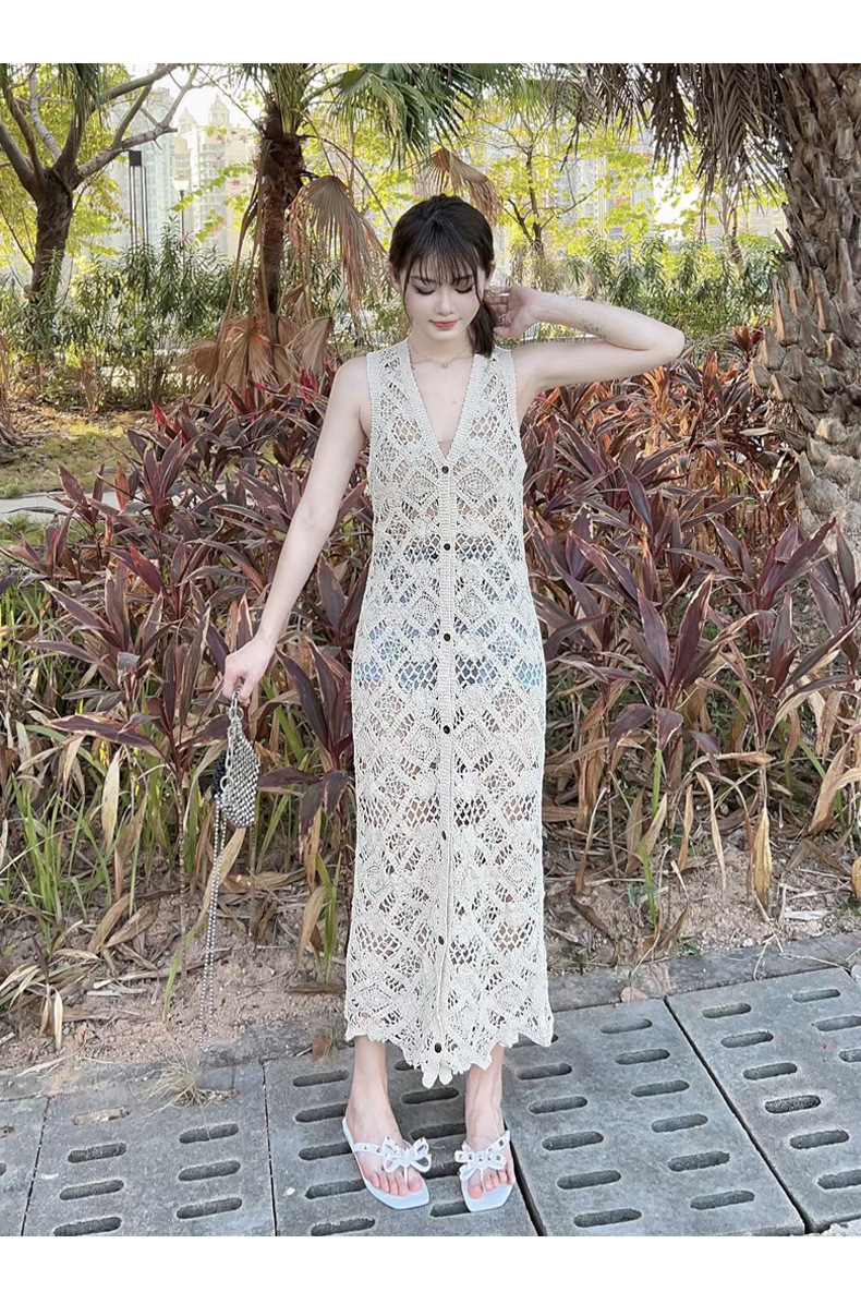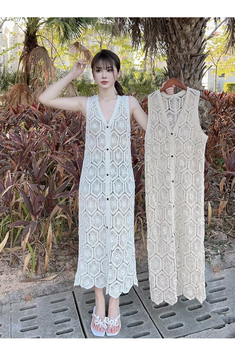 2025镂空罩衫针织吊带连衣裙女夏宽松叠穿罩衫海边度假无袖背心裙
